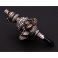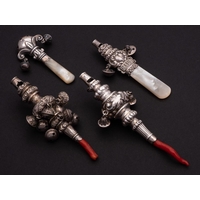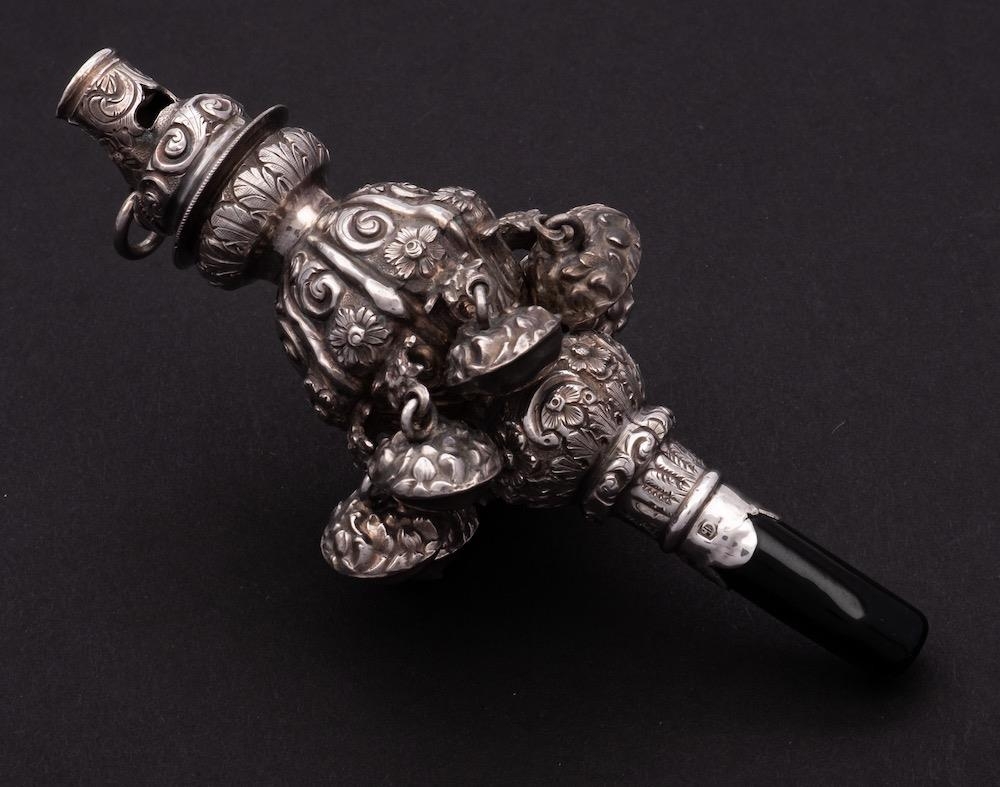 A Victorian silver child's rattle, maker Francis Clark, Birmingham, 1837: with whistle , knopped cylindrical body with embossed foliate decoration, eight bell suspensions to one knop and partial black coral teether, 12cm. long.