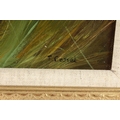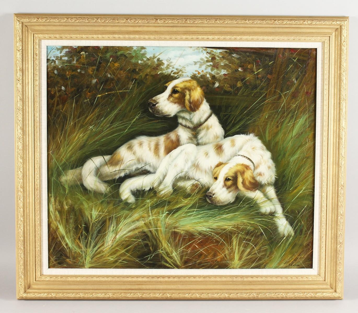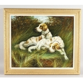 20th century school, A study of two working dogs resting on a bank, oil on canvas, indistinctly signed, 20" x 24".