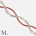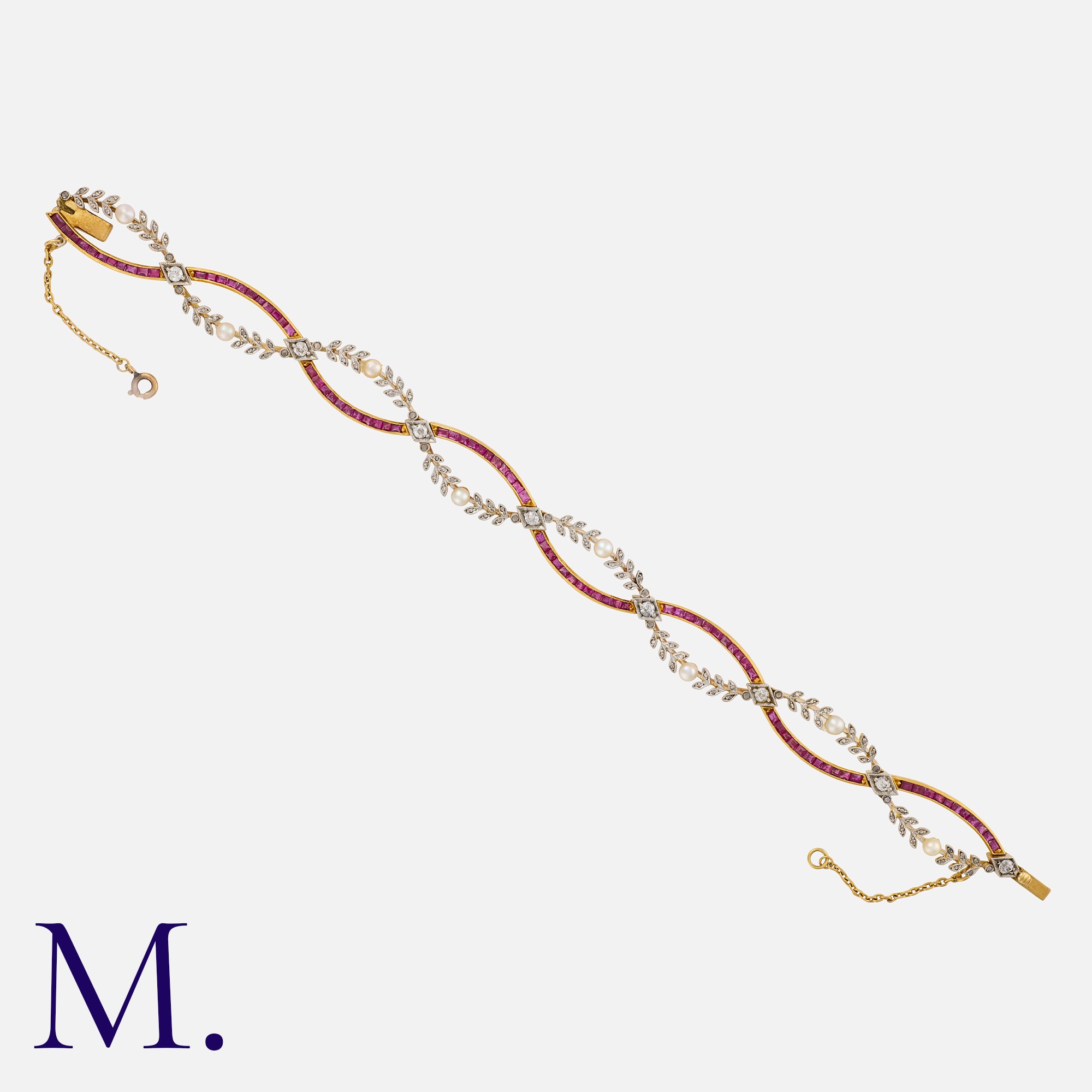 A Fine Art Nouveau Ruby Pearl and Diamond Bracelet in 18 carat yellow gold and platinum, comprising two undulating, intertwined rows, one set with calibre cut rubies, the other of foliate design set with old cut, rose cut diamonds and pearls. Unmarked, tests indicate 18 carat gold.