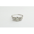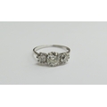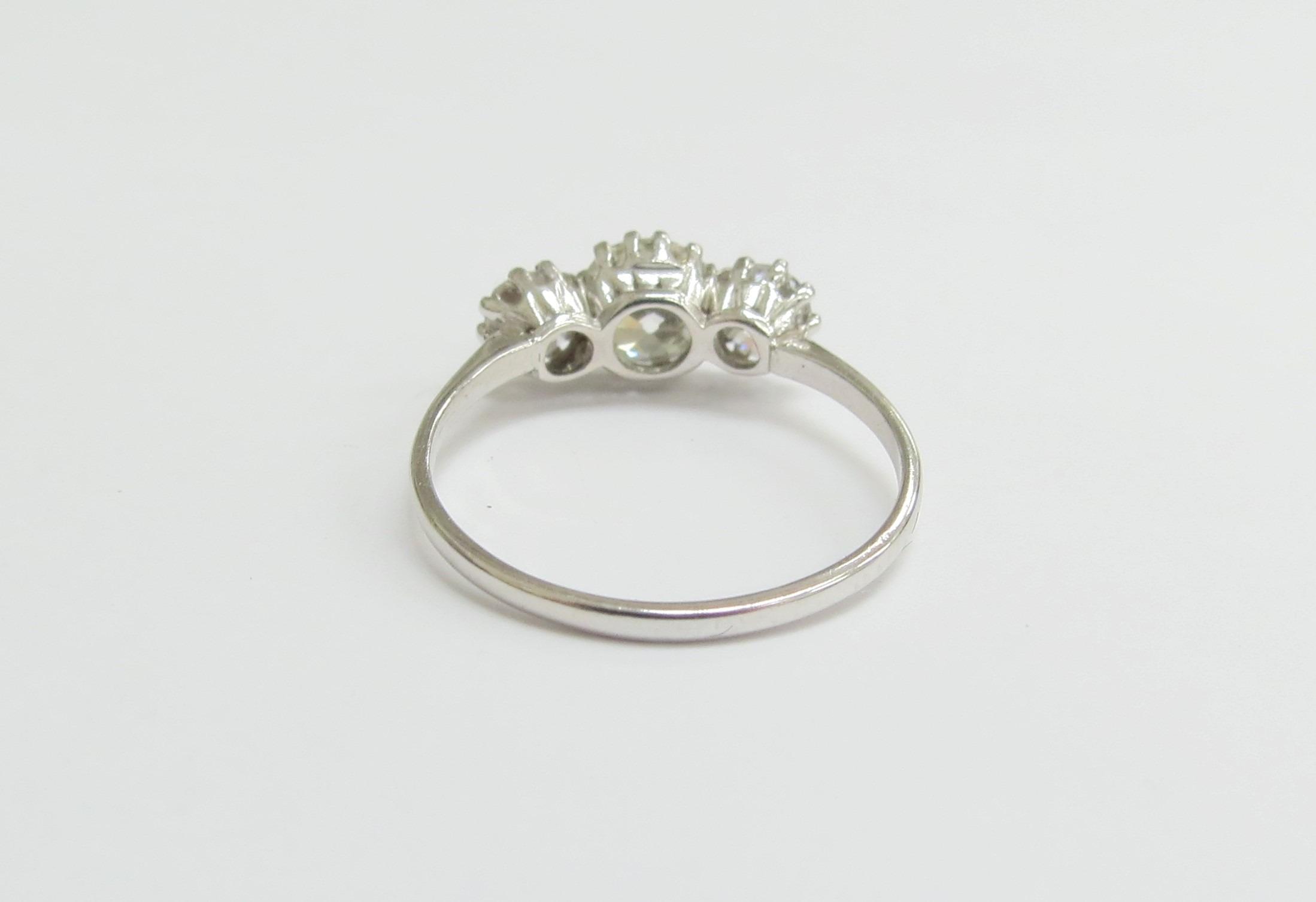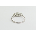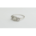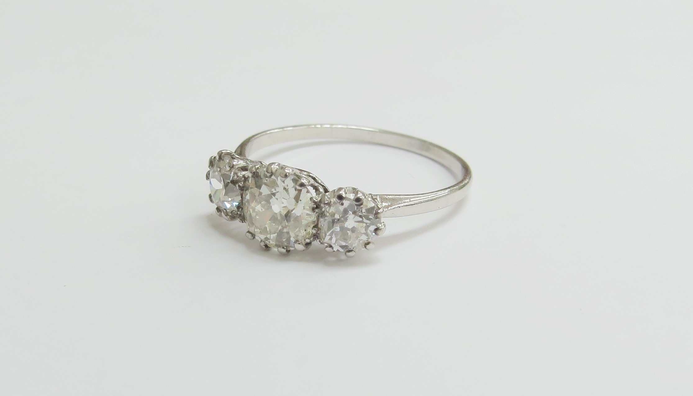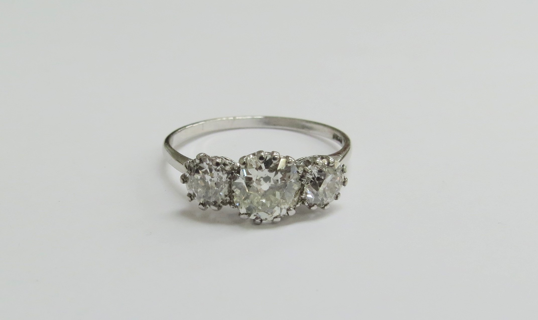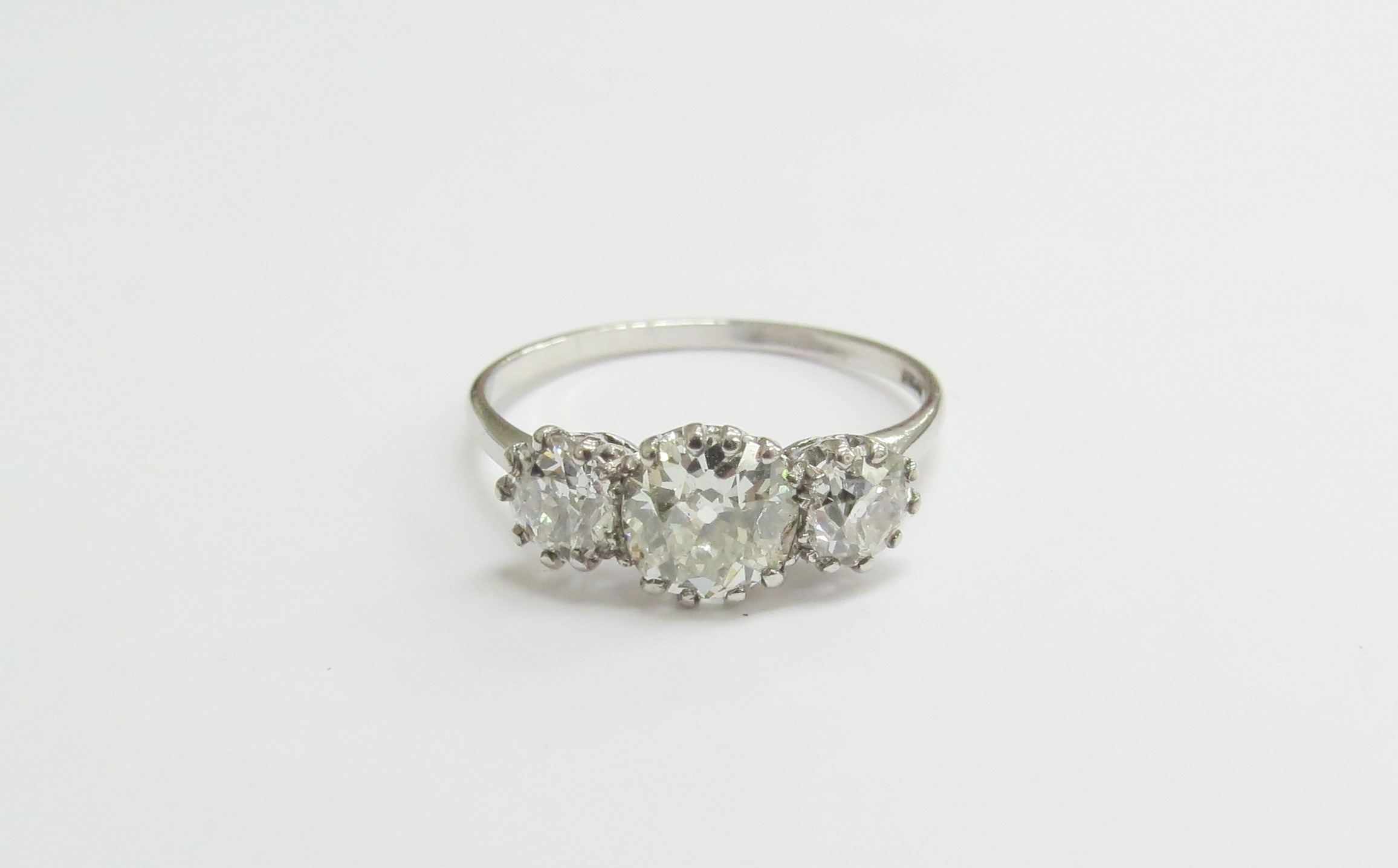 A platinum three stone diamond ring, 1.70ct total approx. Size R, 2.9g