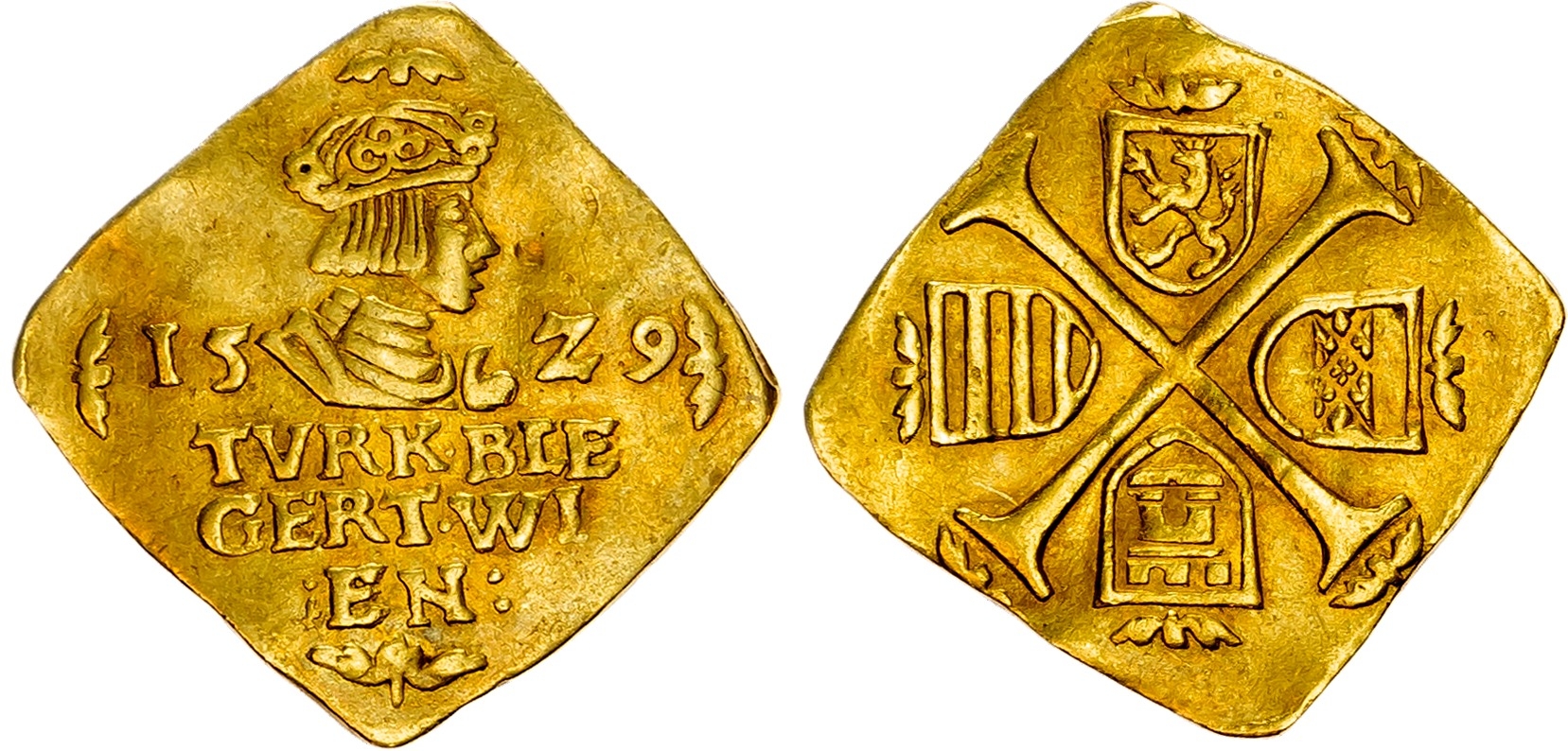 Austria, Holy Roman Empire, Ferdinand I (1521-1564), gold Dukat Klippe, Siege of Vienna, 1529, Vienna mint, crowned and armoured bust, arabesques at cardinal points. Rev. Long cross pattée; in quarters coats-of-arms of Niederösterreich, Castile, Hungary, and Bohemia, arabesques at cardinal points, 3.54g (Fr. 22; Markl 278). Good Very Fine, slightly wavy flan, small dig in the field on obverse and minor hairlines to surfaces. Rare piece from one of the most famous sieges in history of the Ottoman Empire and Habsburg Empire that lasted 19 days. Struck by mintmaster Thomas Beheim during the Siege of Vienna by the forces of Ottoman Sultan Suleyman the Magnificent, which lasted from 27th September to 15th October 1529. An impressive piece in terms of rarity and quality as repairs and traces of mounting are often found on this type. The Austrians with an impromptu collaboration of the city's population and European mercenaries, fortified the city around St. Stephen's Cathedral and prepared for a long siege. The treasures of Vienna's churches were used to strike this emergency issue in order to pay the mercenaries sent by the Holy Roman Emperor.