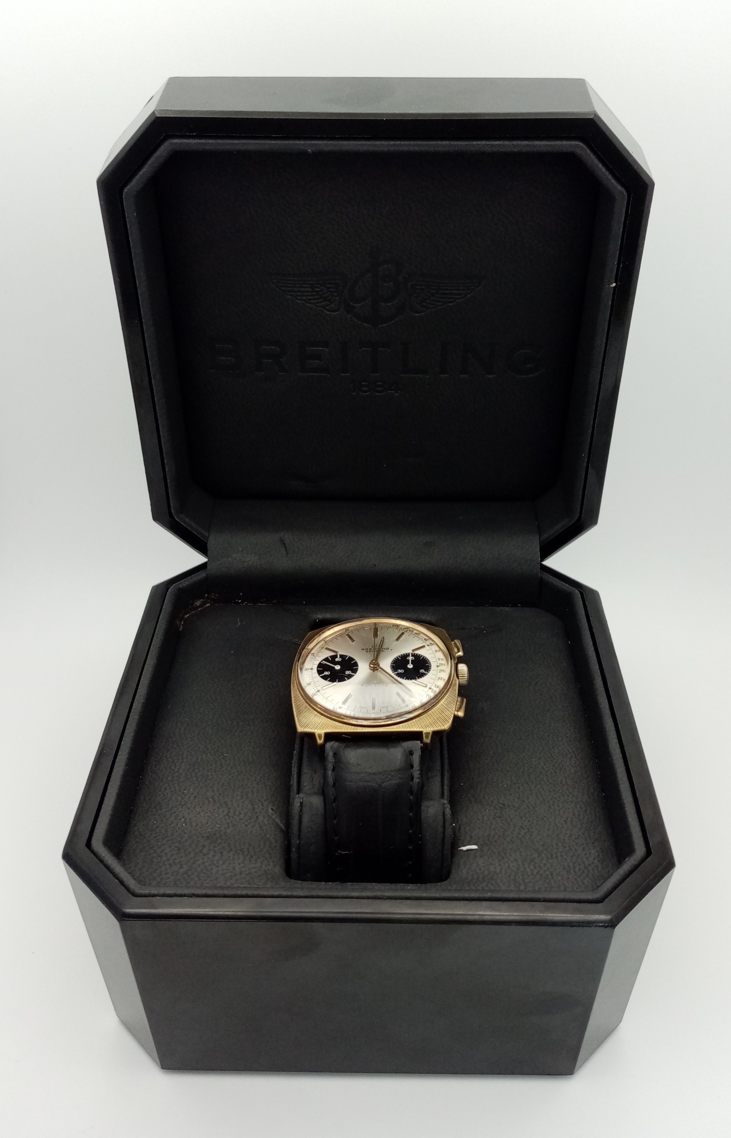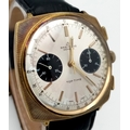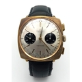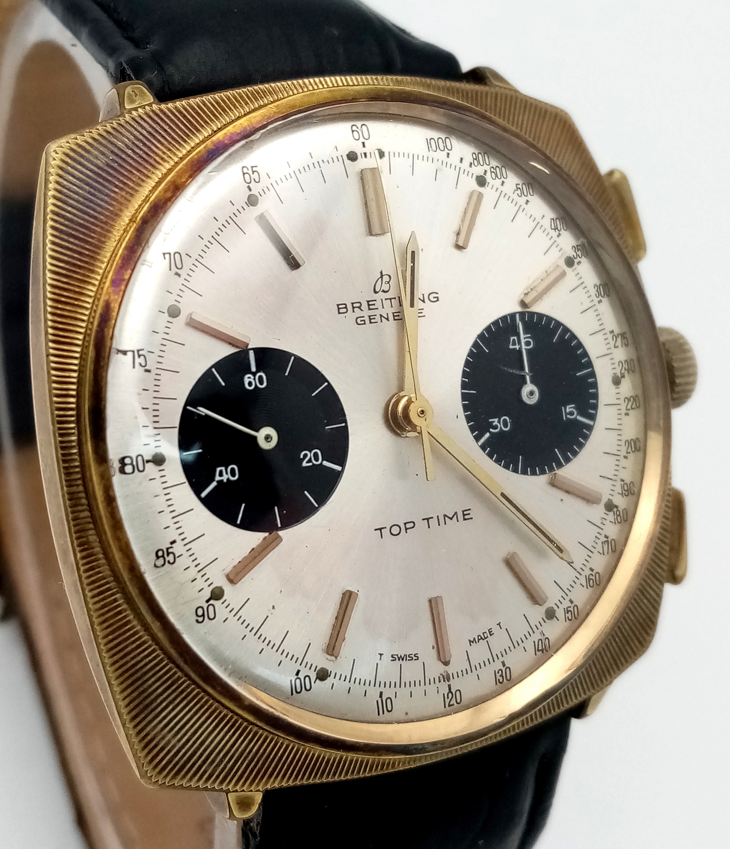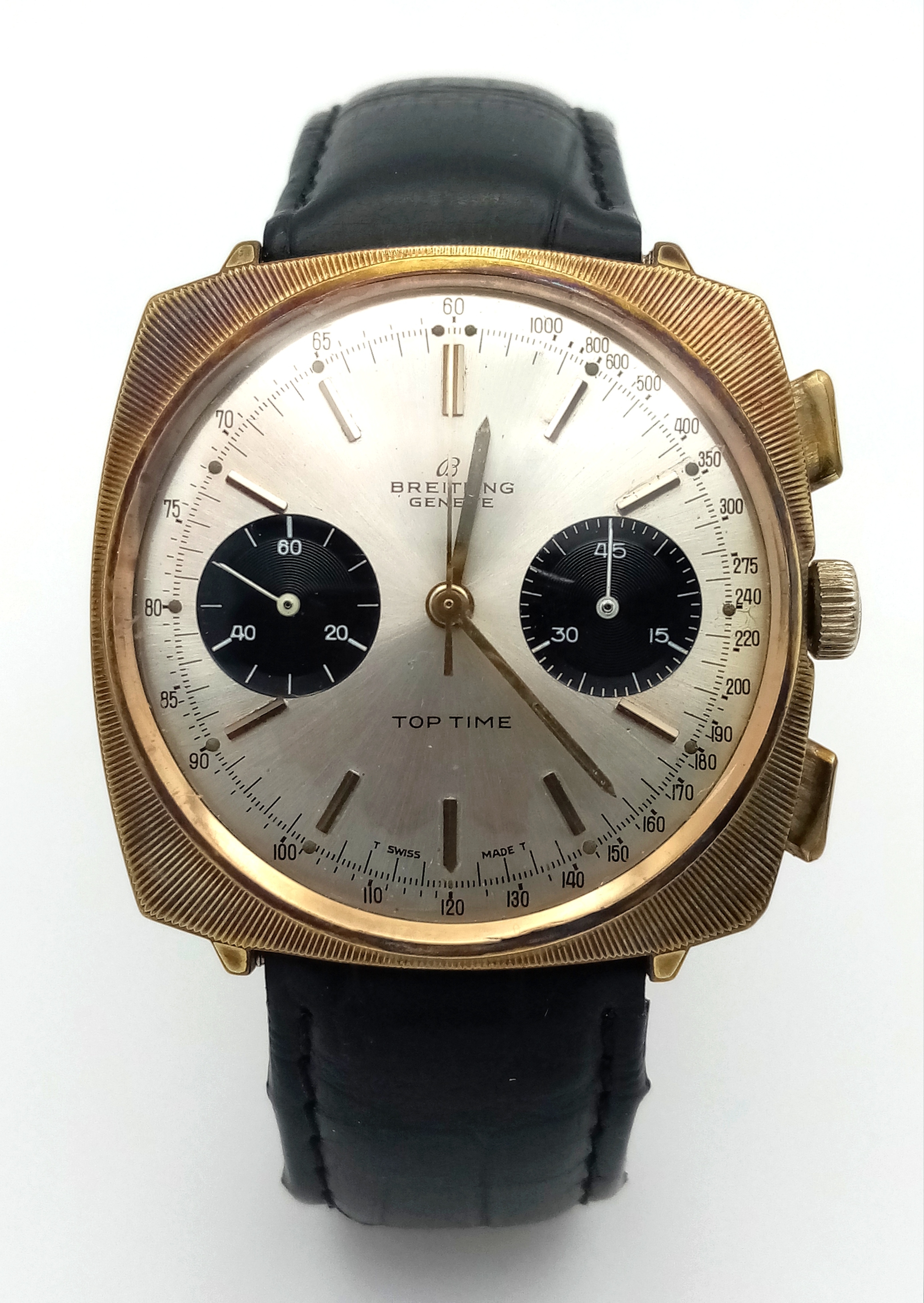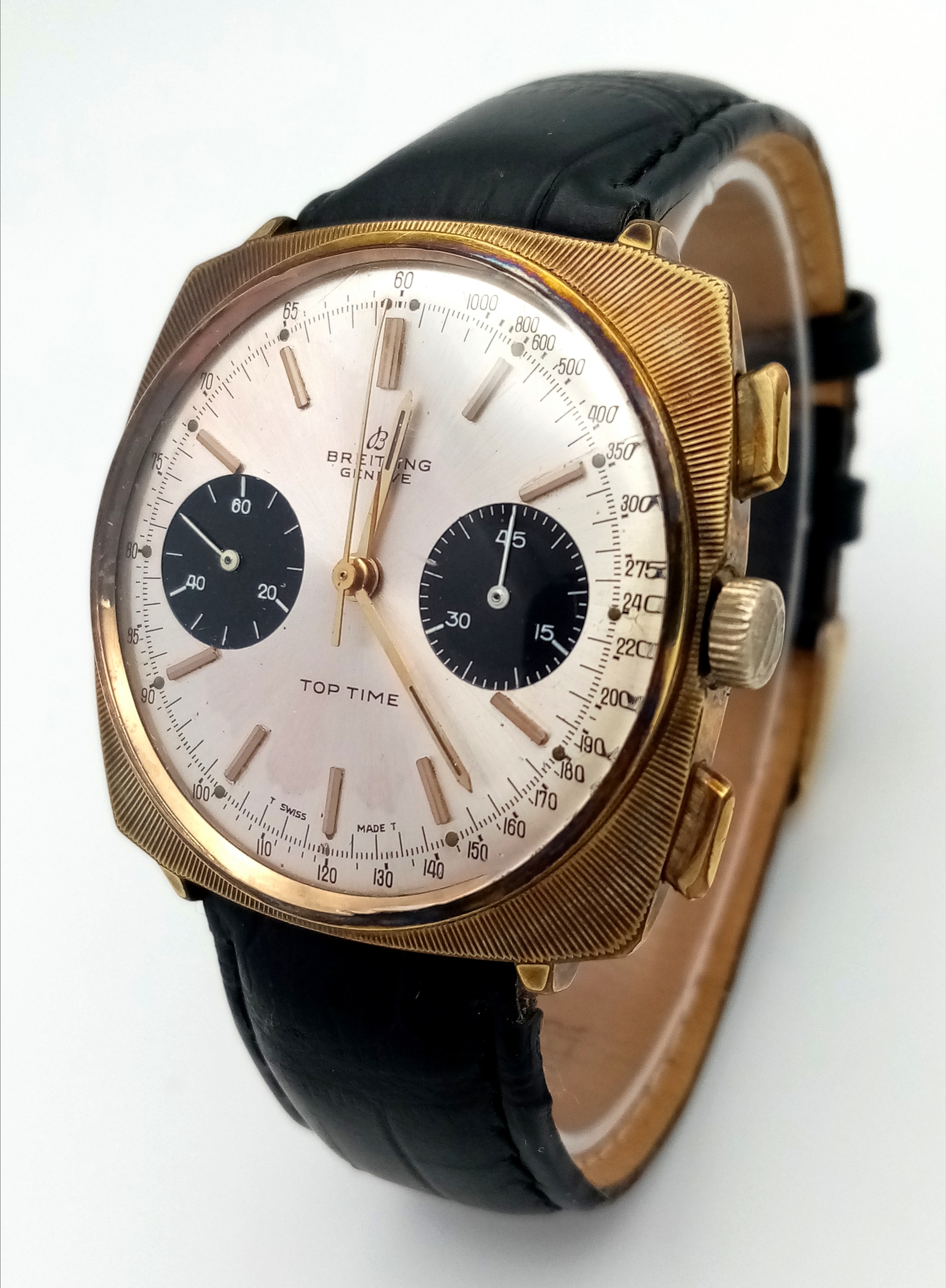 A Vintage Breitling Top Time Gents Chronograph Watch. Black leather strap. Gilded case - 39mm. Silver tone dial with two sub dials. Mechanical hand-wind movement. In working order.