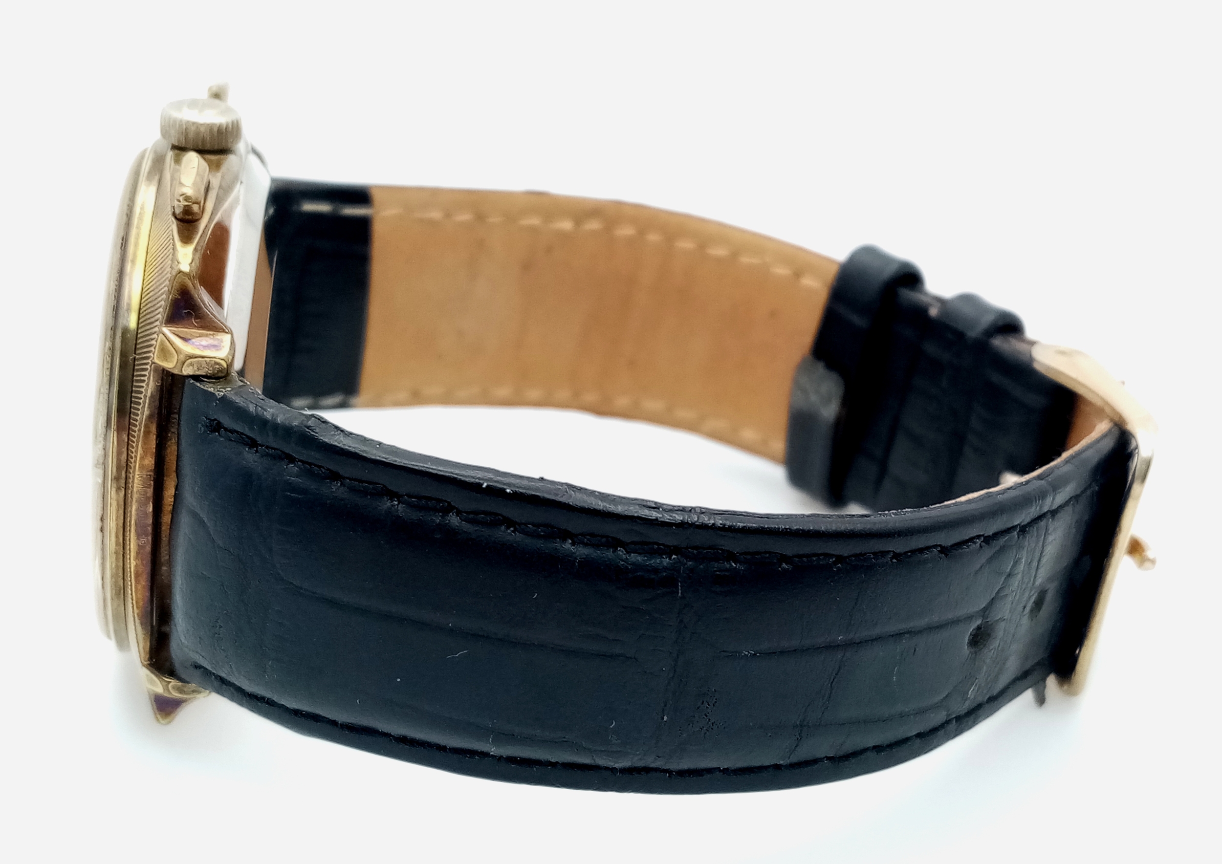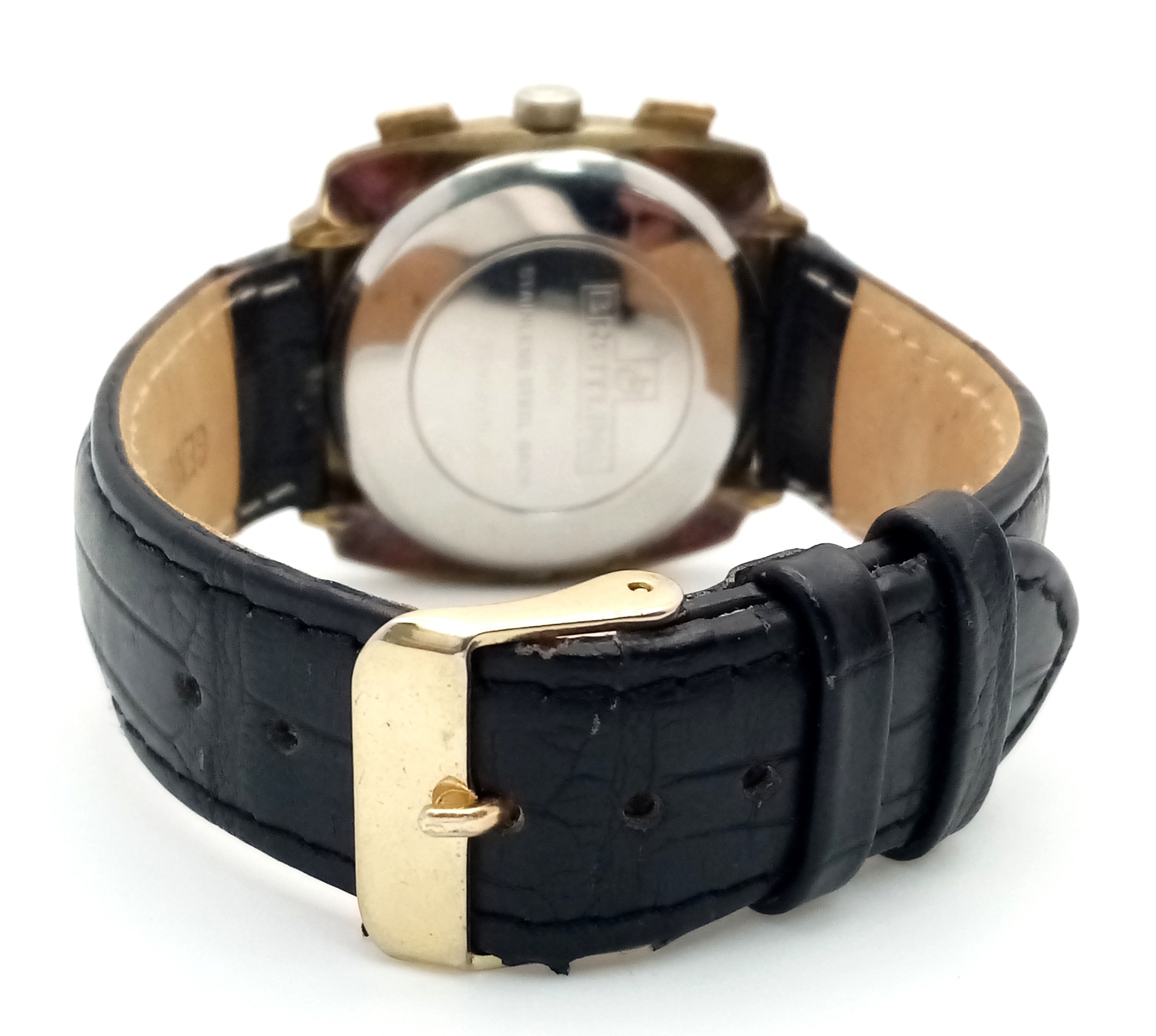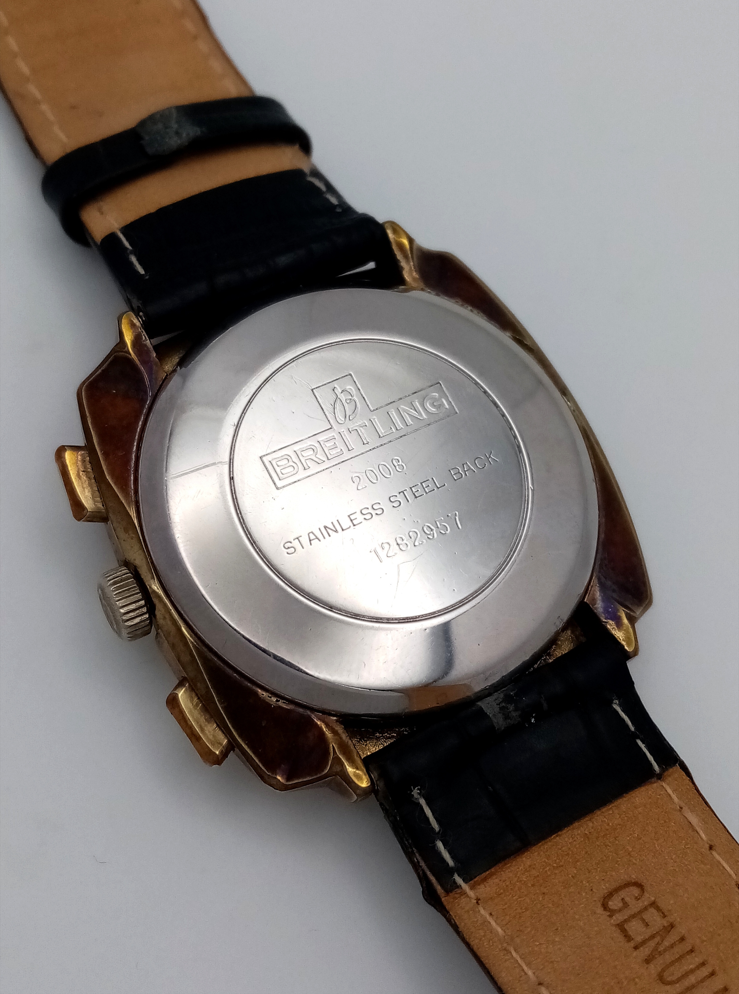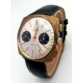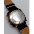 A Vintage Breitling Top Time Gents Chronograph Watch. Black leather strap. Gilded case - 39mm. Silver tone dial with two sub dials. Mechanical hand-wind movement. In working order.