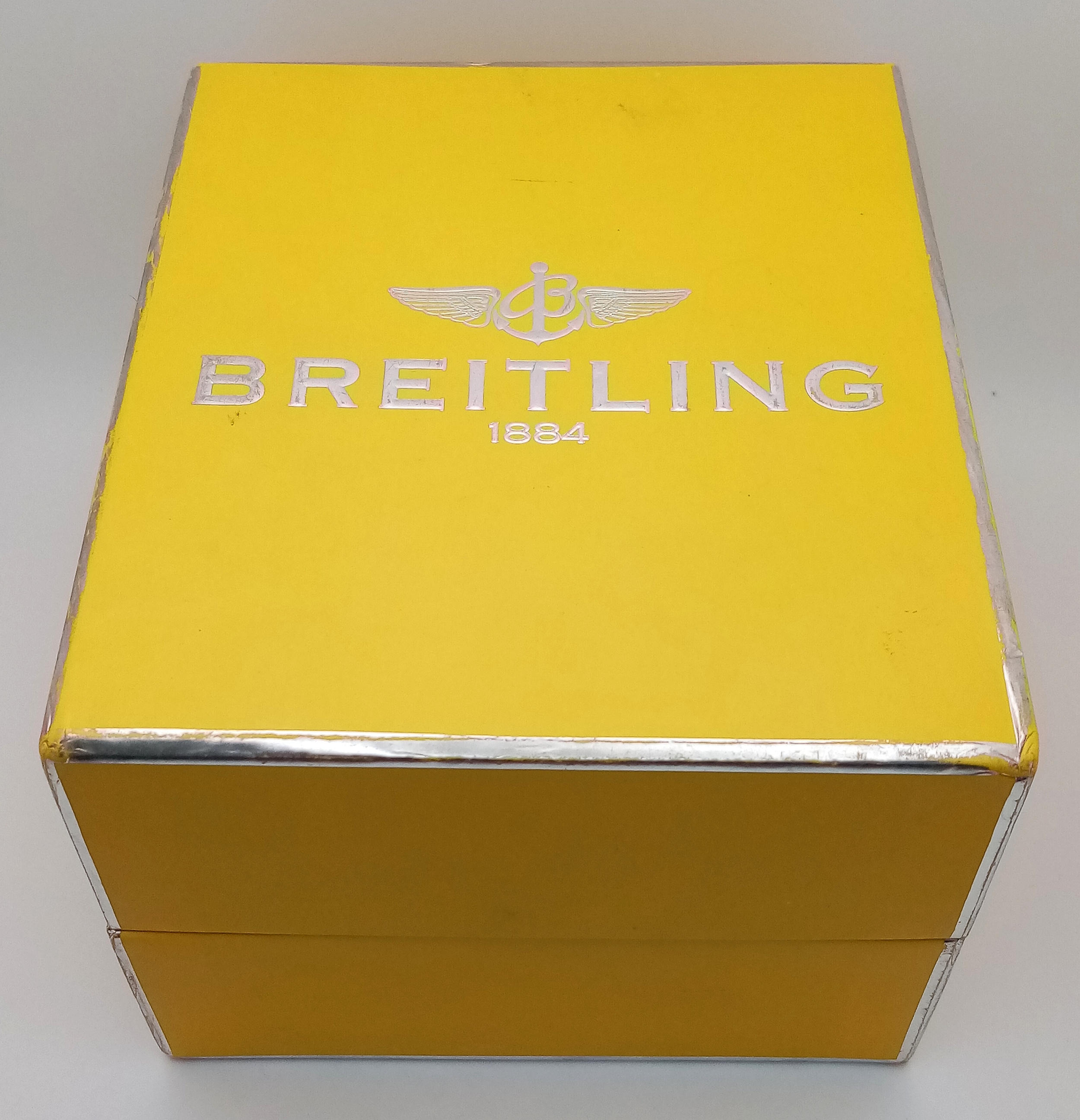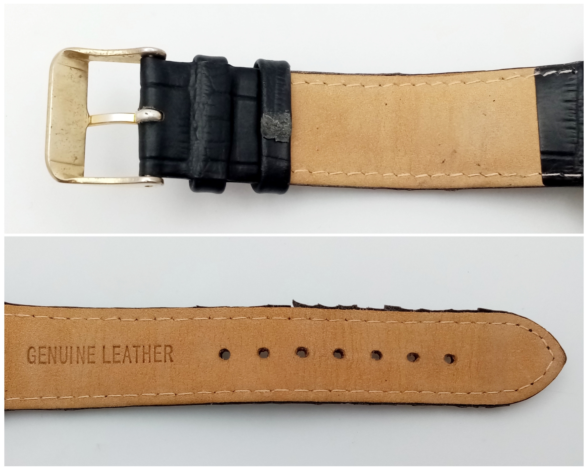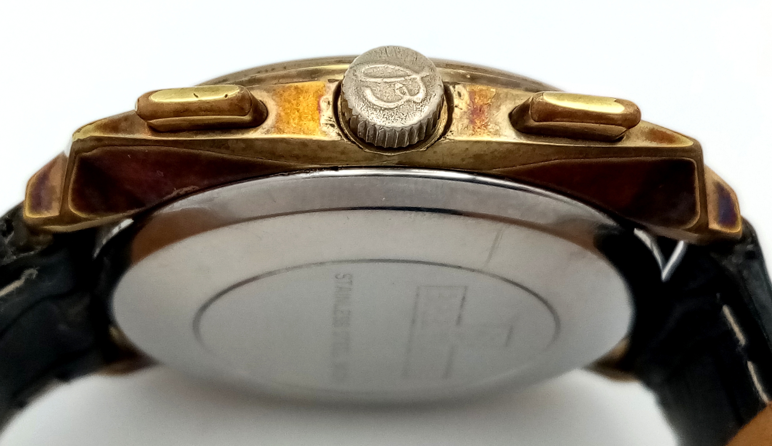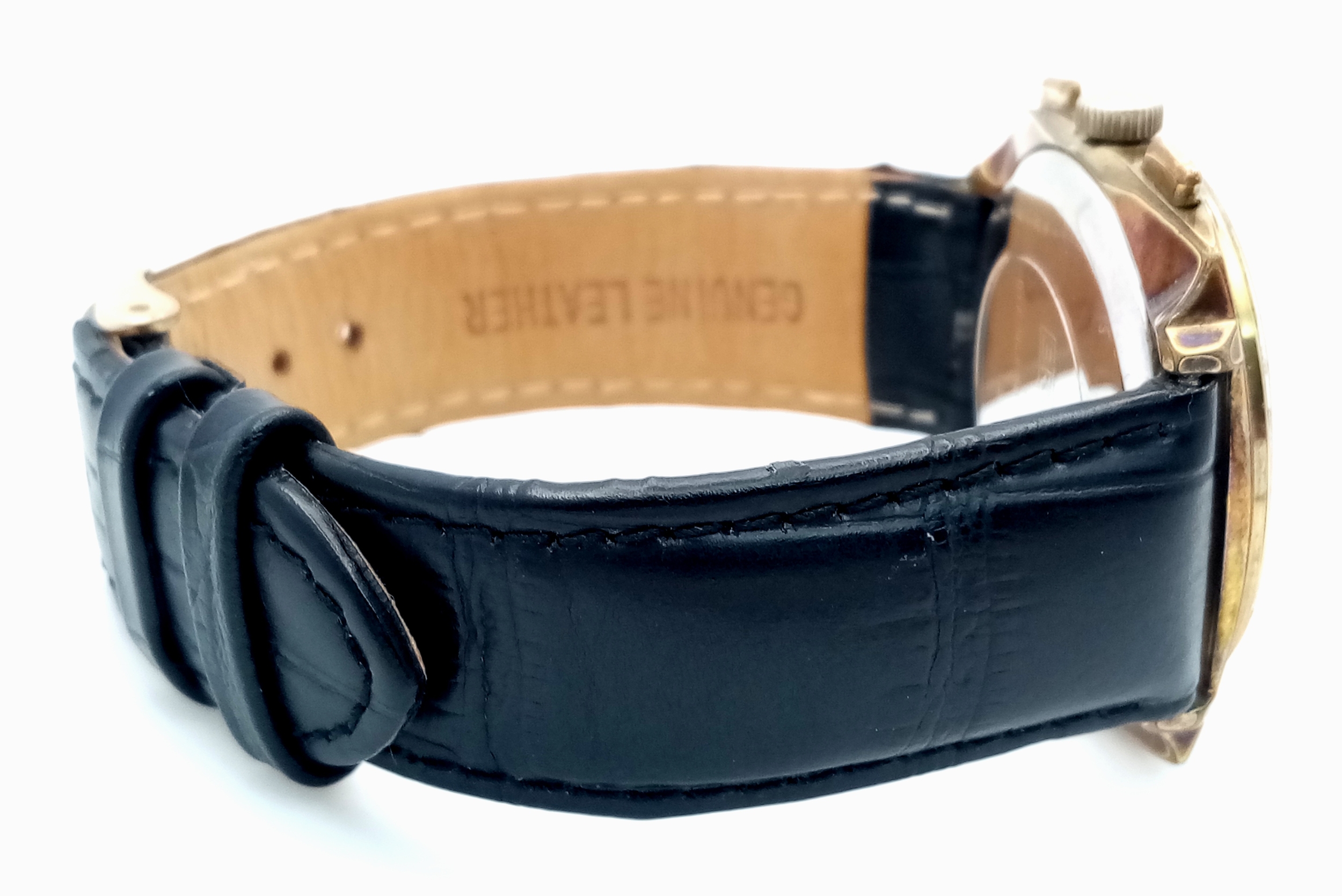 A Vintage Breitling Top Time Gents Chronograph Watch. Black leather strap. Gilded case - 39mm. Silver tone dial with two sub dials. Mechanical hand-wind movement. In working order.