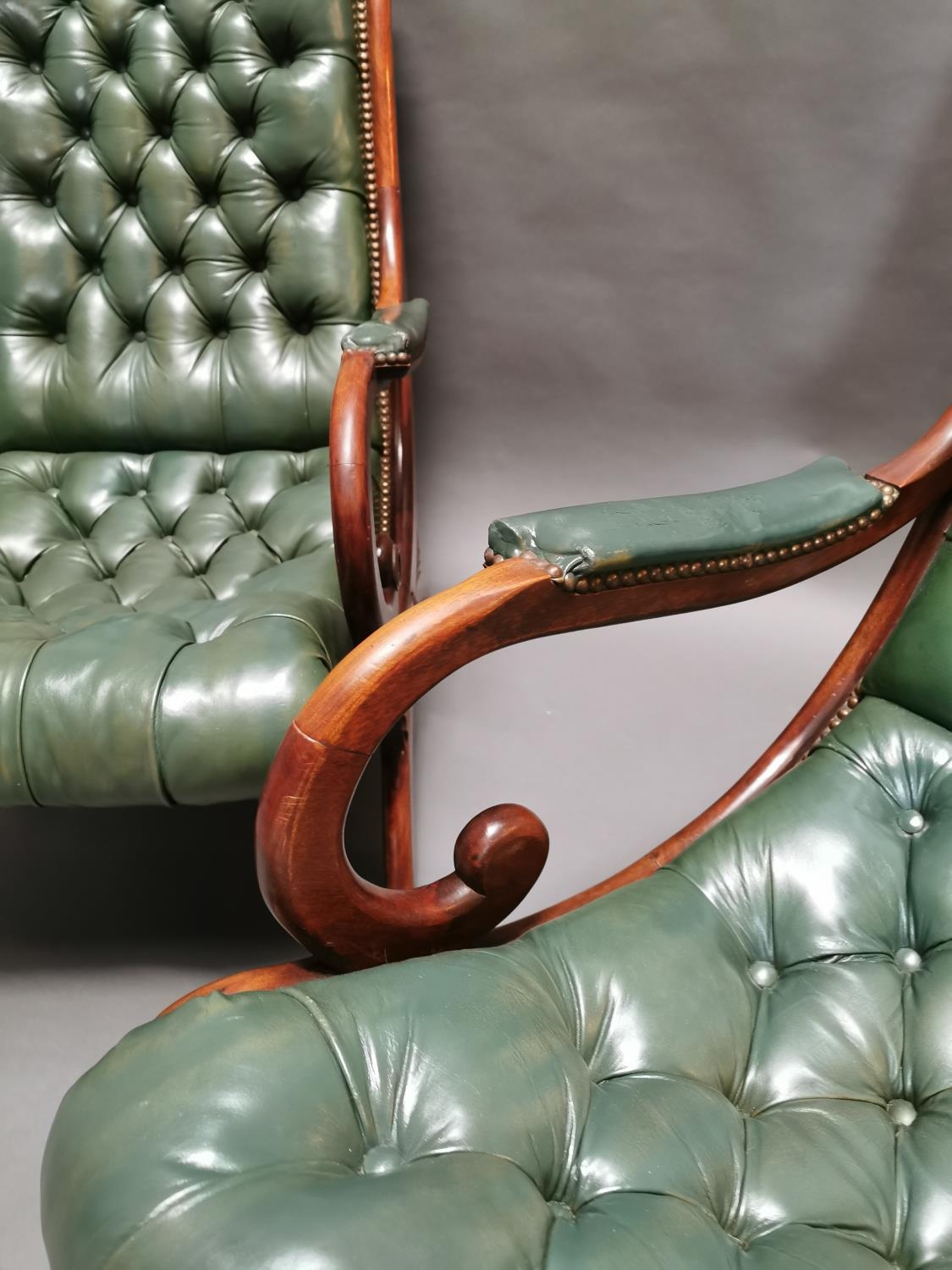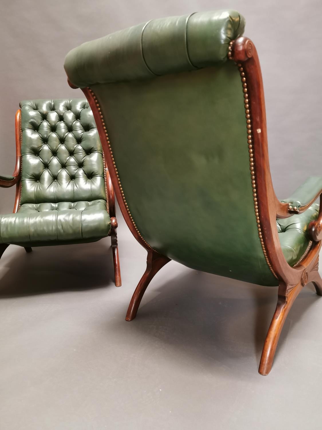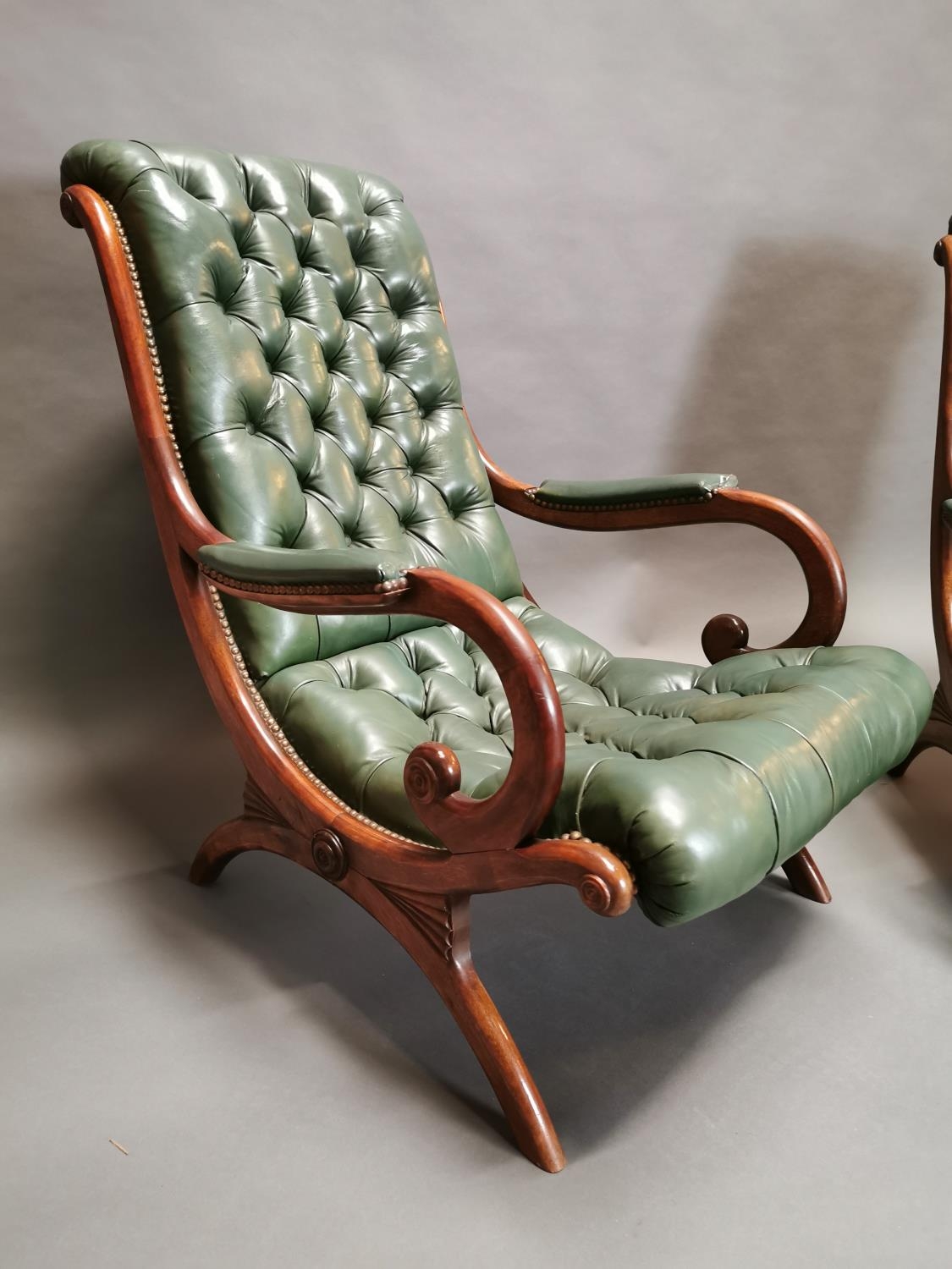 Pair of good quality deep buttoned leather and mahogany library chairs {80 cm H x 53 cm W x 80 cm D}.