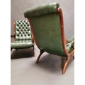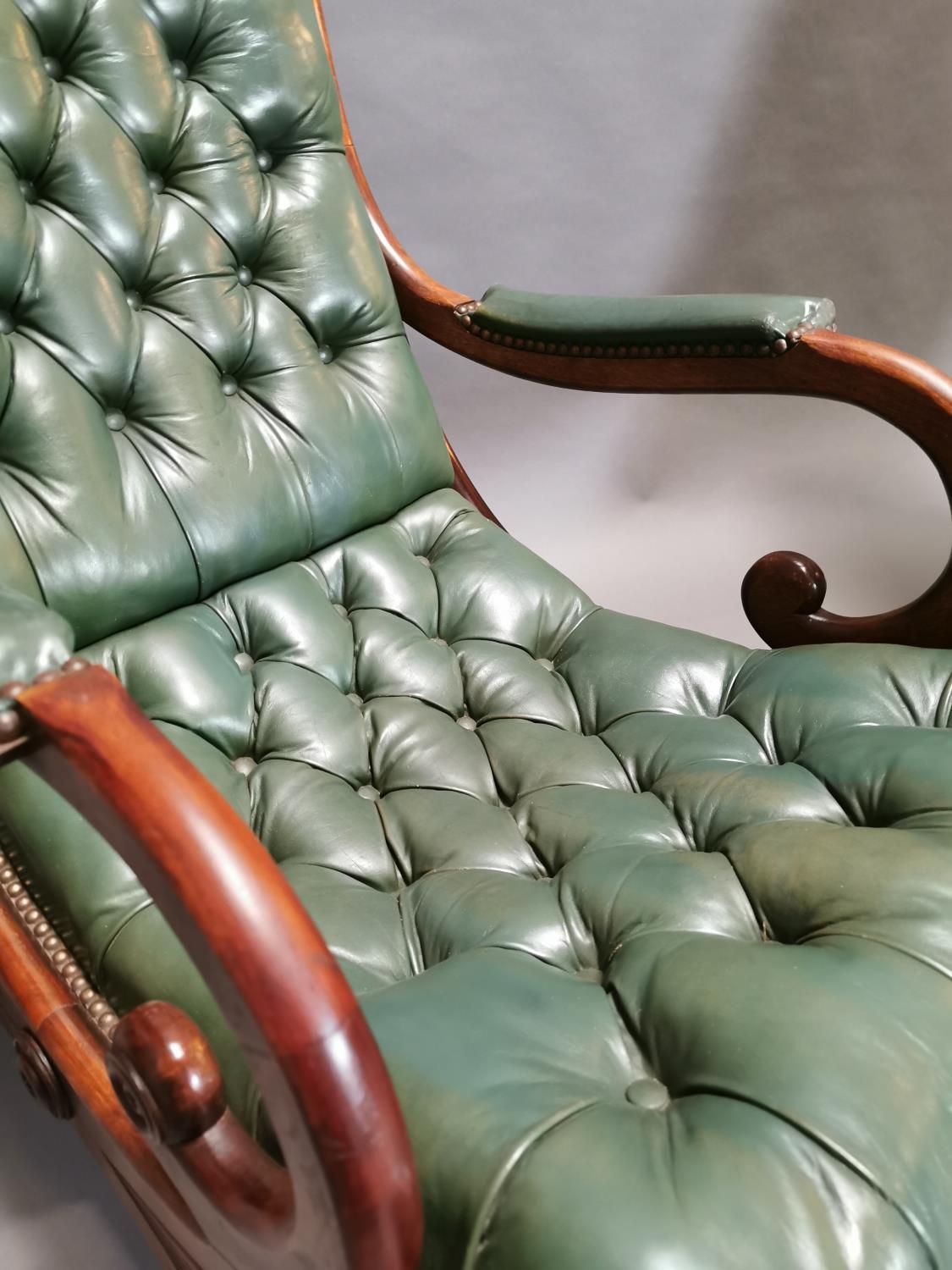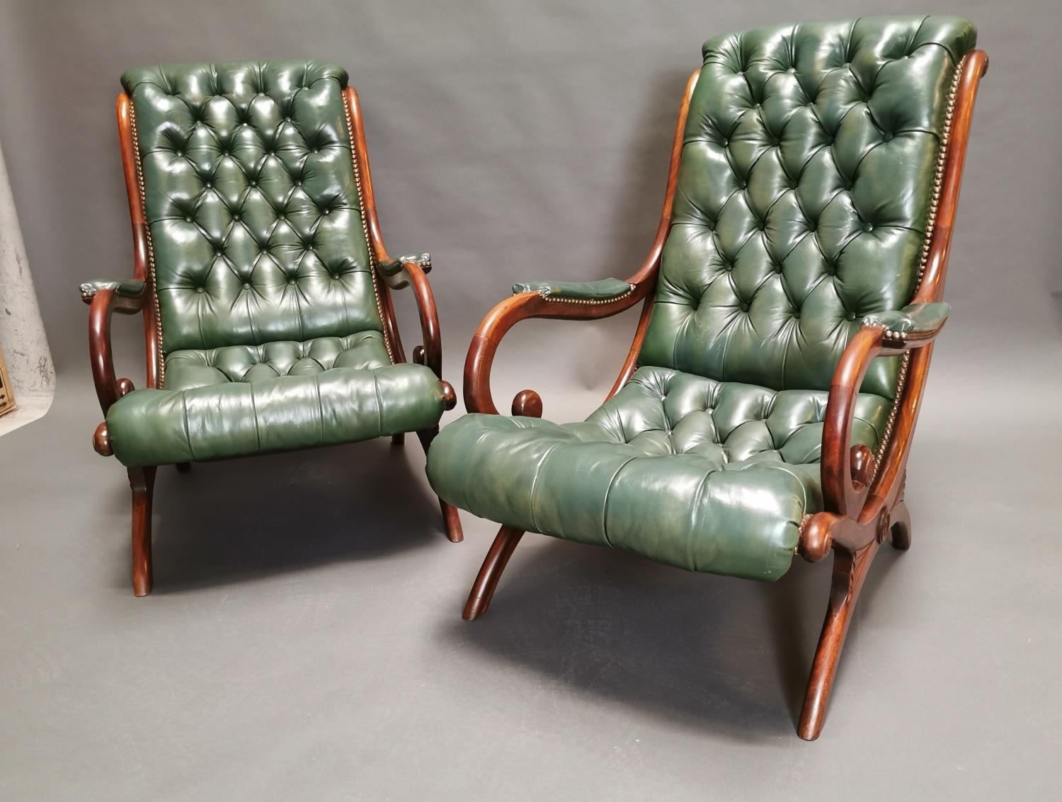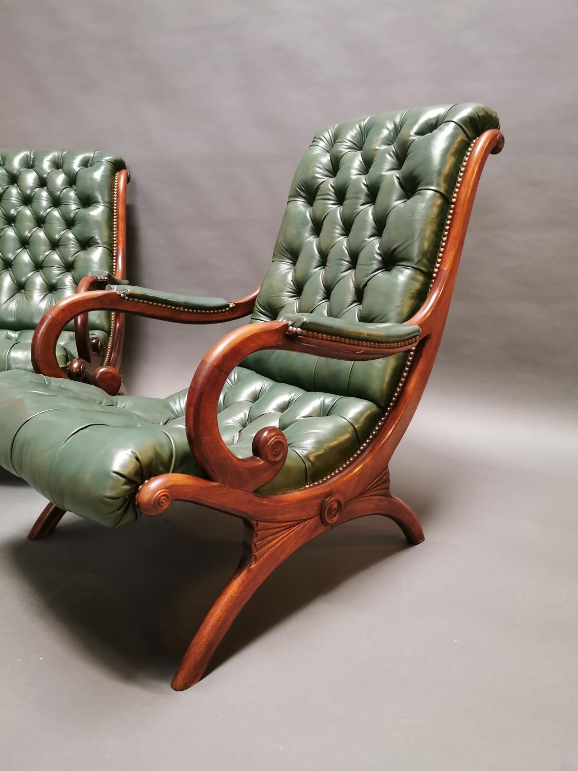 Pair of good quality deep buttoned leather and mahogany library chairs {80 cm H x 53 cm W x 80 cm D}.