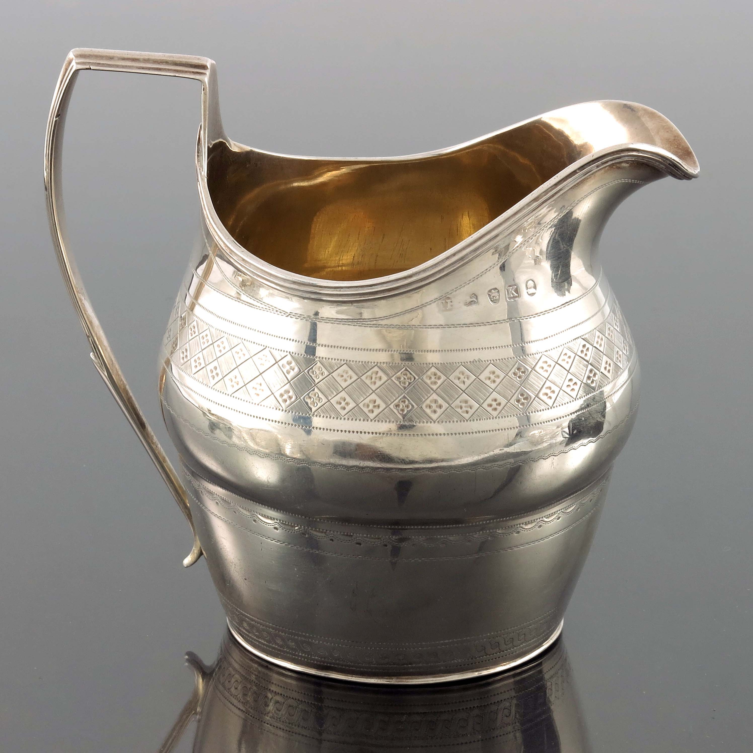 A George III silver jug, Thomas Holland, London 1805, ogee helmet form, bright cut engraved with a geometric diaper tiled band between stippled and Neoclassical guilloche borders, reeded strap handle, 11cm high