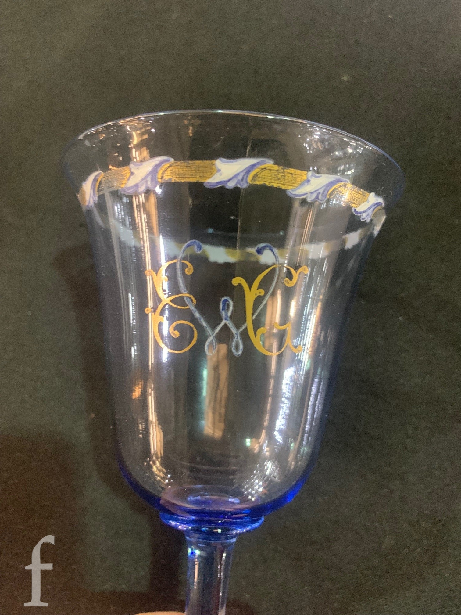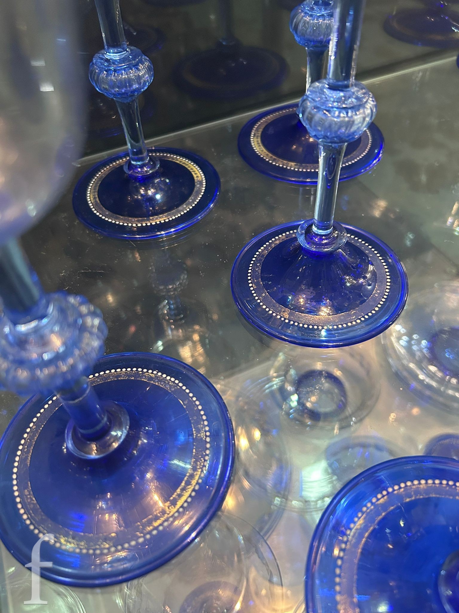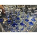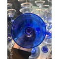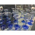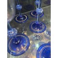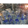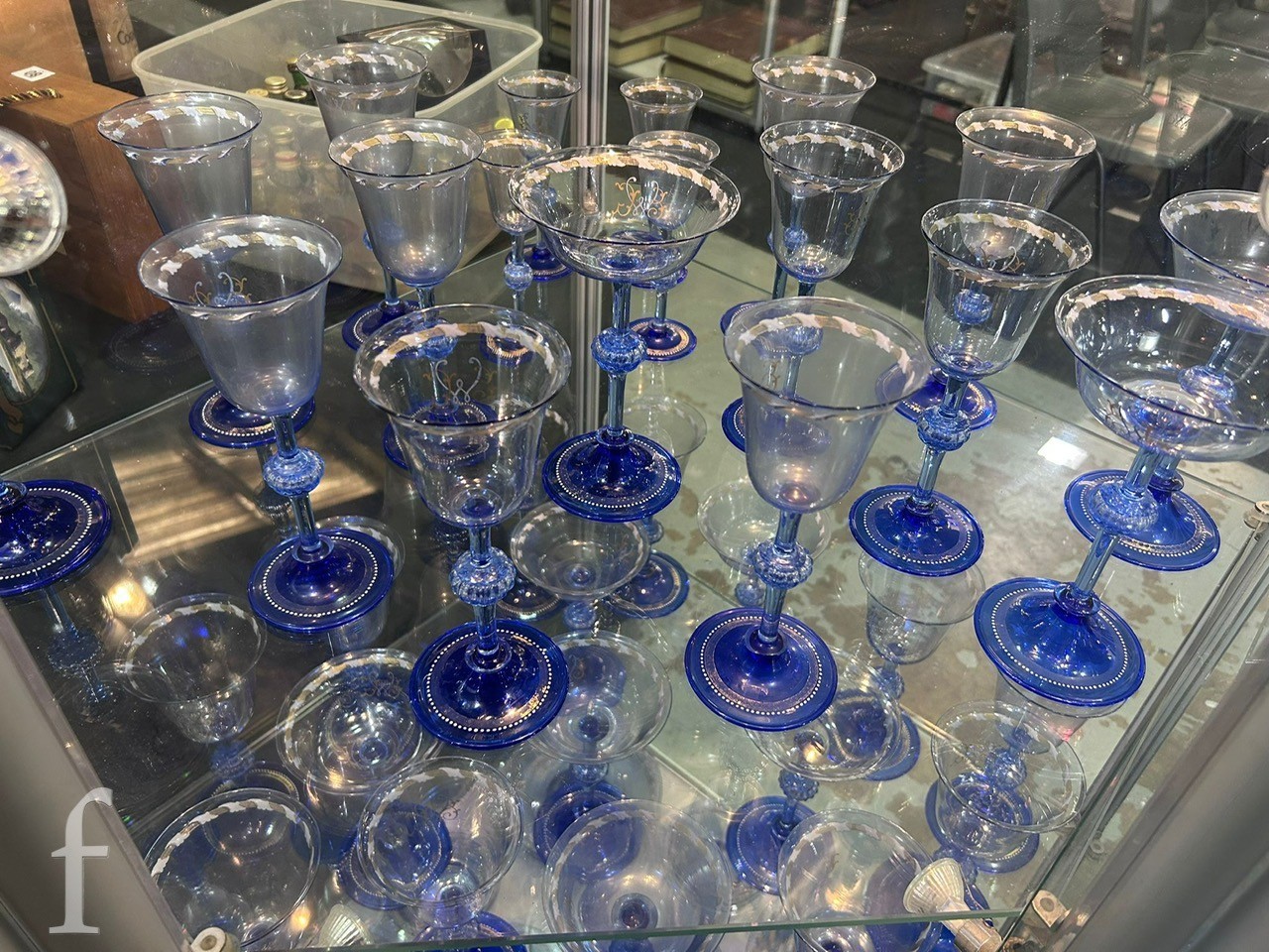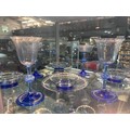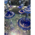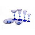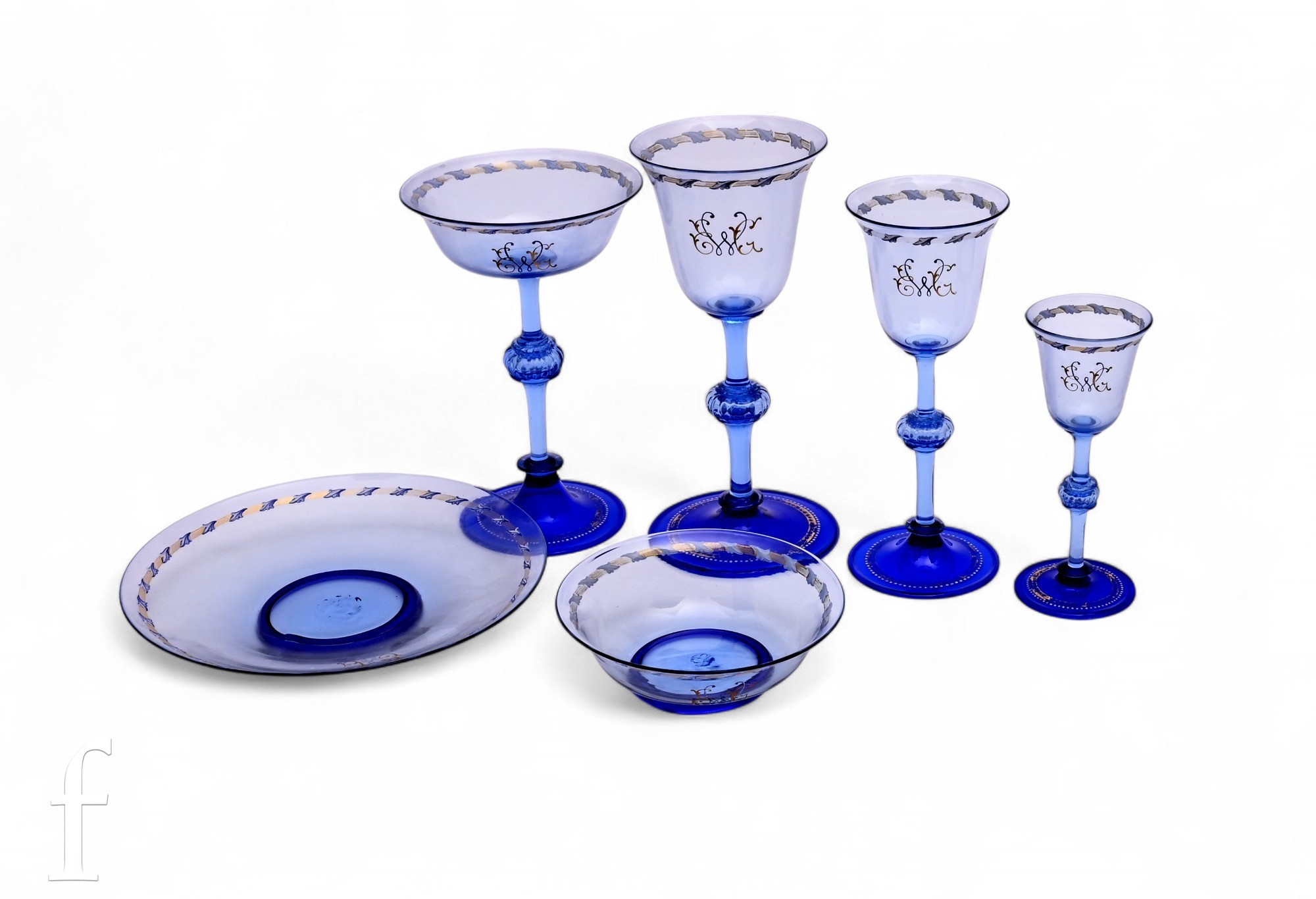 Pauly & C. - Compagnia Venezia Murano - An early 20th Century Italian 'Venetian Revival' extensive suite of stem and tableware, blown blue glass on slender hollow blown wrythen knopped stem and circular foot with folded rim, decorated with gilt band with wound blue and white acanthus leaves and 'EWG' monogram, the foot with gilded band and jewelled enamel border, comprising fifteen wine, fourteen water, fourteen champagne and sixteen port/sherry, tallest 21.5cm, together with eighteen finger bowls and stands, diameter of stand 20cm. (qty)