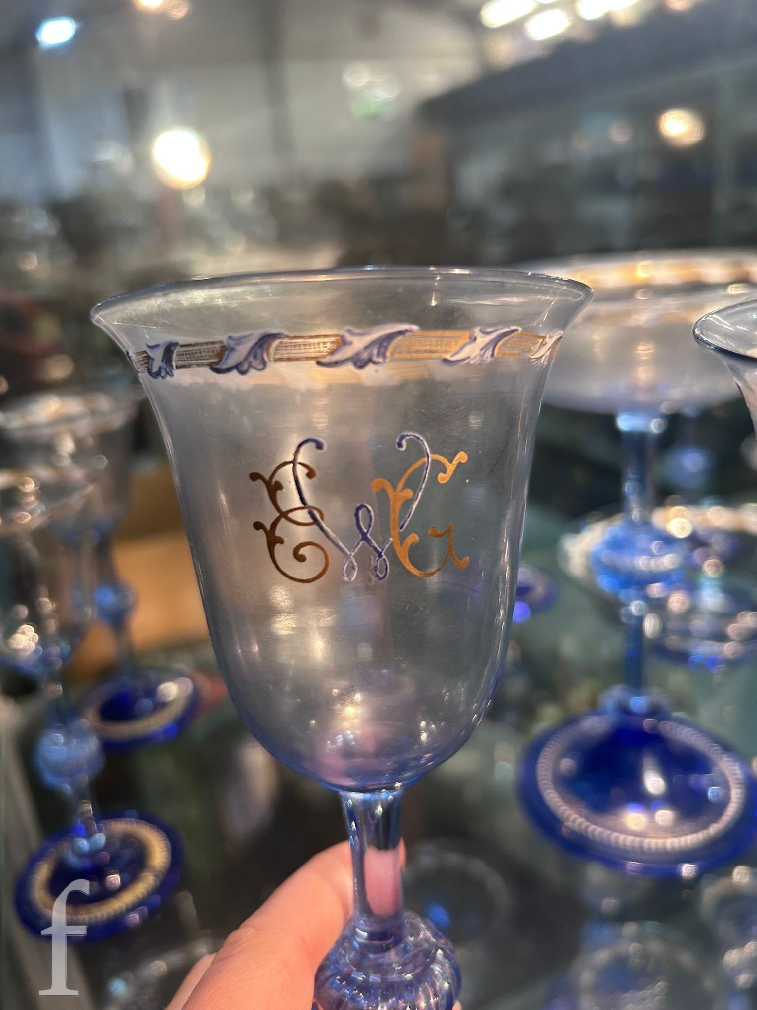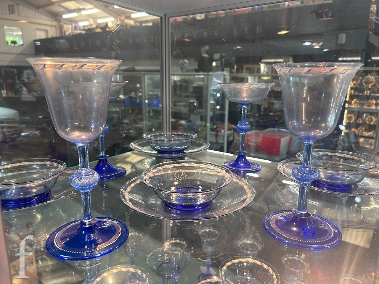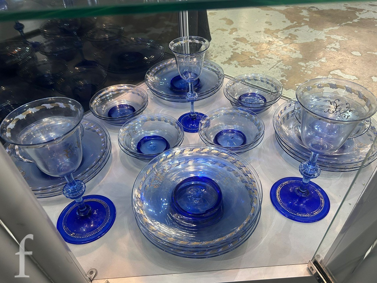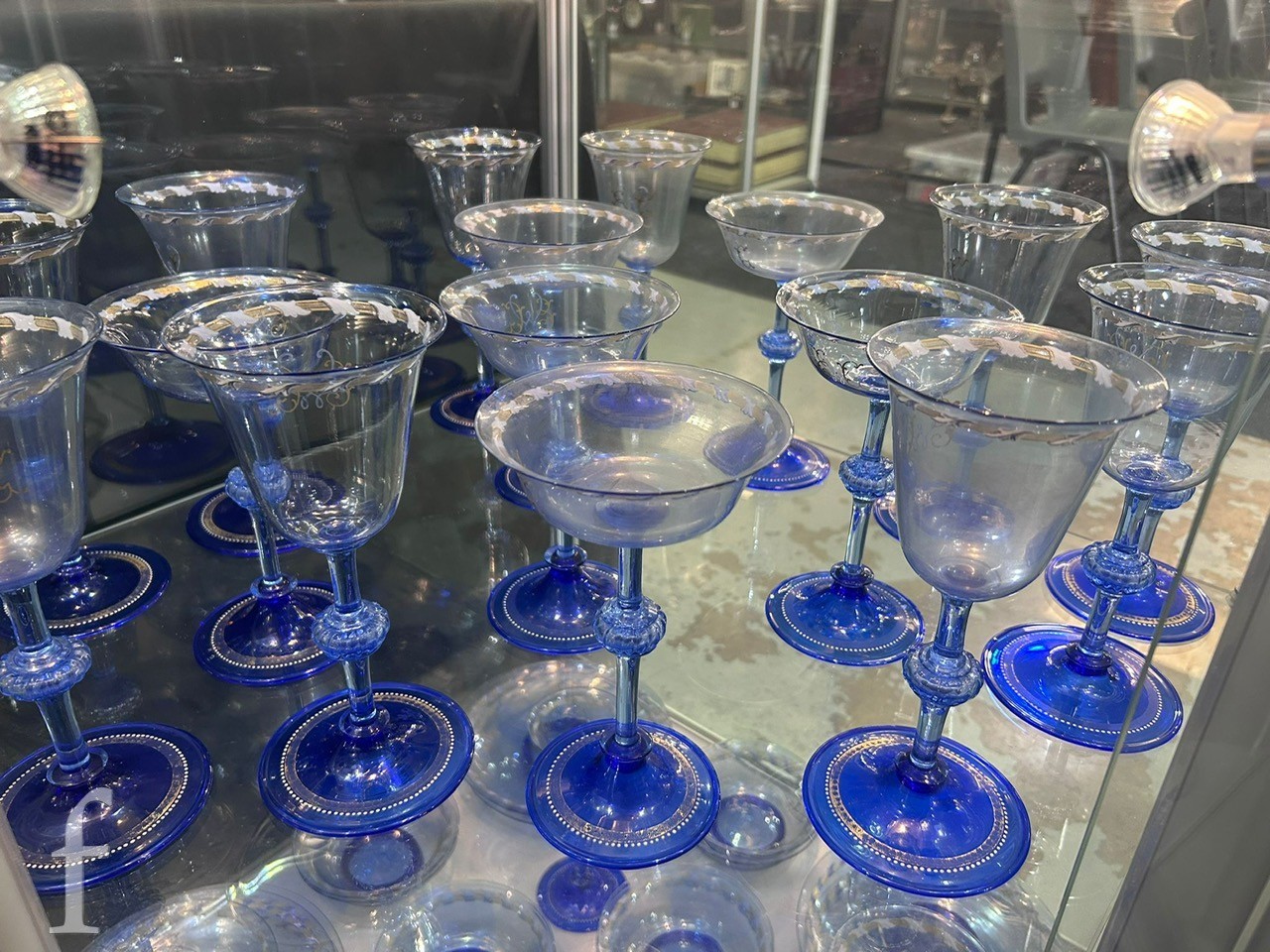 Pauly & C. - Compagnia Venezia Murano - An early 20th Century Italian 'Venetian Revival' extensive suite of stem and tableware, blown blue glass on slender hollow blown wrythen knopped stem and circular foot with folded rim, decorated with gilt band with wound blue and white acanthus leaves and 'EWG' monogram, the foot with gilded band and jewelled enamel border, comprising fifteen wine, fourteen water, fourteen champagne and sixteen port/sherry, tallest 21.5cm, together with eighteen finger bowls and stands, diameter of stand 20cm. (qty)