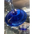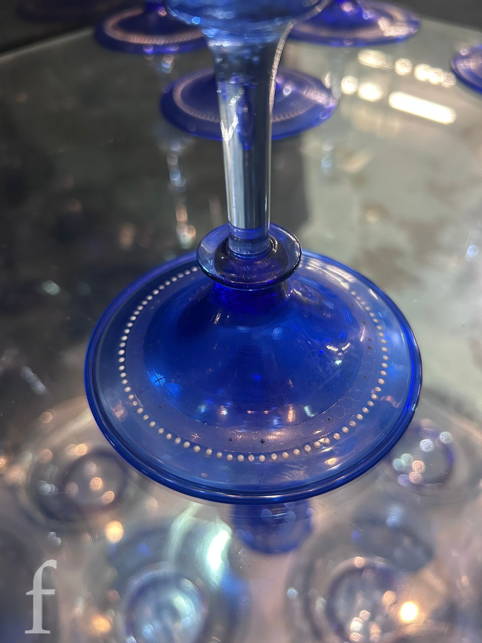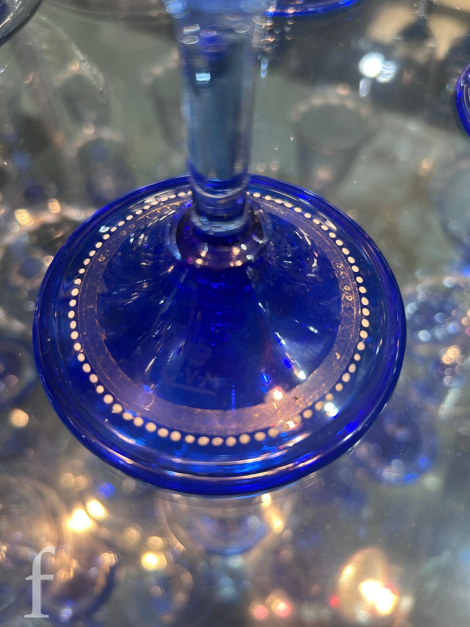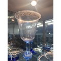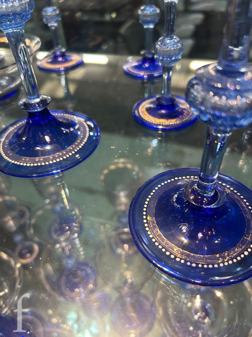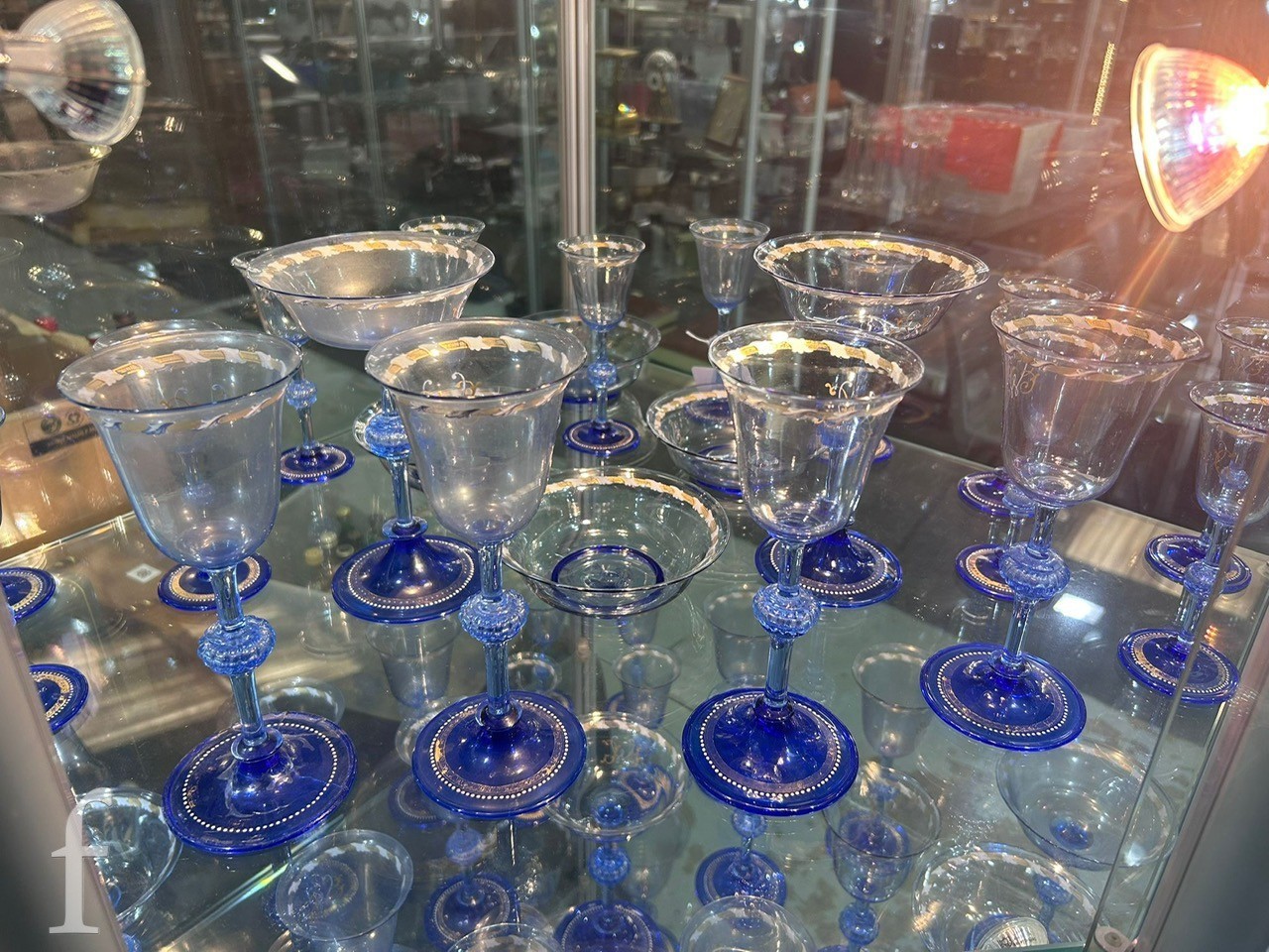 Pauly & C. - Compagnia Venezia Murano - An early 20th Century Italian 'Venetian Revival' extensive suite of stem and tableware, blown blue glass on slender hollow blown wrythen knopped stem and circular foot with folded rim, decorated with gilt band with wound blue and white acanthus leaves and 'EWG' monogram, the foot with gilded band and jewelled enamel border, comprising fifteen wine, fourteen water, fourteen champagne and sixteen port/sherry, tallest 21.5cm, together with eighteen finger bowls and stands, diameter of stand 20cm. (qty)