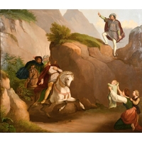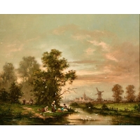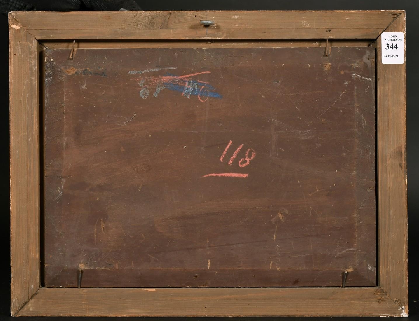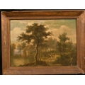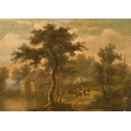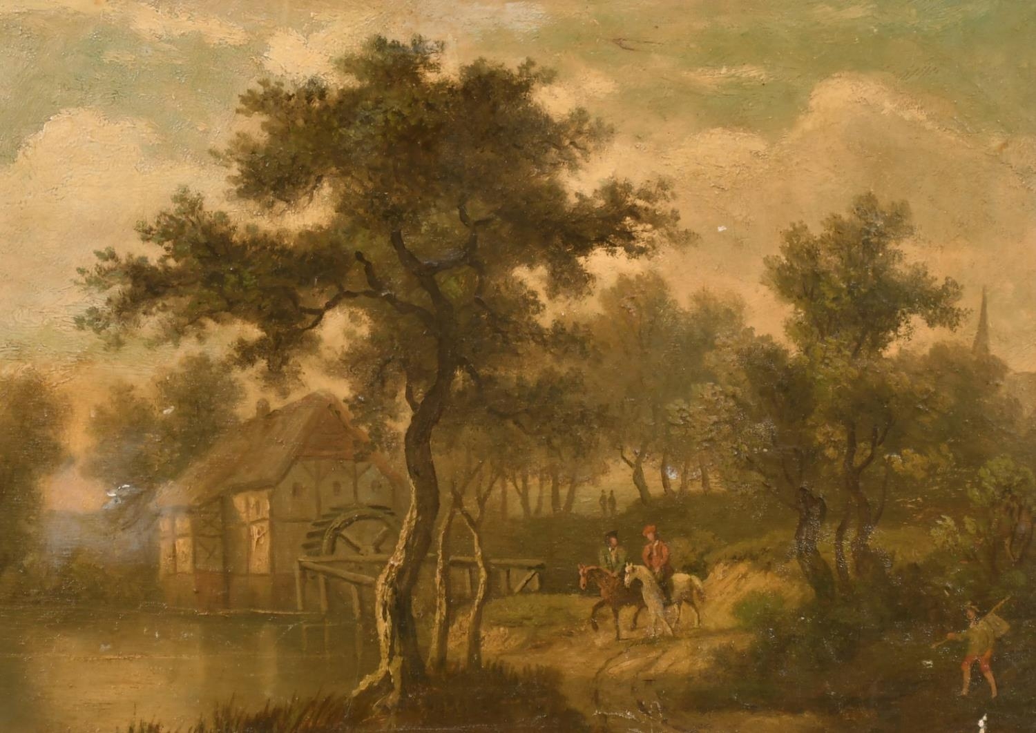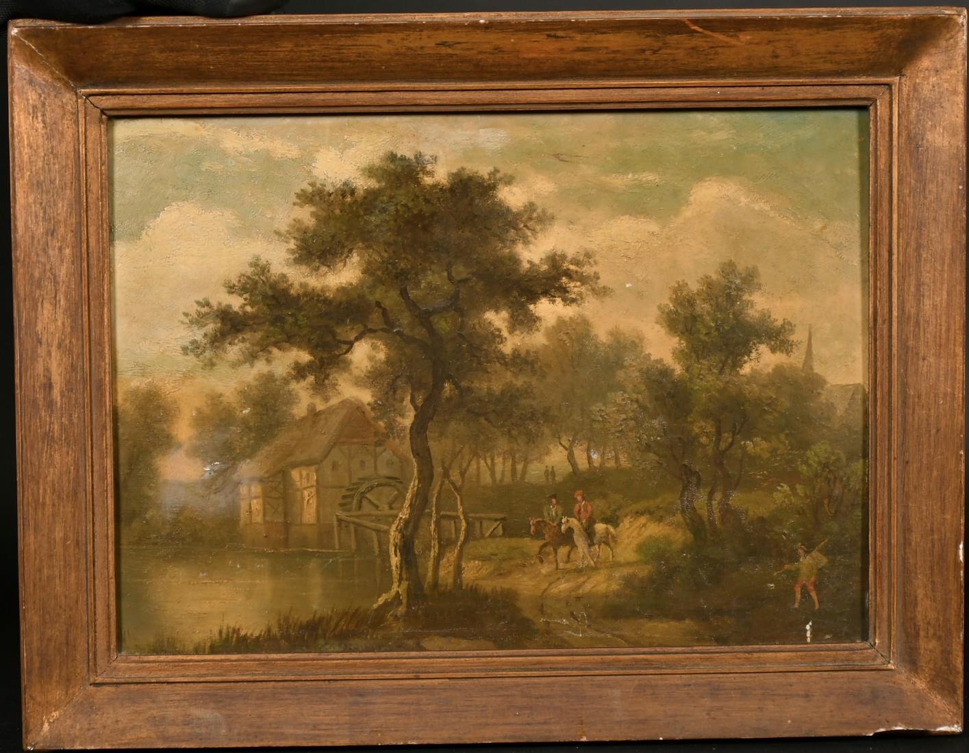 19th century school, possibly Dutch, a scene of figures on horseback by a watermill, oil on mahogany panel, 9.25" x 12.75".