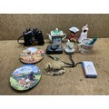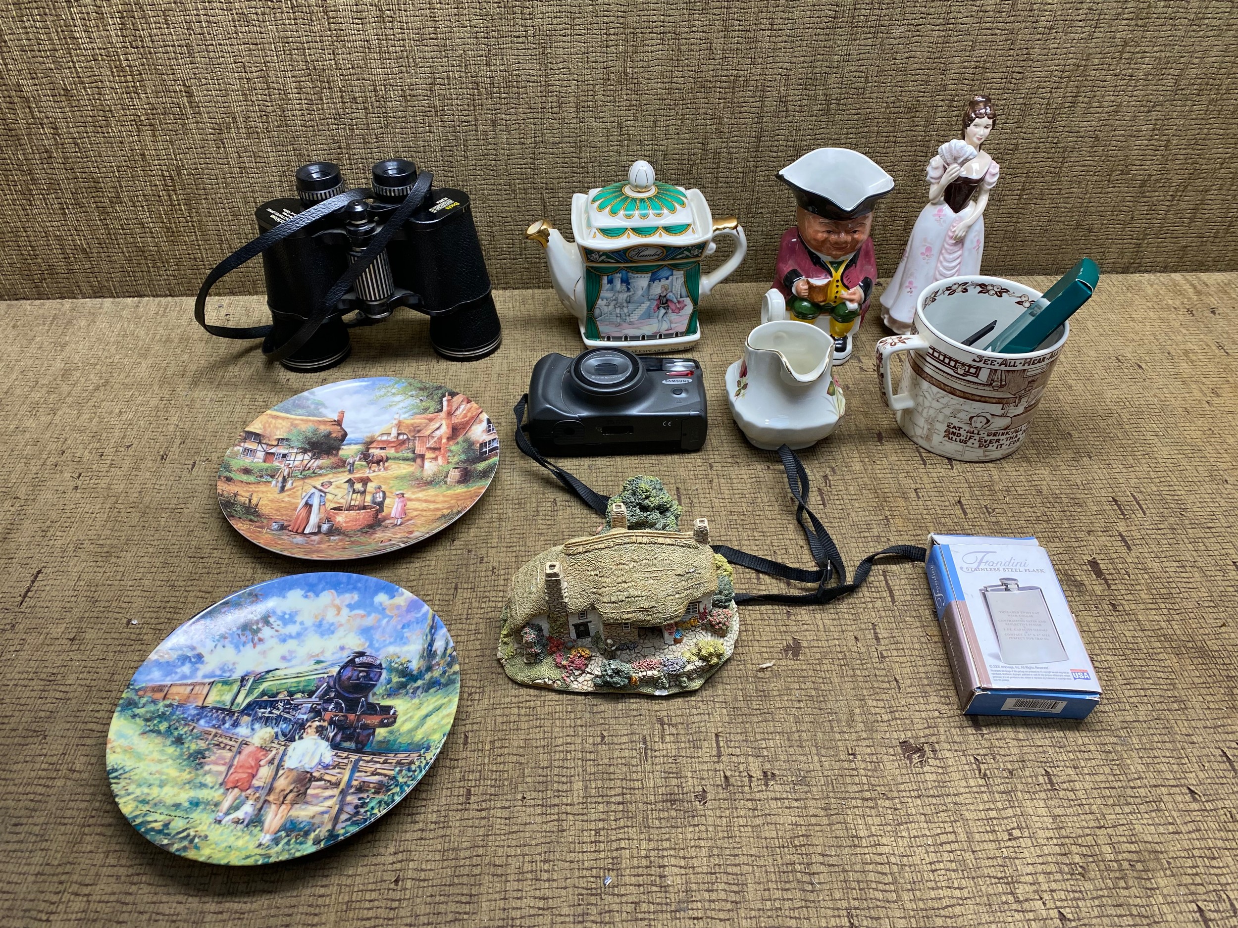 Mixed items, including binoculars, ceramics.