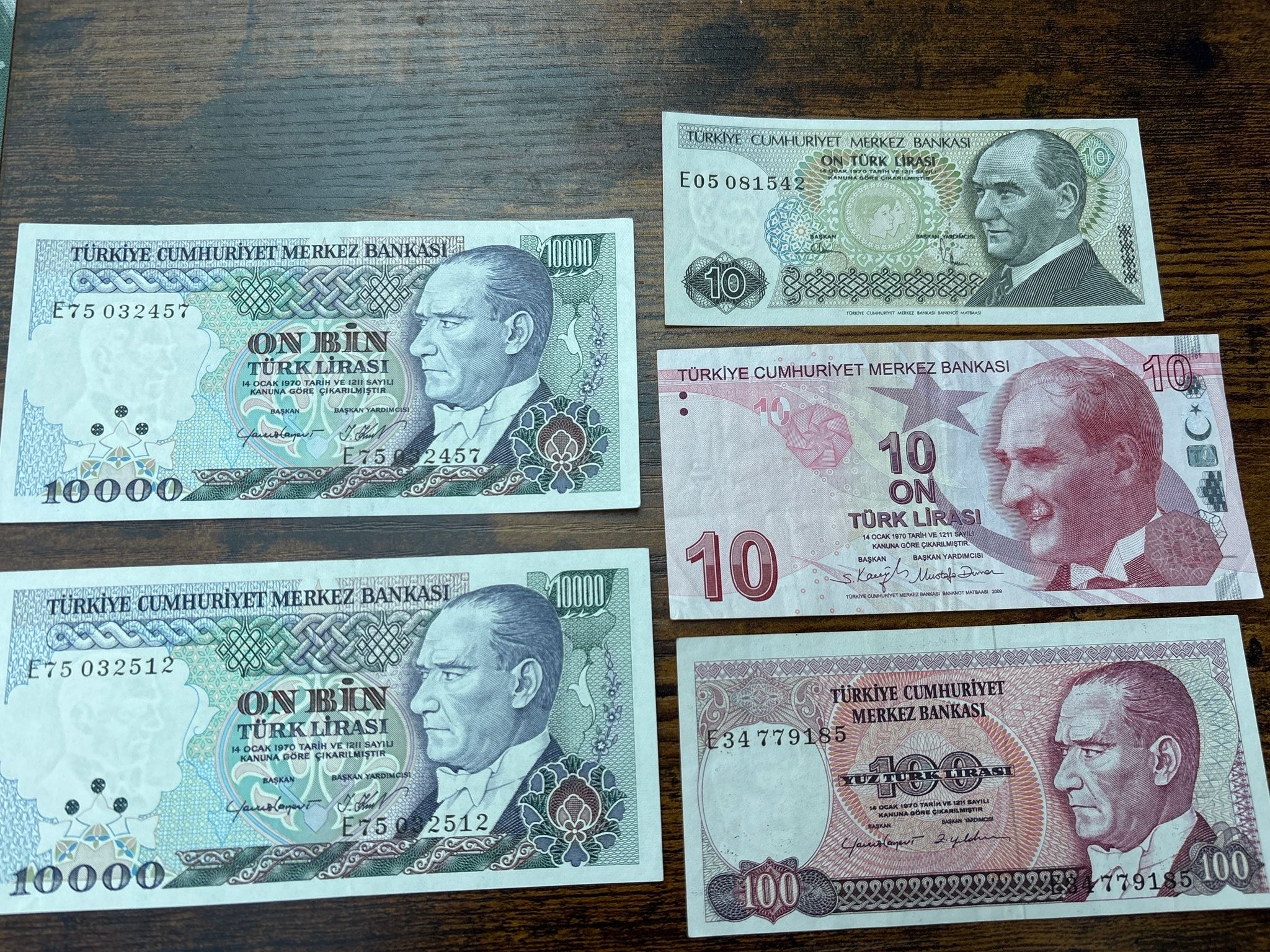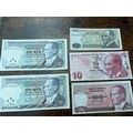 Turkey Banknote Collection – 5 Notes (Mixed Denominations, Atatürk Series) Group of five Turkish banknotes featuring Mustafa Kemal Atatürk, including two 1,000 Lira notes, one 100 Lira, and two 10 Lira notes (different issues). A mix of older and more modern designs showing the evolution of Turkish currency. Condition is mixed, generally good to very good with light handling wear. Some notes appear crisp with minimal circulation.