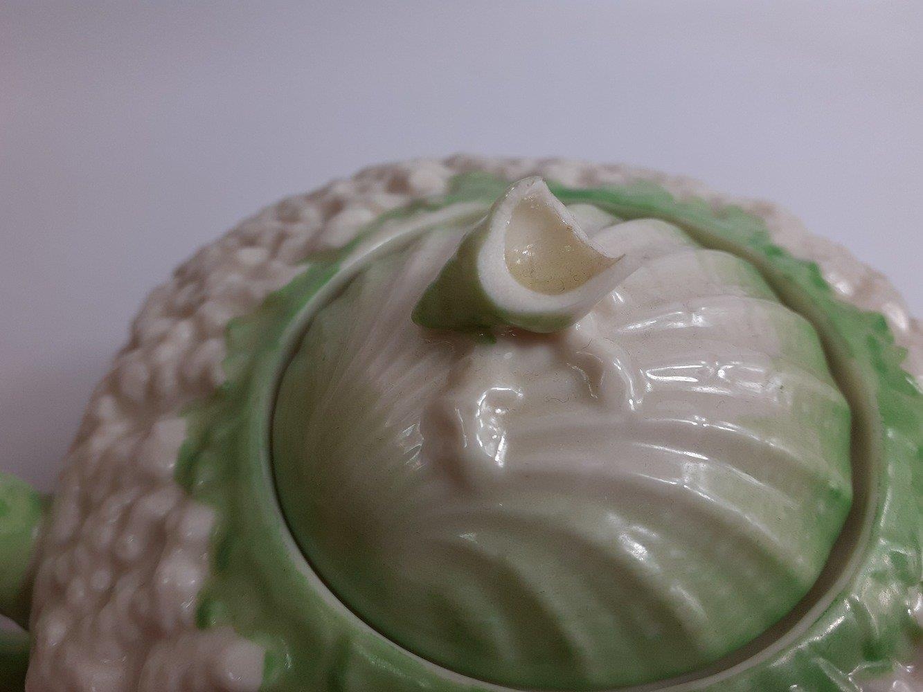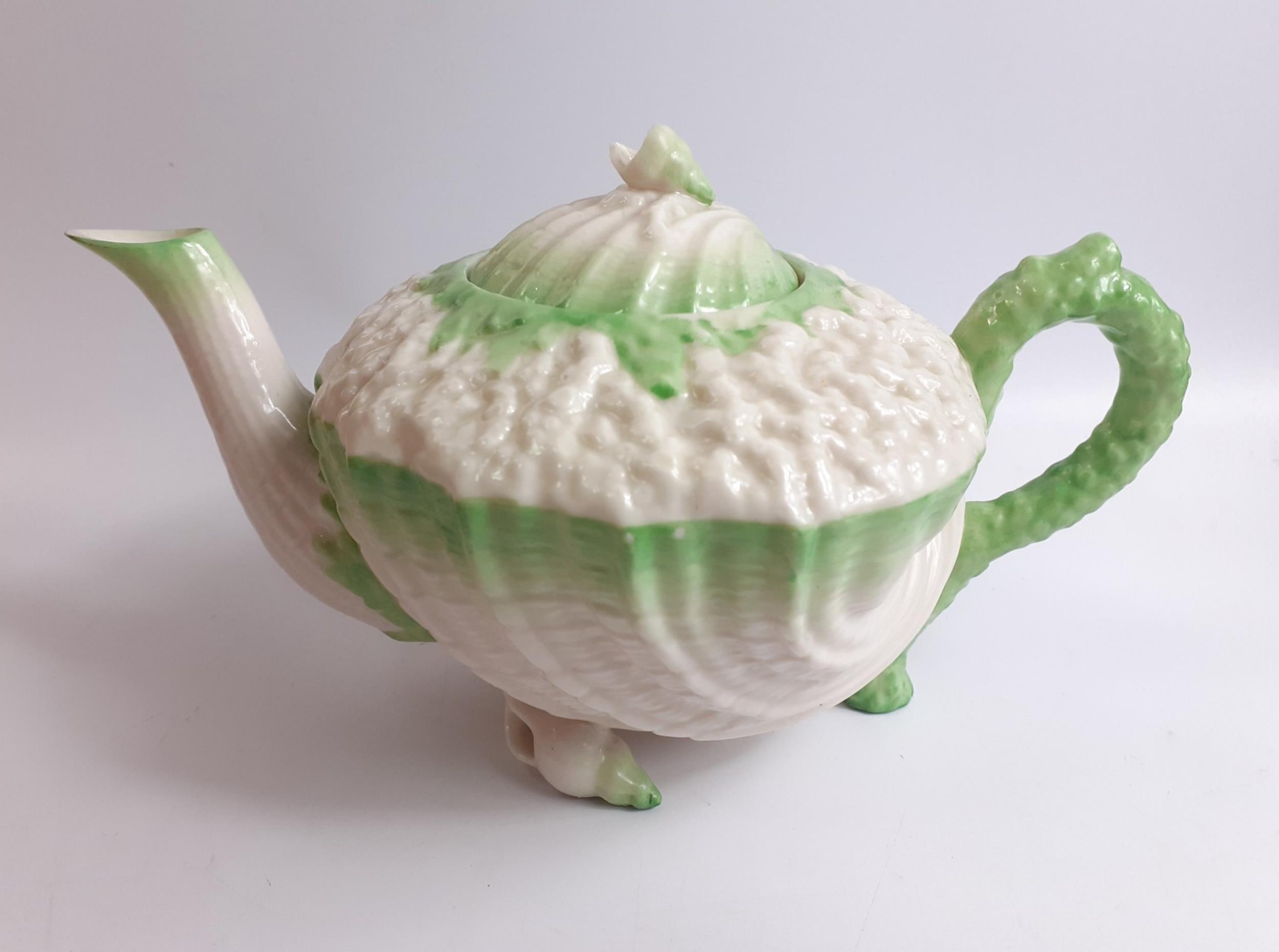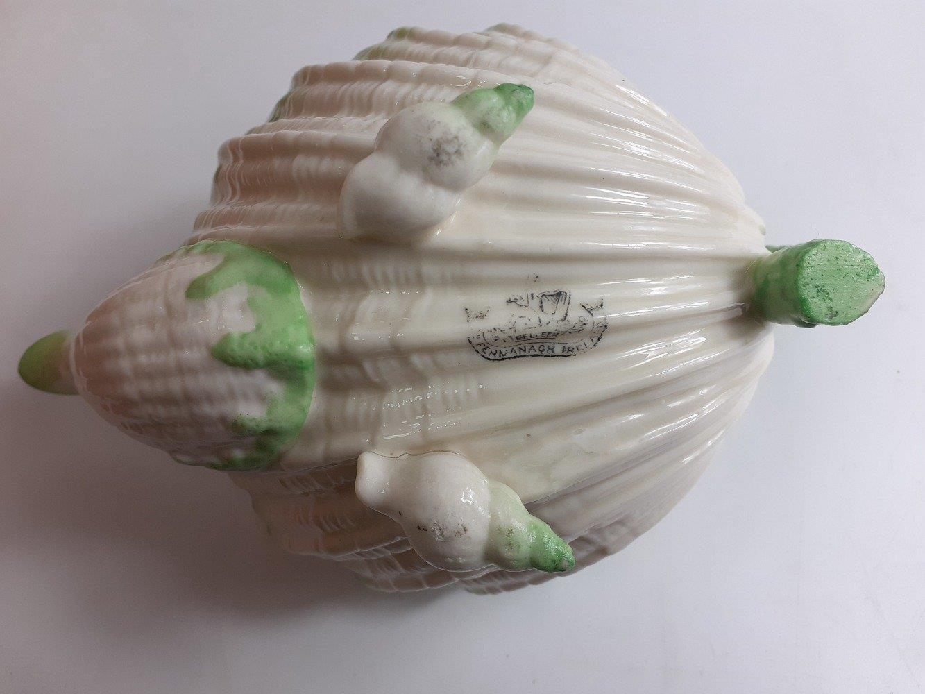 A vintage BELLEEK Fine Parian china shell Neptune teapot, with green highlights, standing 12cm high, damage to shell finial but otherwise in excellent condition