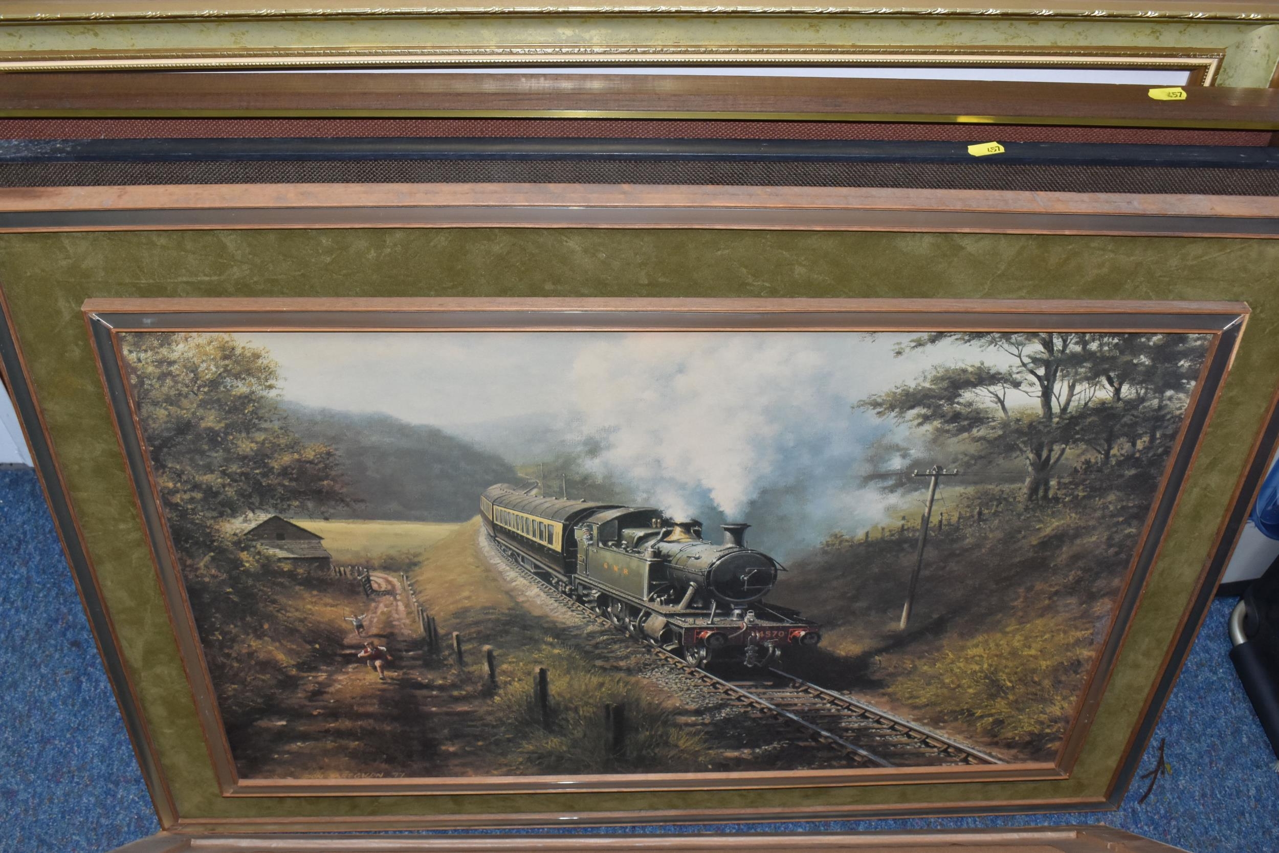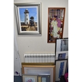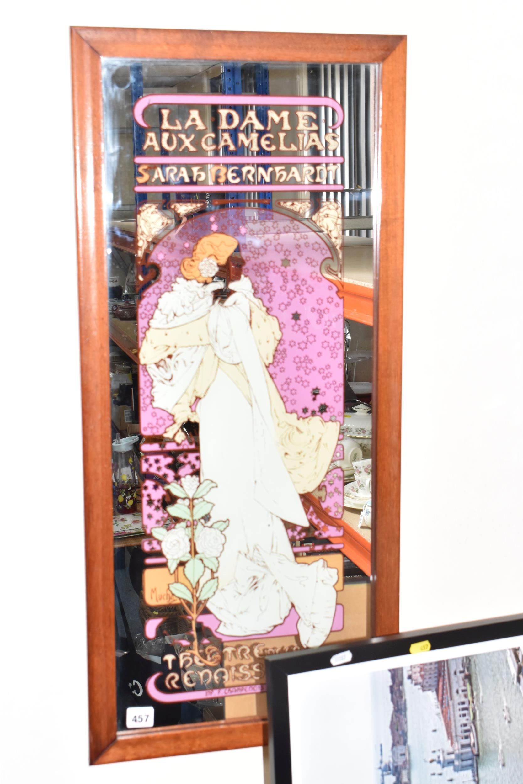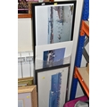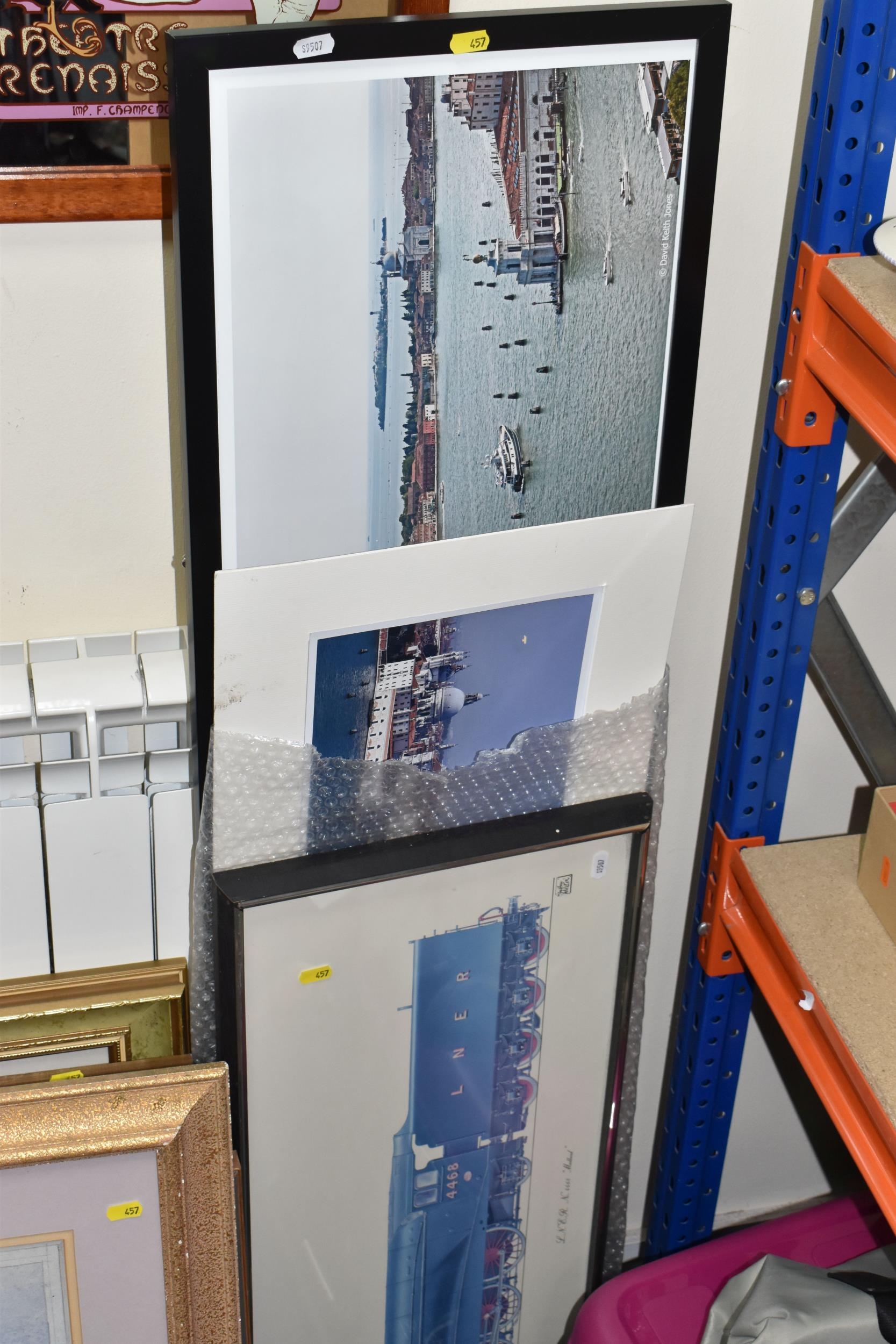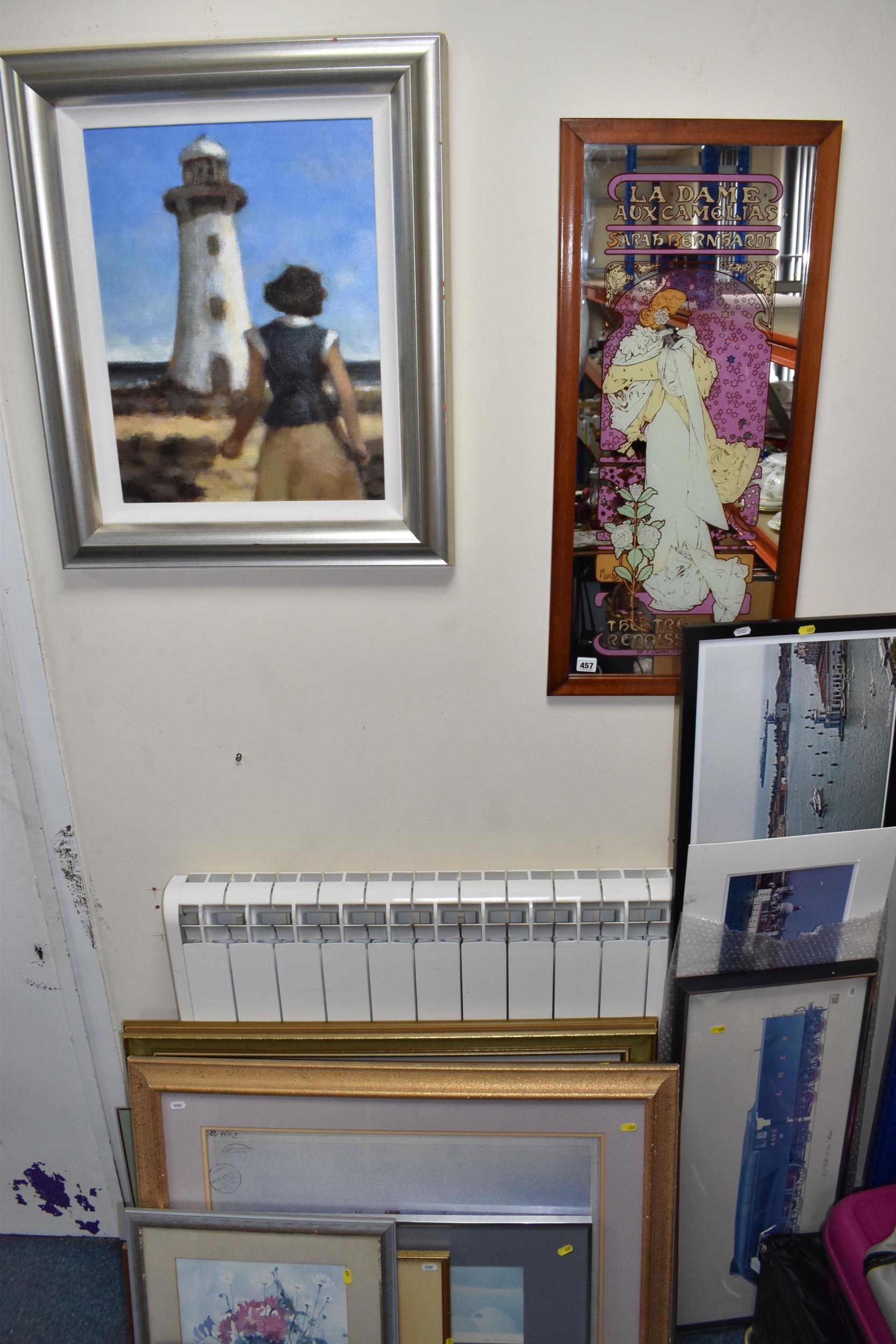 A QUANTITY OF DECORATIVE PRINTS AND MIRROR, to include a Chris Bennett signed limited edition print 'Blue Skies', depicting a female figure approaching a lighthouse, approximate size 54cm x 41cm, a don Breckon print 'Racing the Train', depicting a figure running beside a train, an Anthony Warren canal scene print, a Venetian scene by Edward William Cooke, 'Cafe in a park' print by Arthur Fleury Victor Dutert, Geoffrey Wheeler print of 'Mallard' steam locomotive, photographic prints of Venice, assorted other prints and a mirror with an Alphonse Mucha illustration for the play 'The Lady of the Camellias'