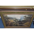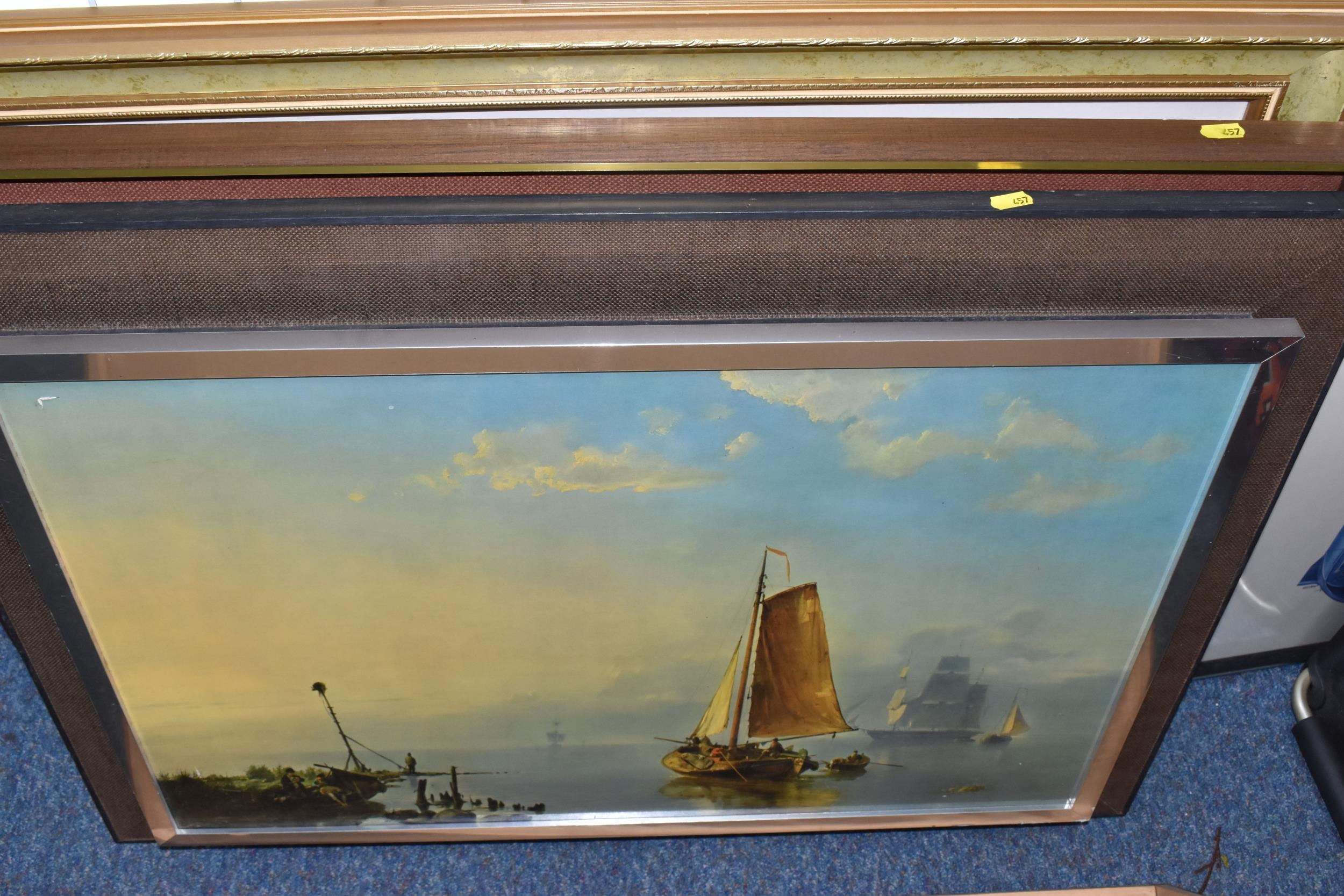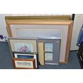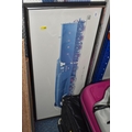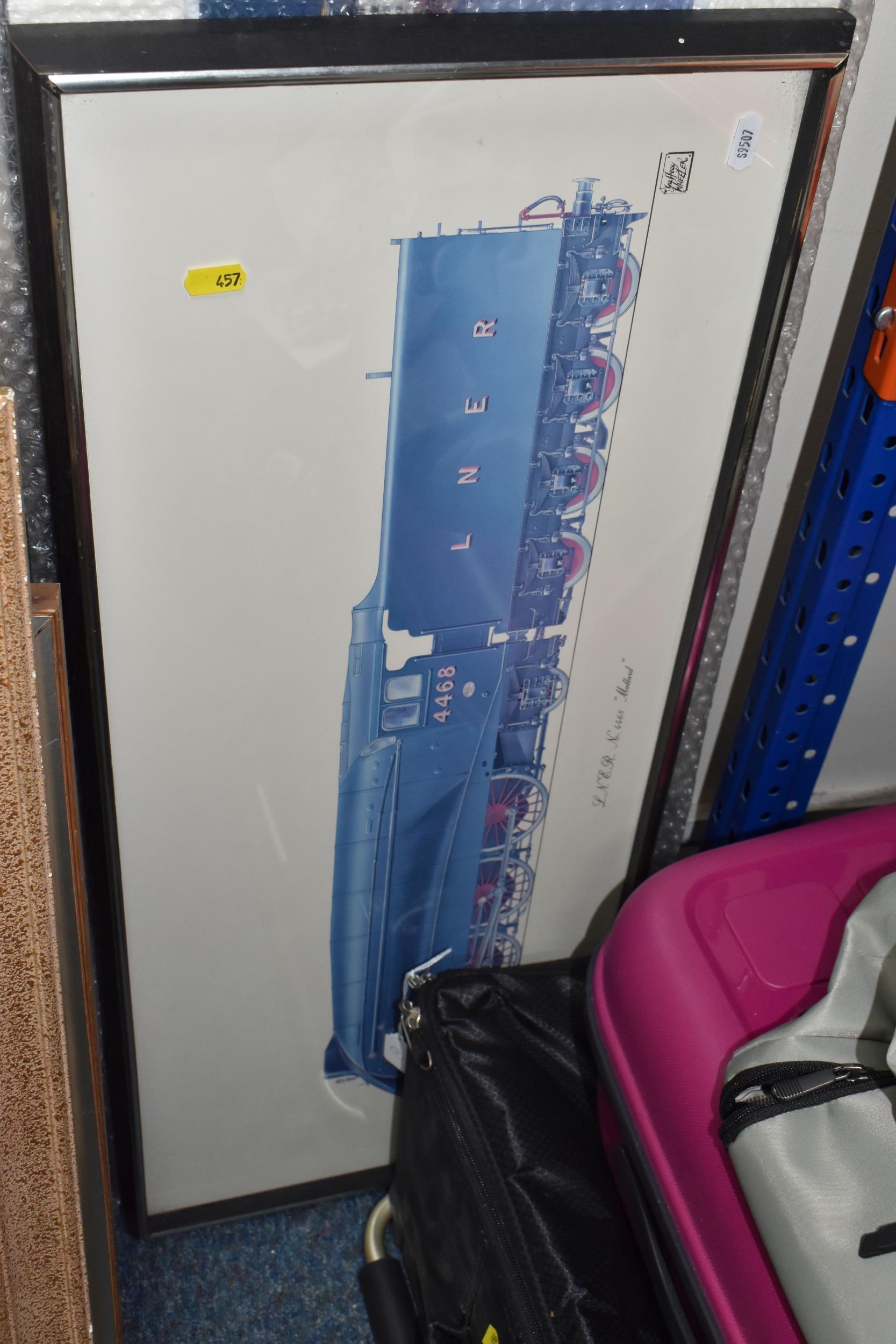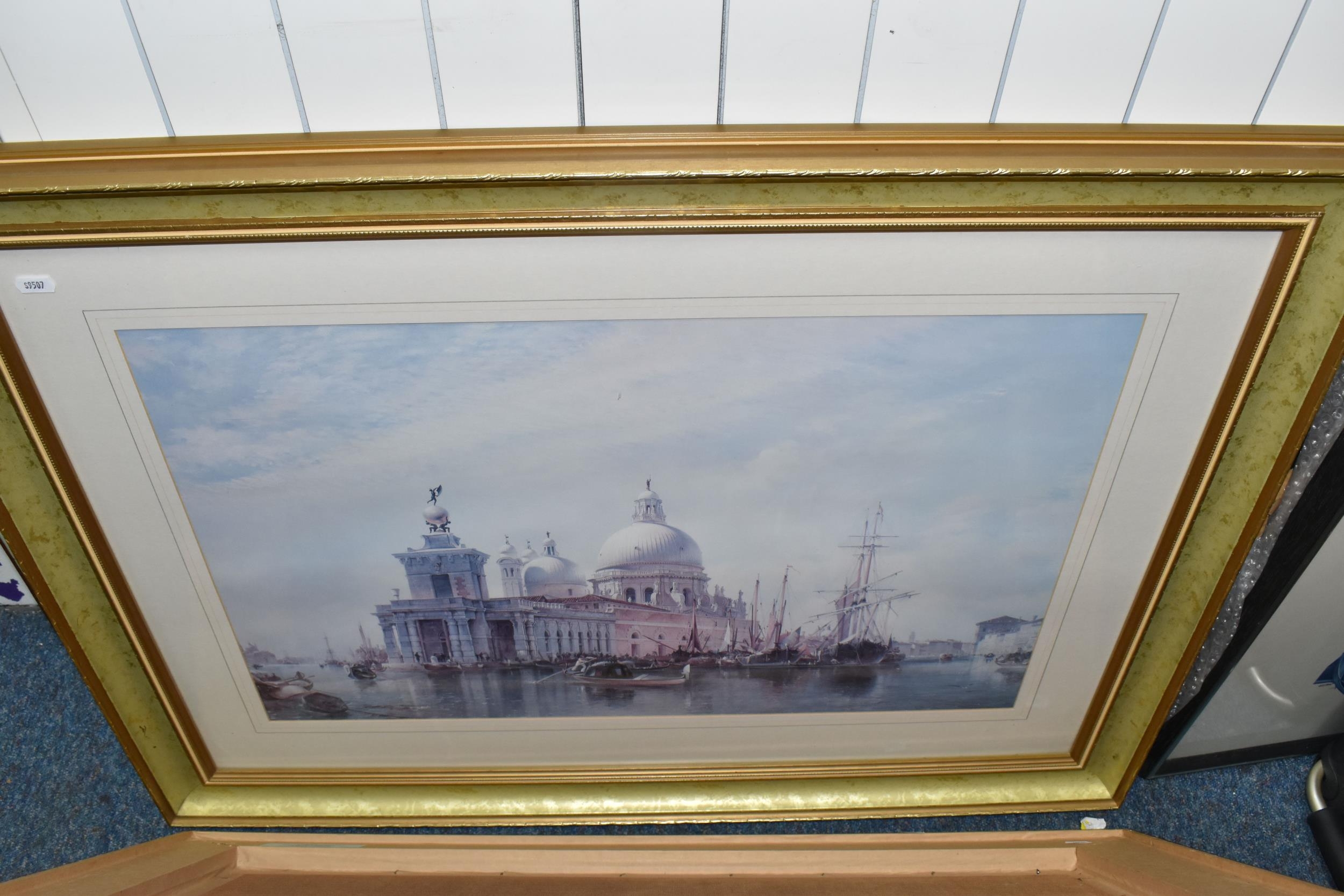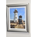 A QUANTITY OF DECORATIVE PRINTS AND MIRROR, to include a Chris Bennett signed limited edition print 'Blue Skies', depicting a female figure approaching a lighthouse, approximate size 54cm x 41cm, a don Breckon print 'Racing the Train', depicting a figure running beside a train, an Anthony Warren canal scene print, a Venetian scene by Edward William Cooke, 'Cafe in a park' print by Arthur Fleury Victor Dutert, Geoffrey Wheeler print of 'Mallard' steam locomotive, photographic prints of Venice, assorted other prints and a mirror with an Alphonse Mucha illustration for the play 'The Lady of the Camellias'