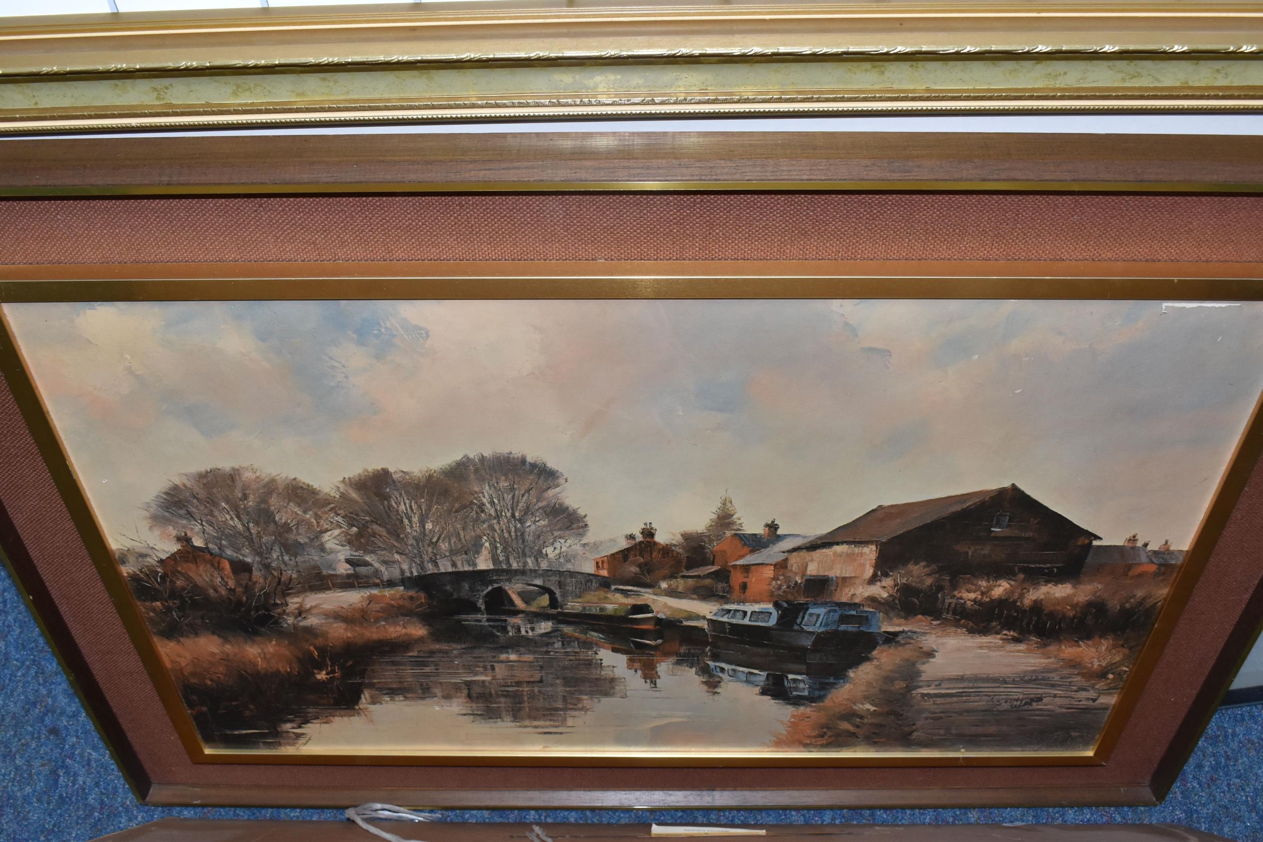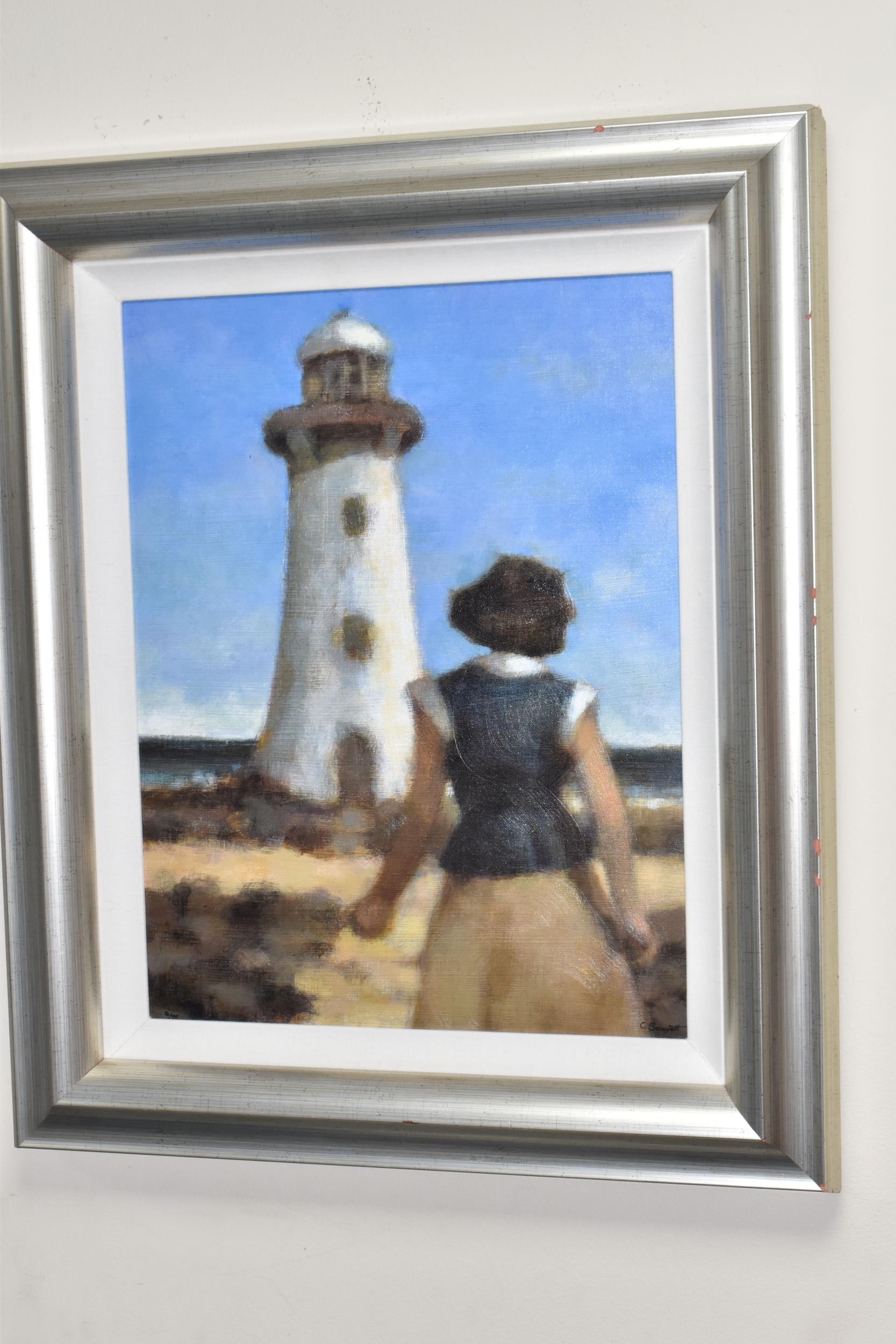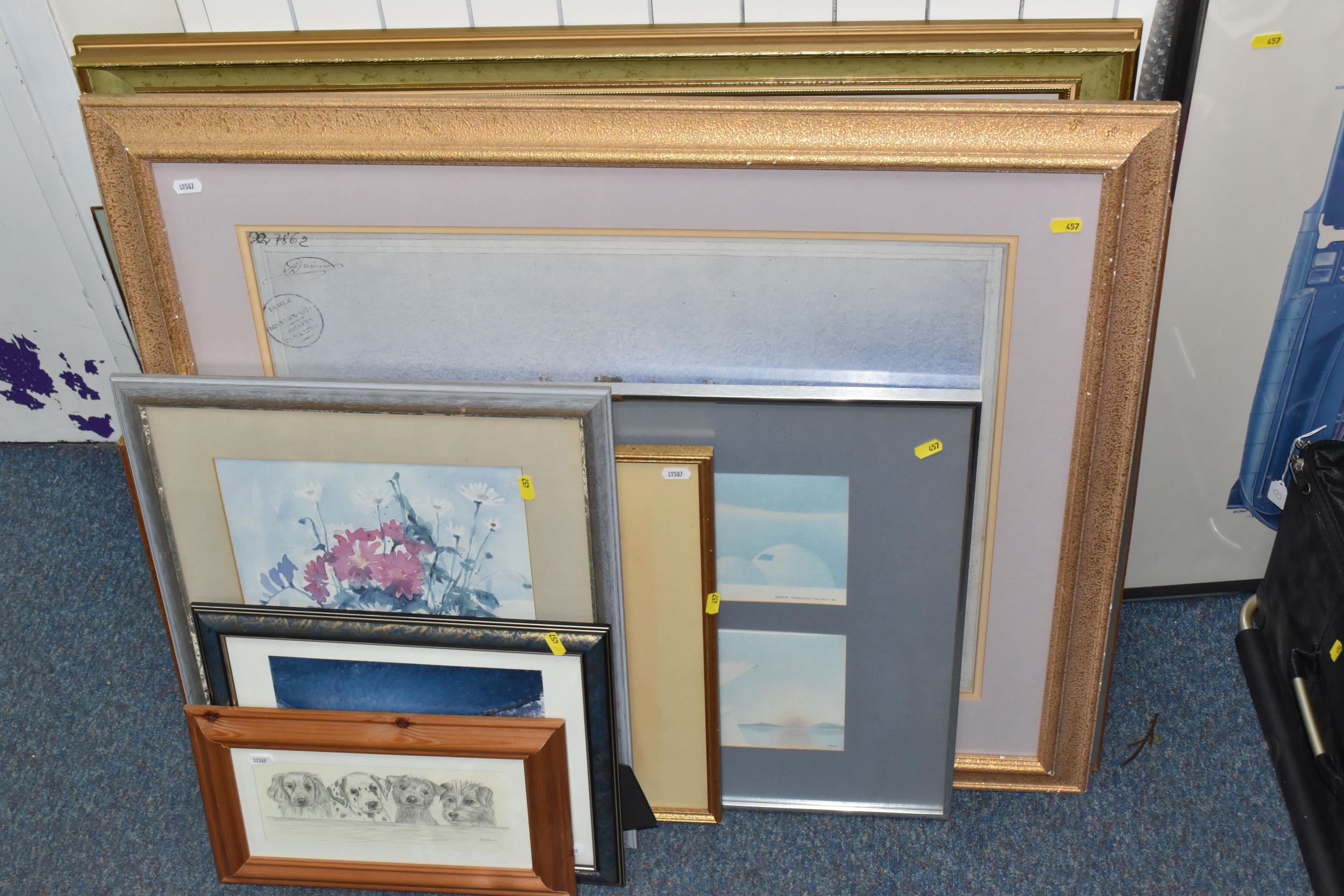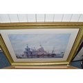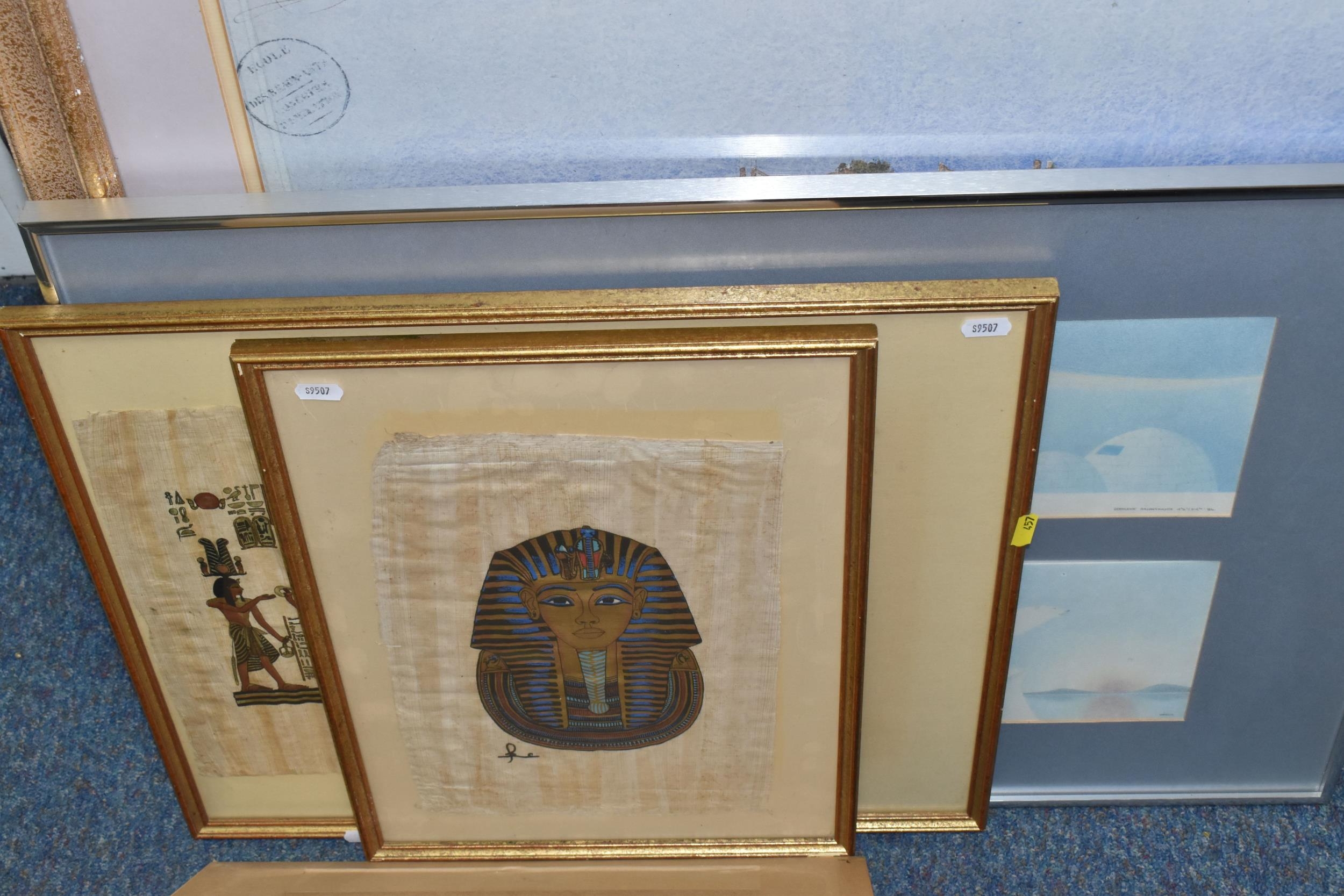 A QUANTITY OF DECORATIVE PRINTS AND MIRROR, to include a Chris Bennett signed limited edition print 'Blue Skies', depicting a female figure approaching a lighthouse, approximate size 54cm x 41cm, a don Breckon print 'Racing the Train', depicting a figure running beside a train, an Anthony Warren canal scene print, a Venetian scene by Edward William Cooke, 'Cafe in a park' print by Arthur Fleury Victor Dutert, Geoffrey Wheeler print of 'Mallard' steam locomotive, photographic prints of Venice, assorted other prints and a mirror with an Alphonse Mucha illustration for the play 'The Lady of the Camellias'