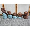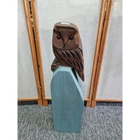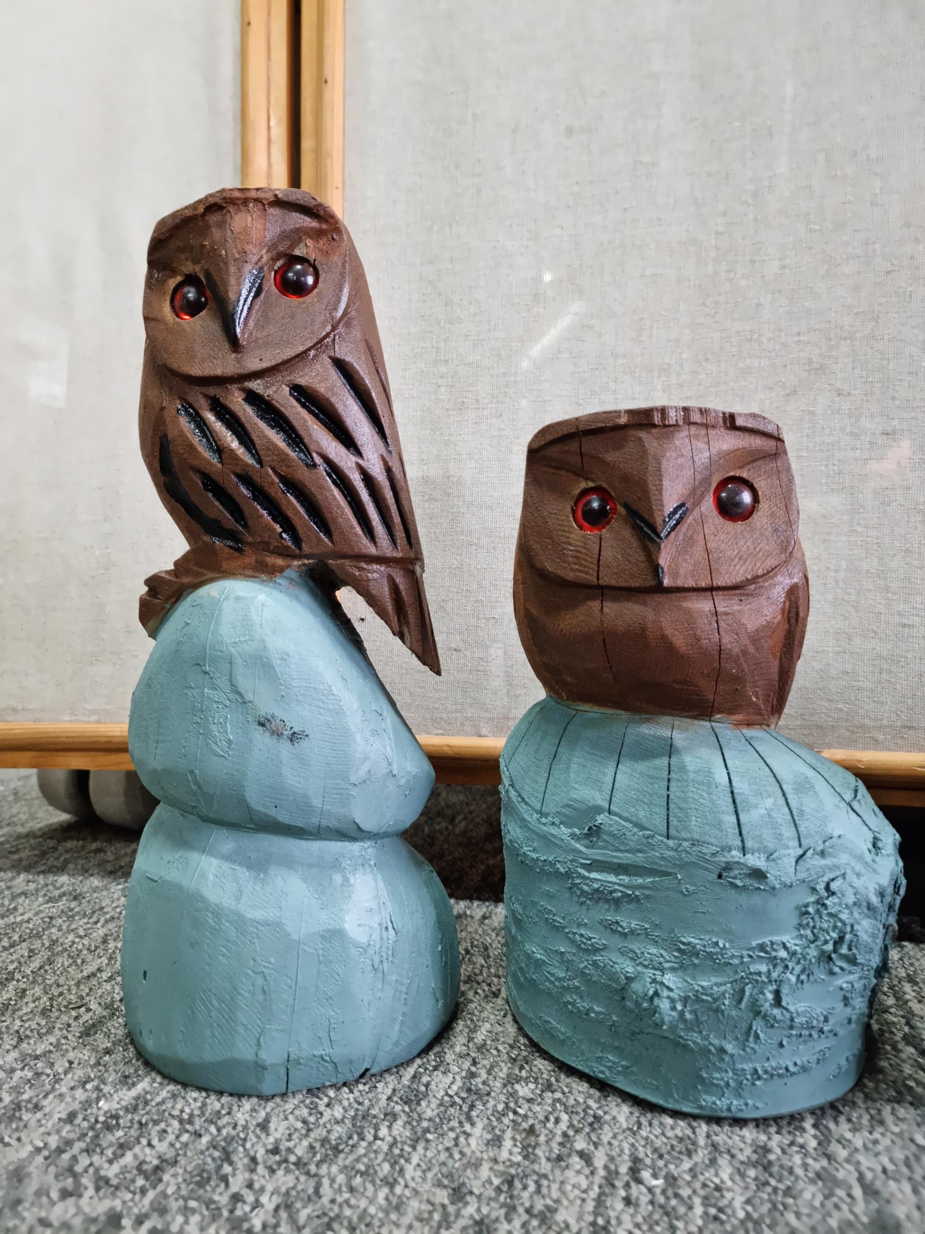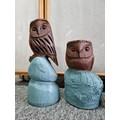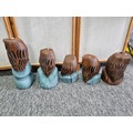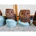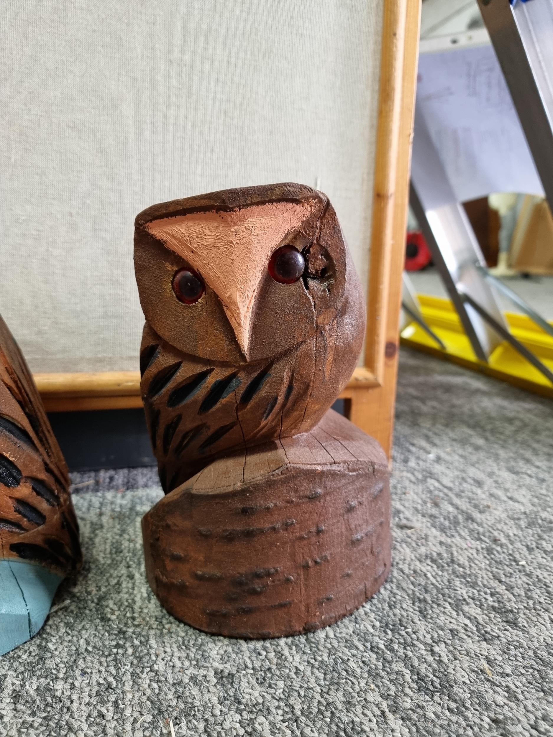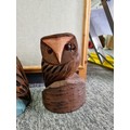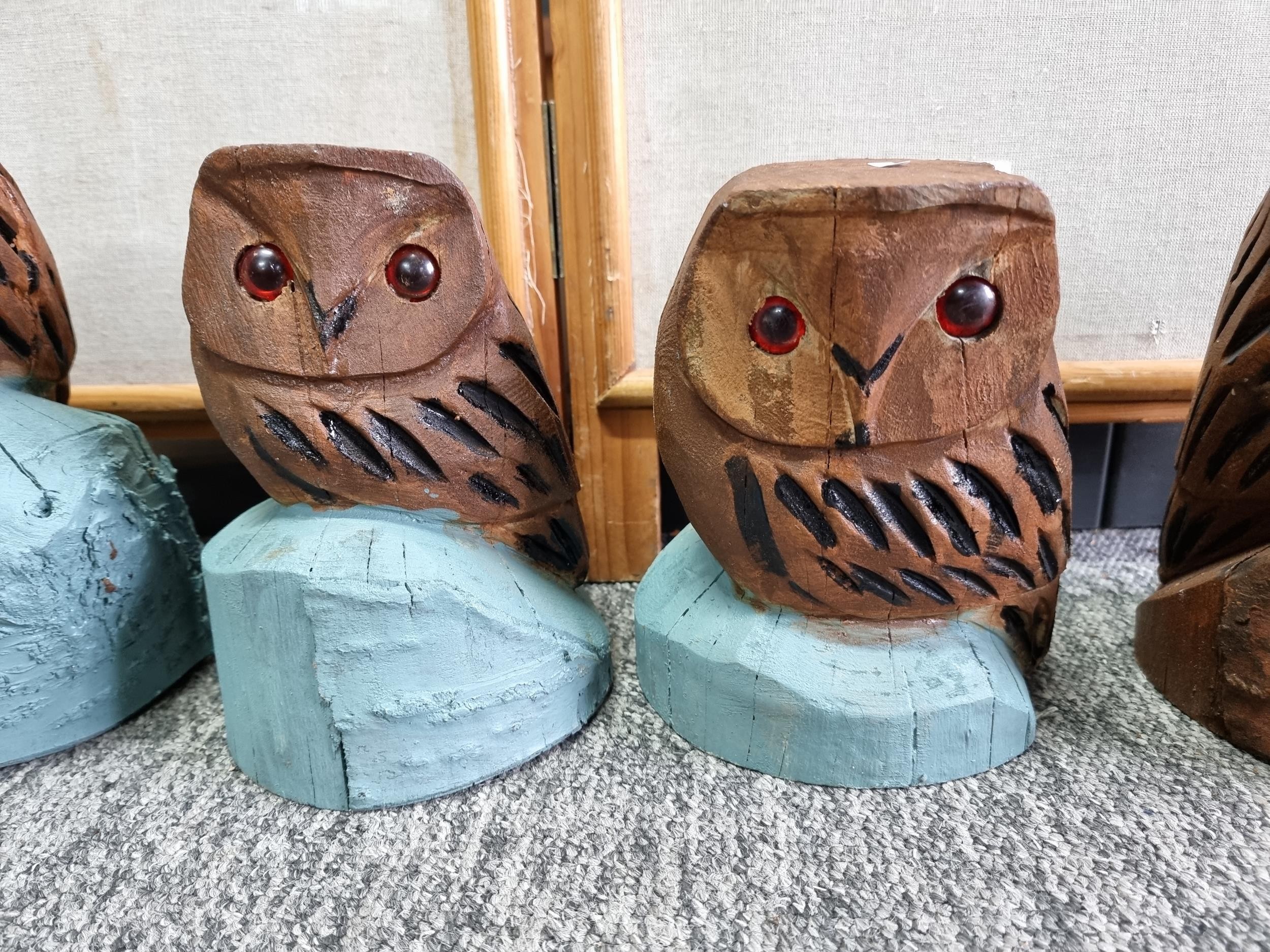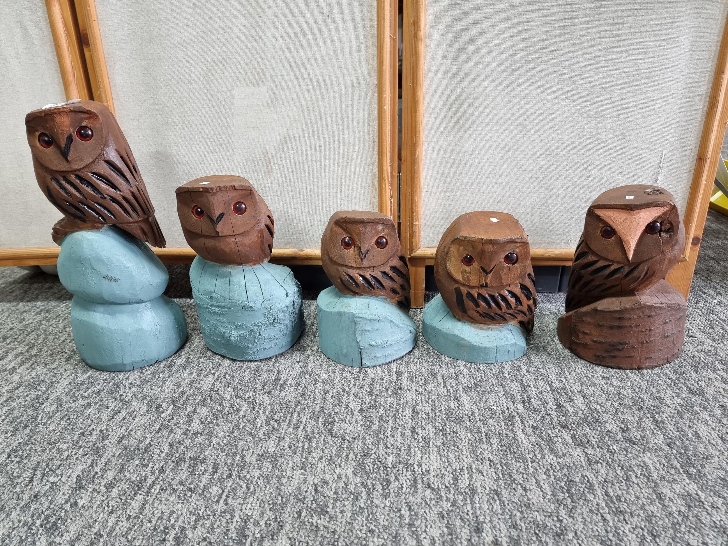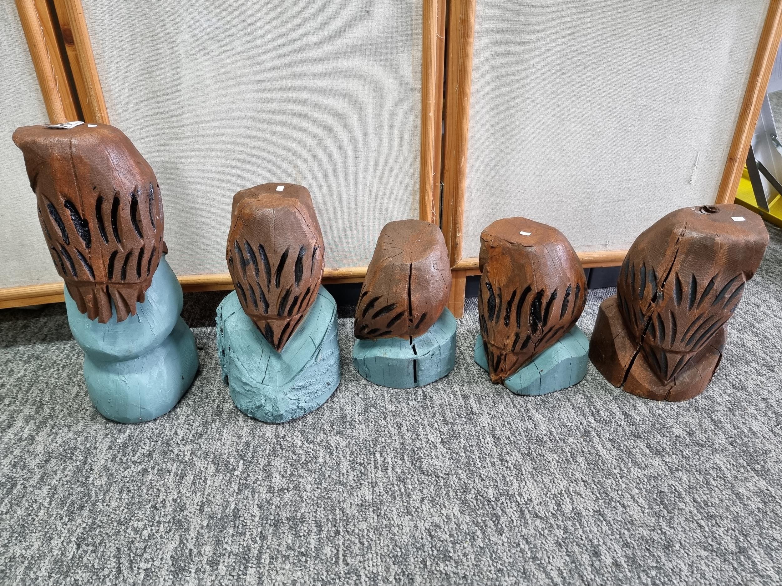 5 x solid wooden owl carved garden ornaments, in various sizes the largest being 35 cm high.