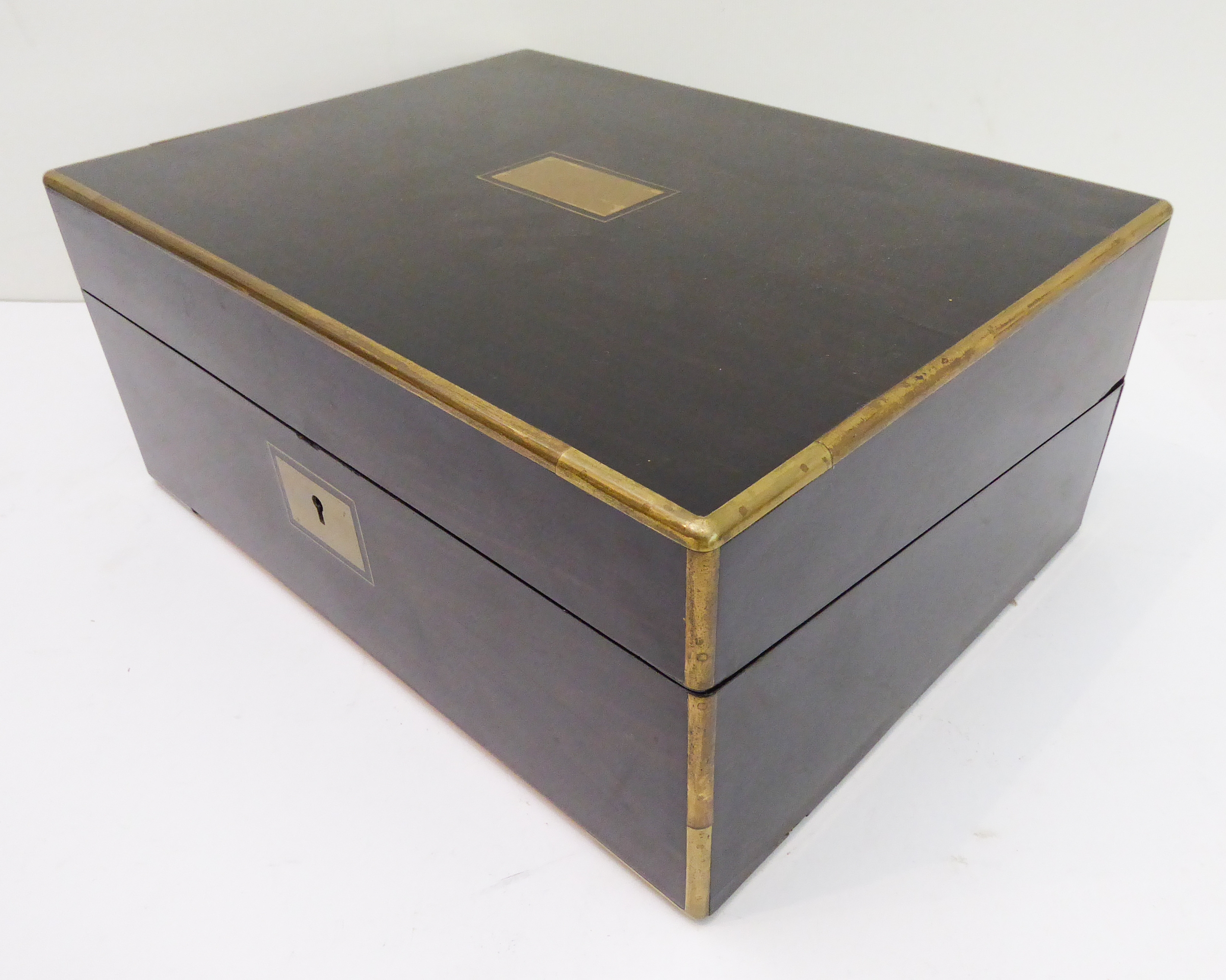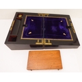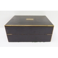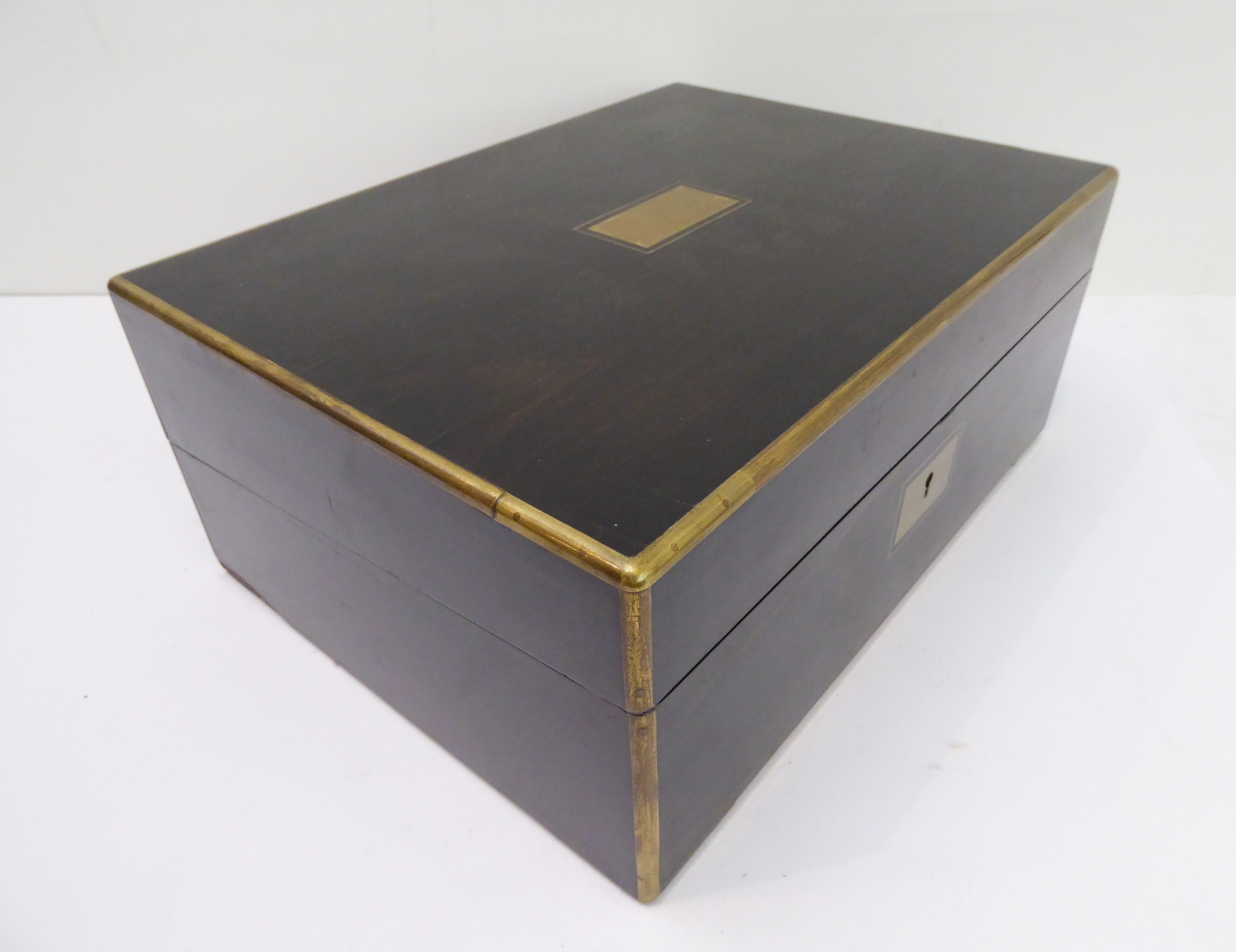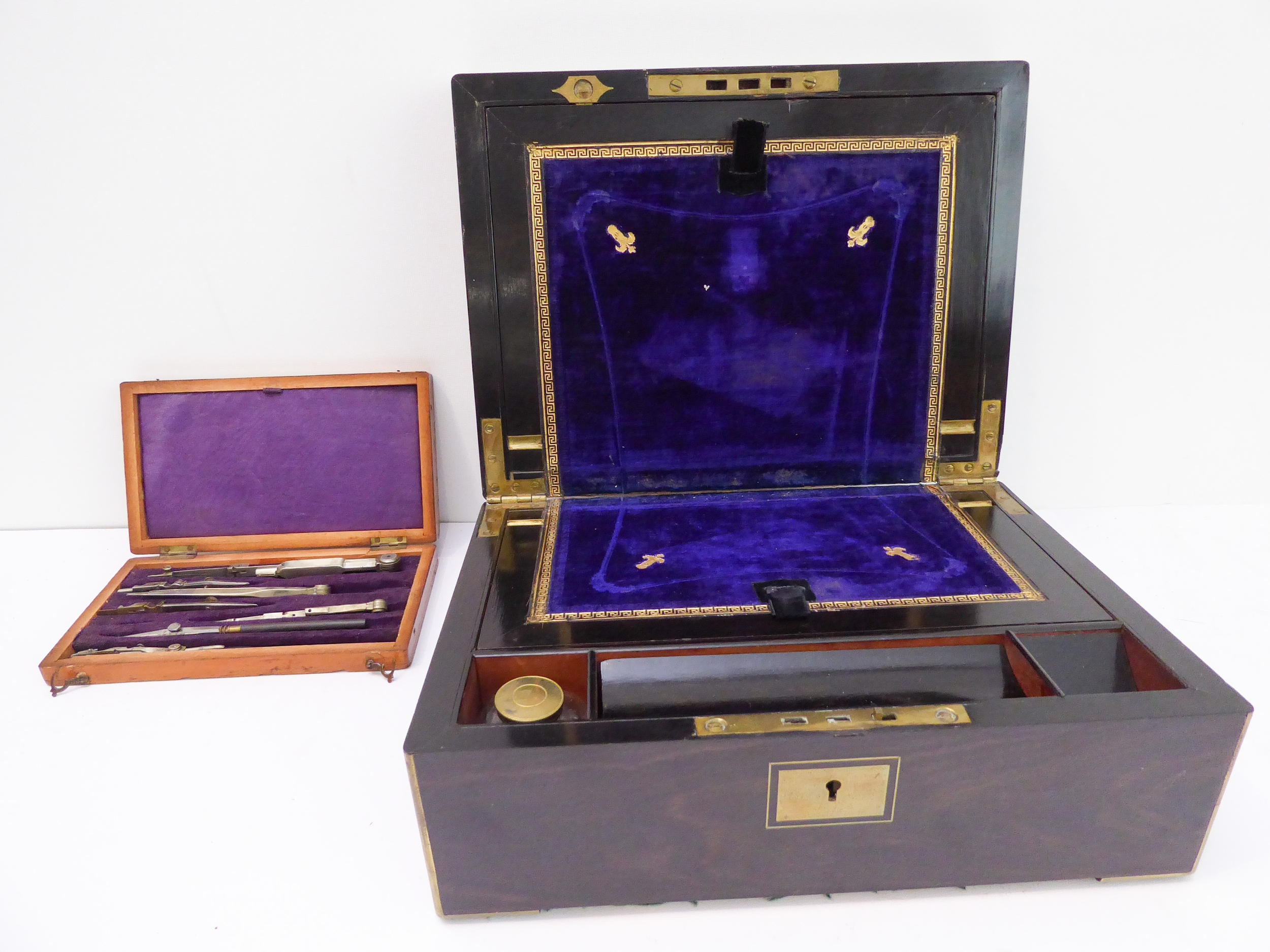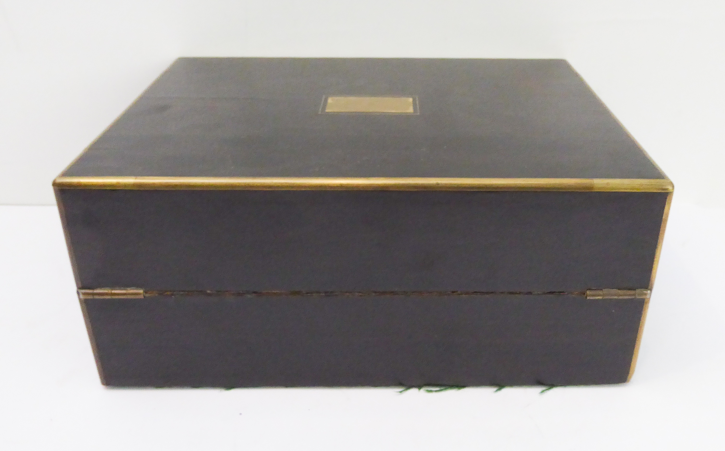 A mid-19th century brass-bound calamander writing slope: hinged top opening to reveal gilt-tooled velvet interior writing surface, single inkwell, pen-rest and stamp slide (30.5 cm wide x 13 cm high)