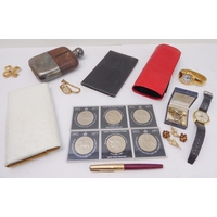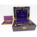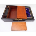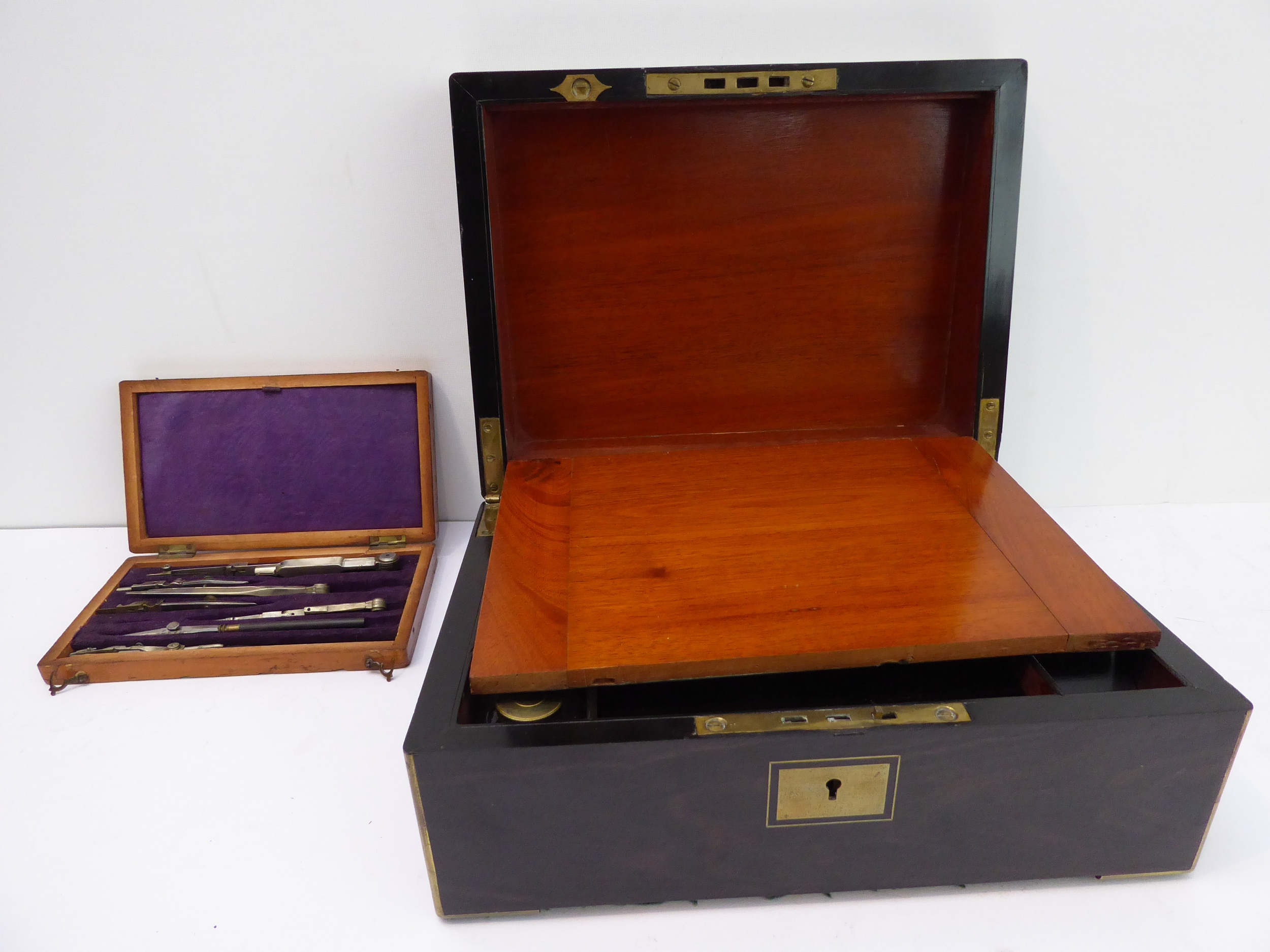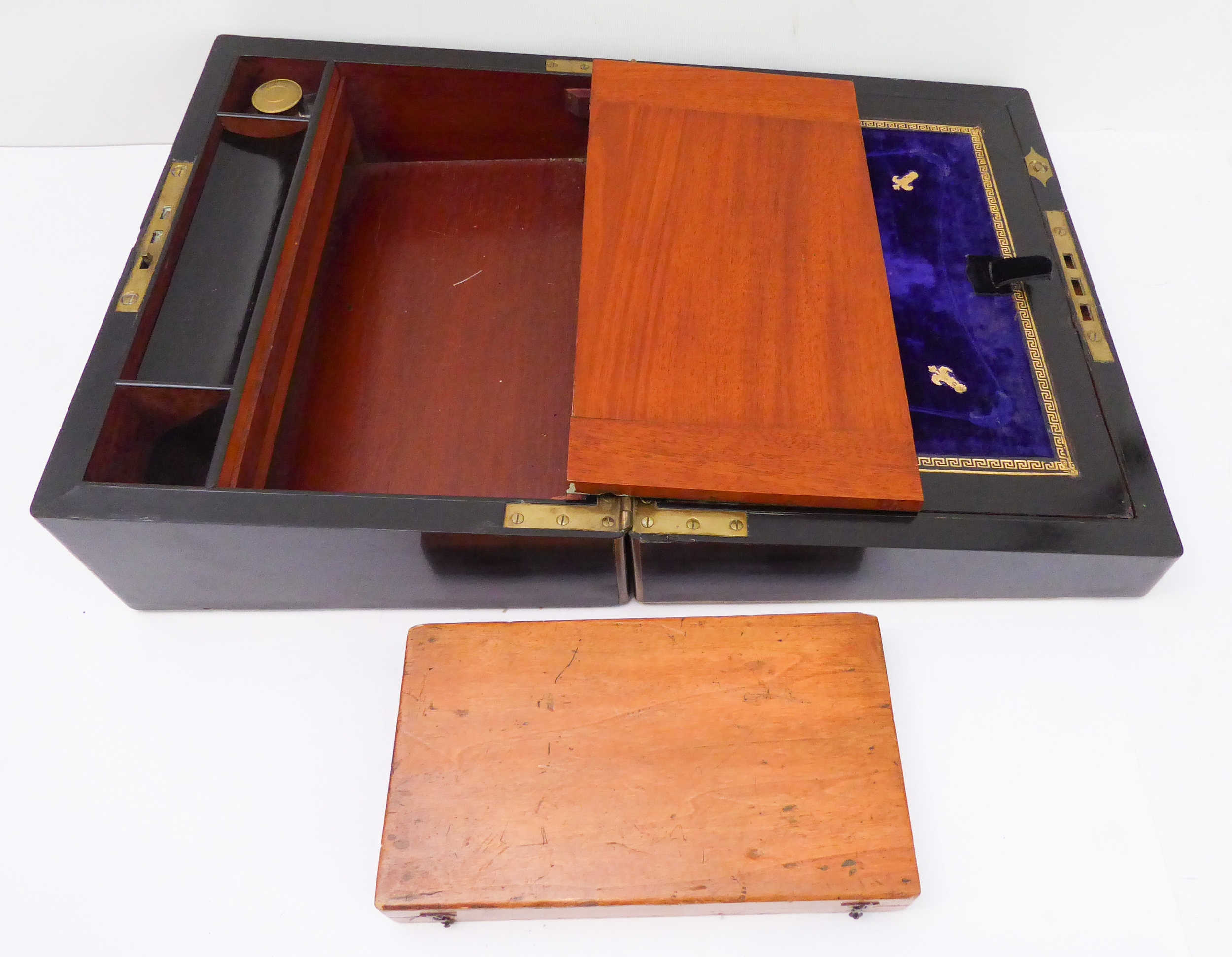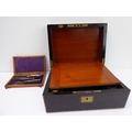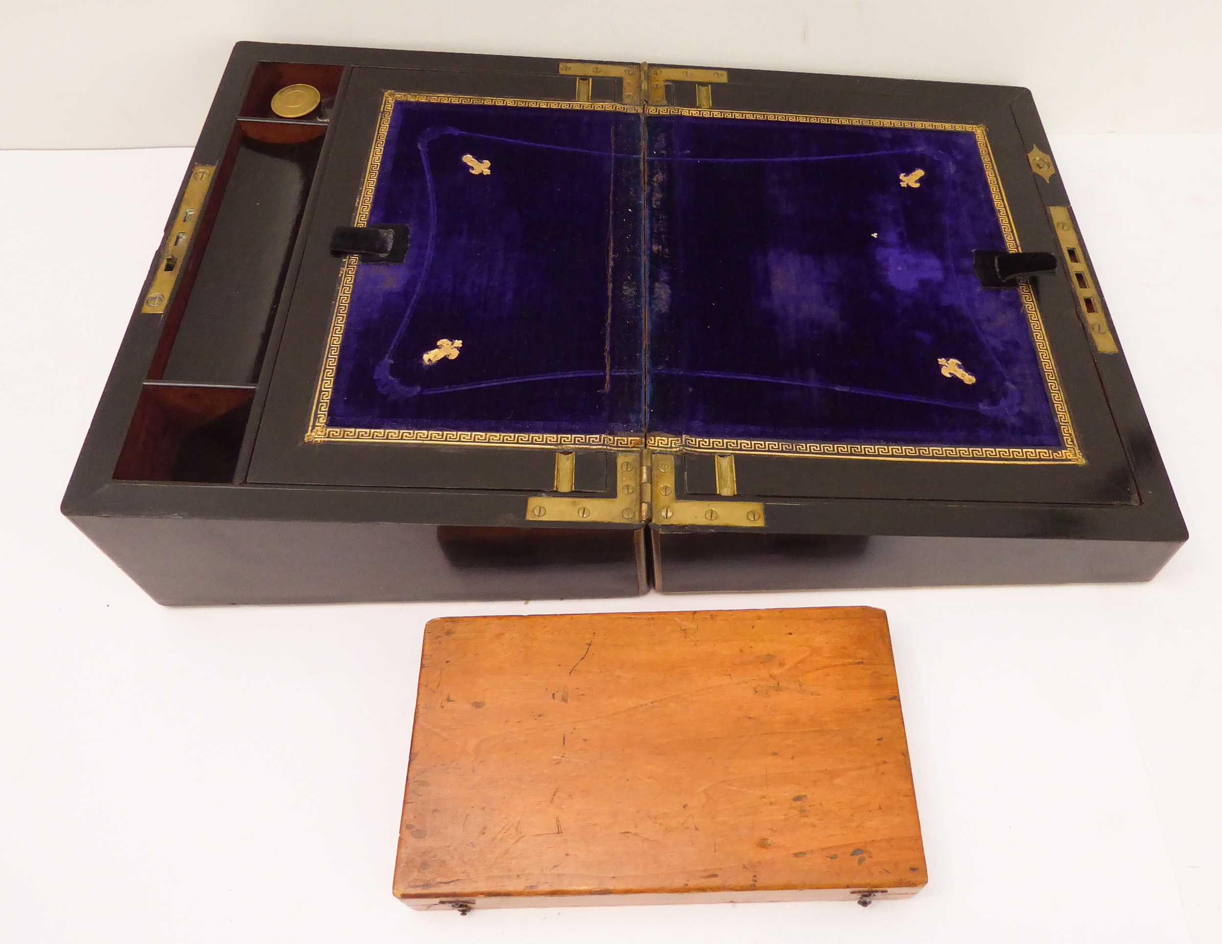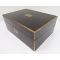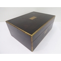 A mid-19th century brass-bound calamander writing slope: hinged top opening to reveal gilt-tooled velvet interior writing surface, single inkwell, pen-rest and stamp slide (30.5 cm wide x 13 cm high)