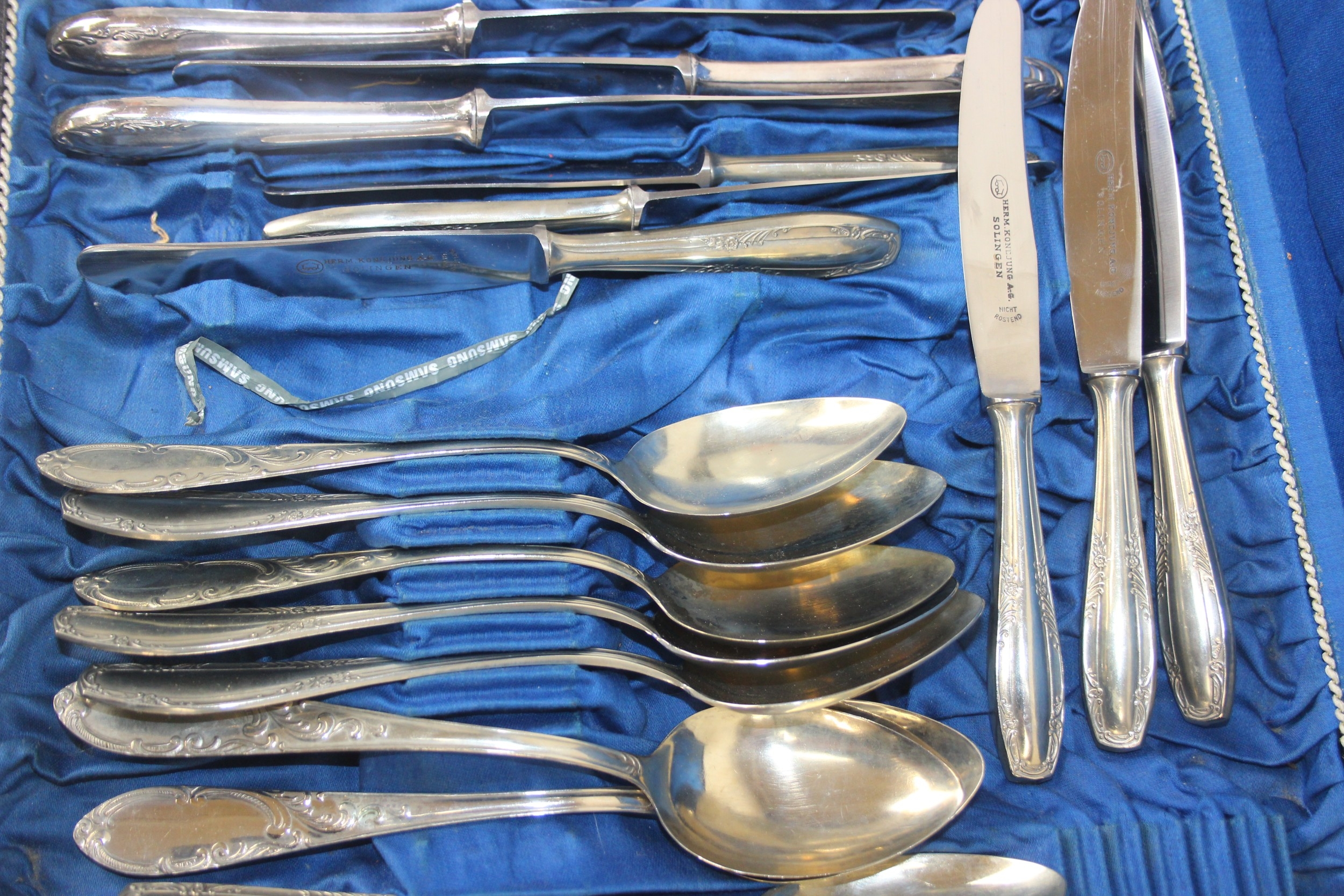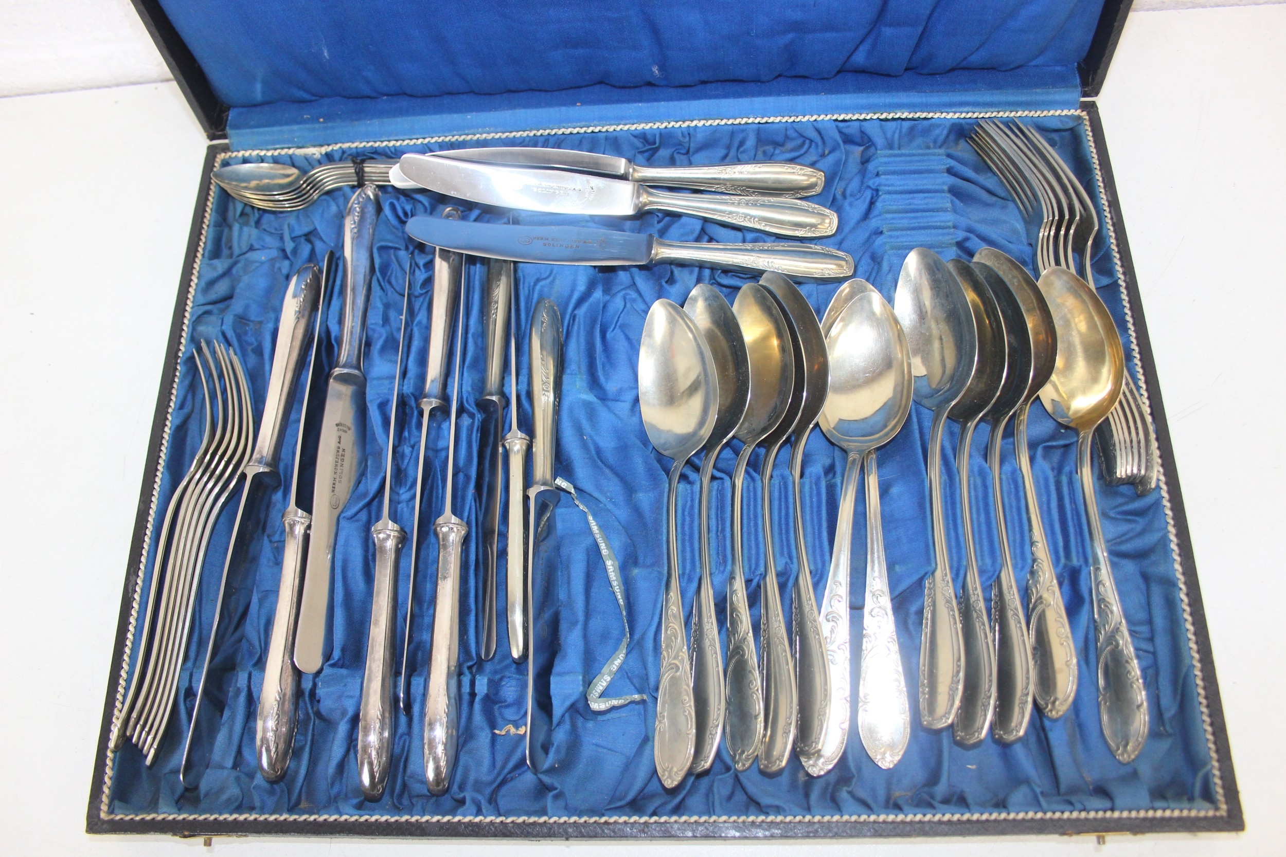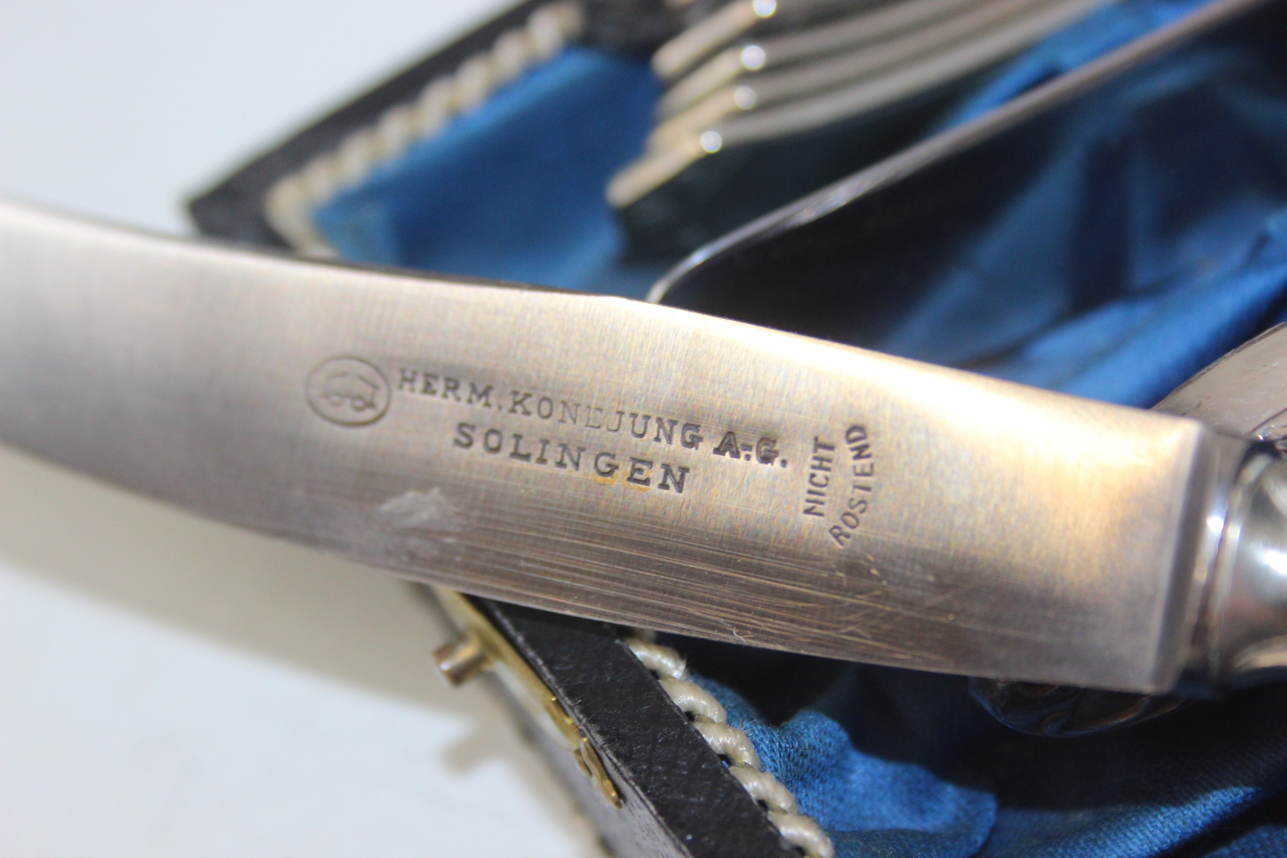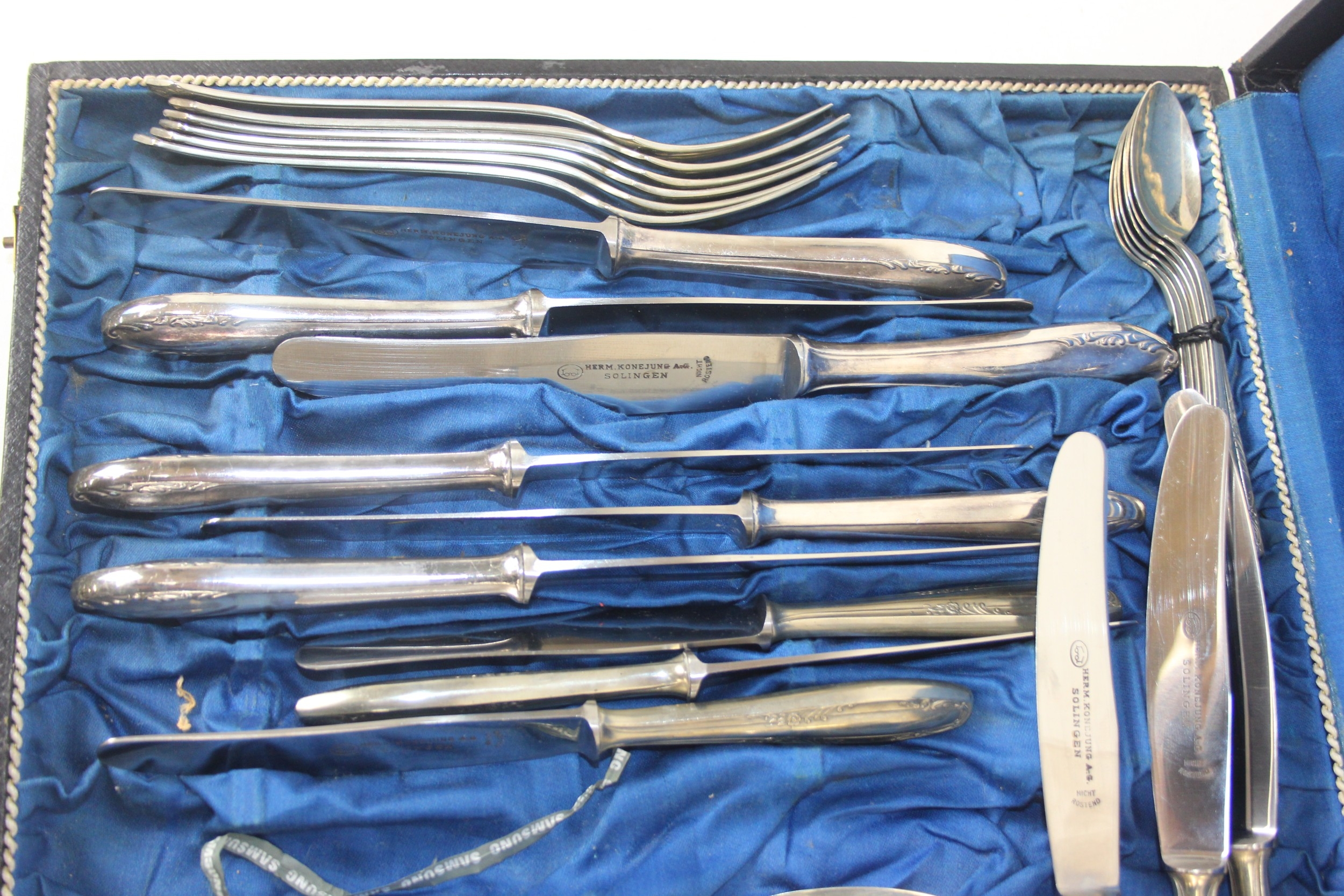 An antique boxed silver plated cutlery set, German "Neu Silber" by Herm Konejung A-G of Solingen, the majority of a six person setting