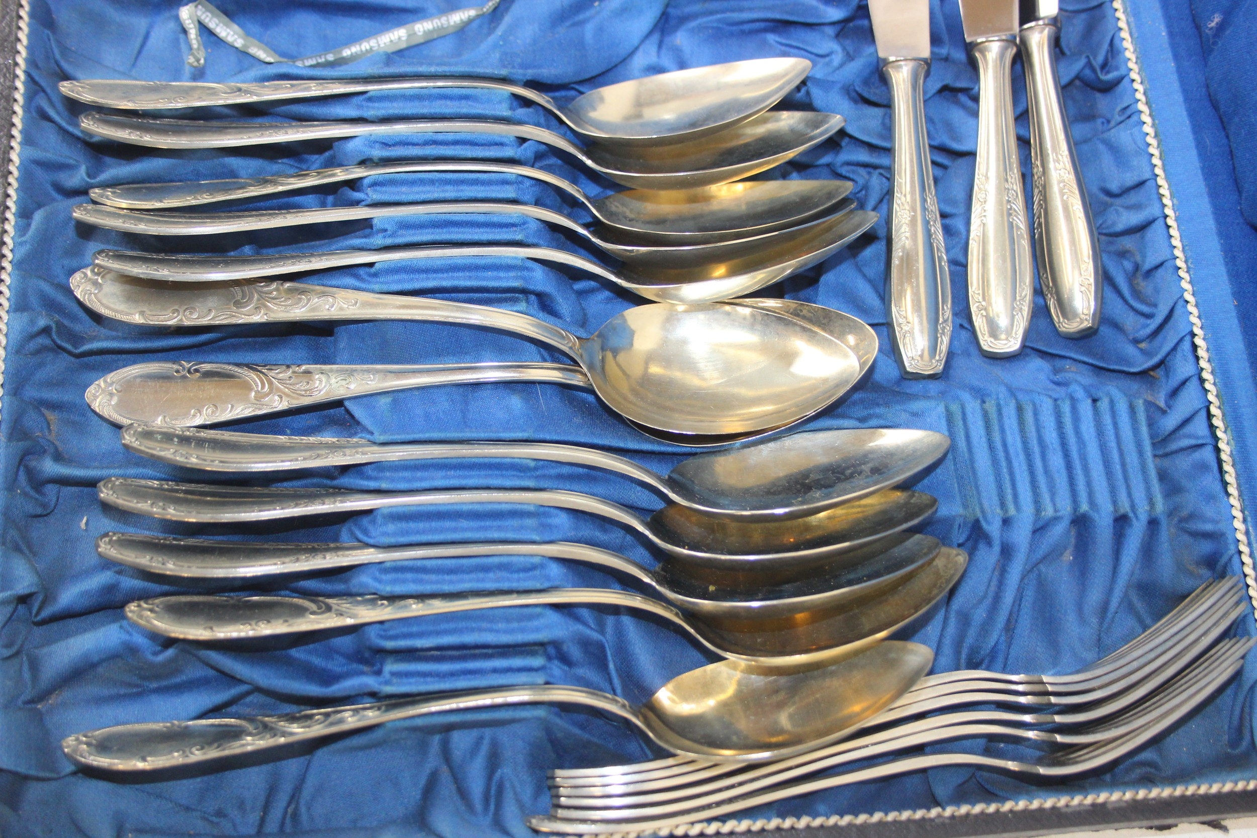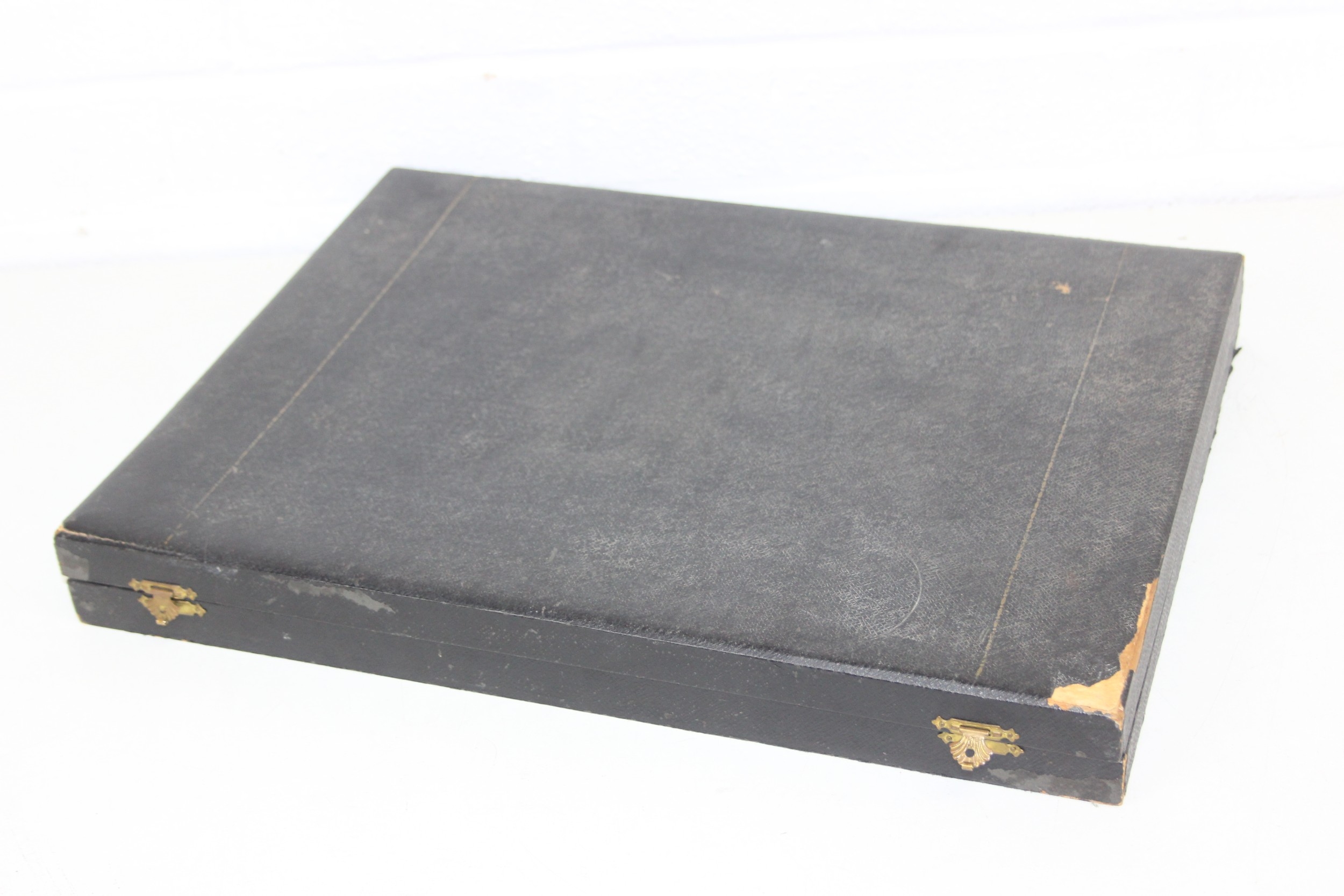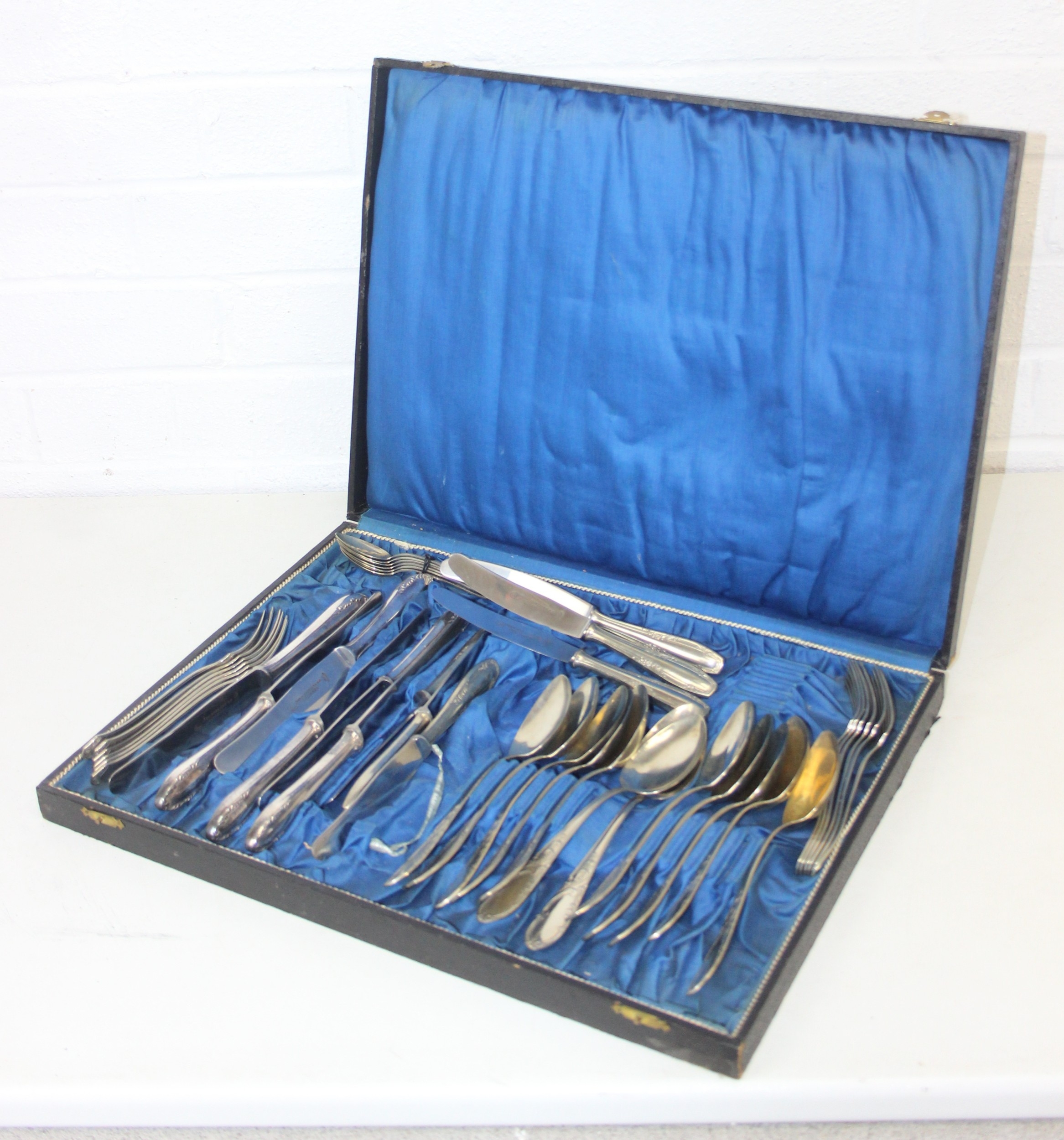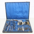 An antique boxed silver plated cutlery set, German "Neu Silber" by Herm Konejung A-G of Solingen, the majority of a six person setting