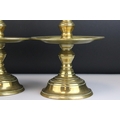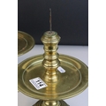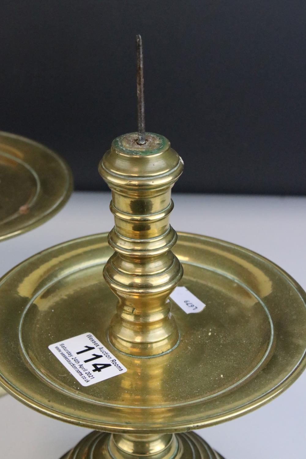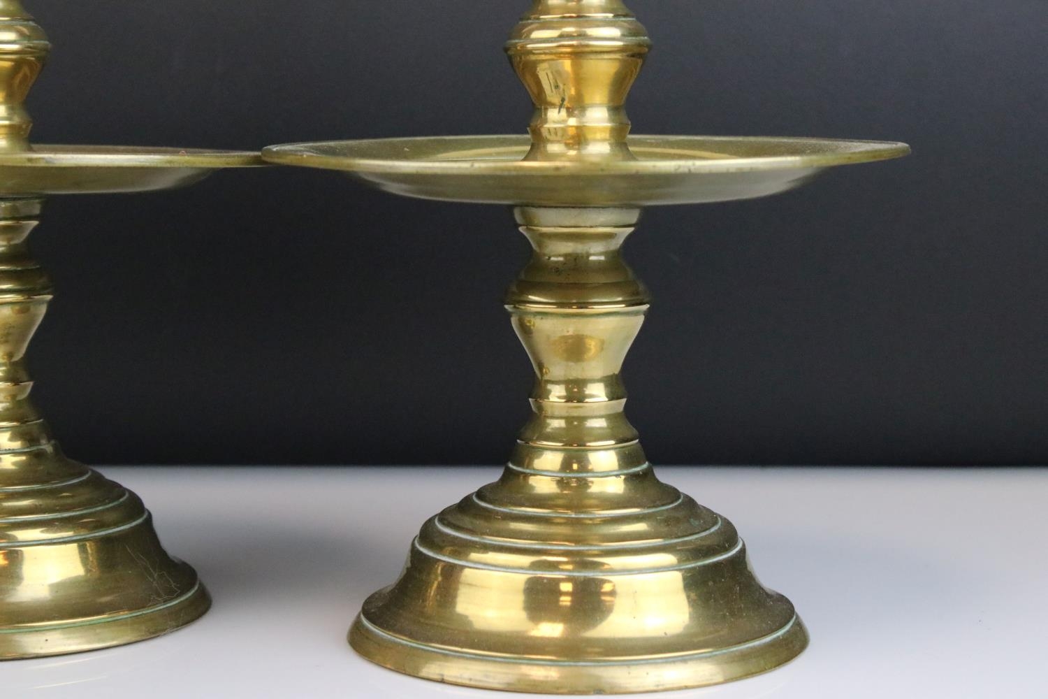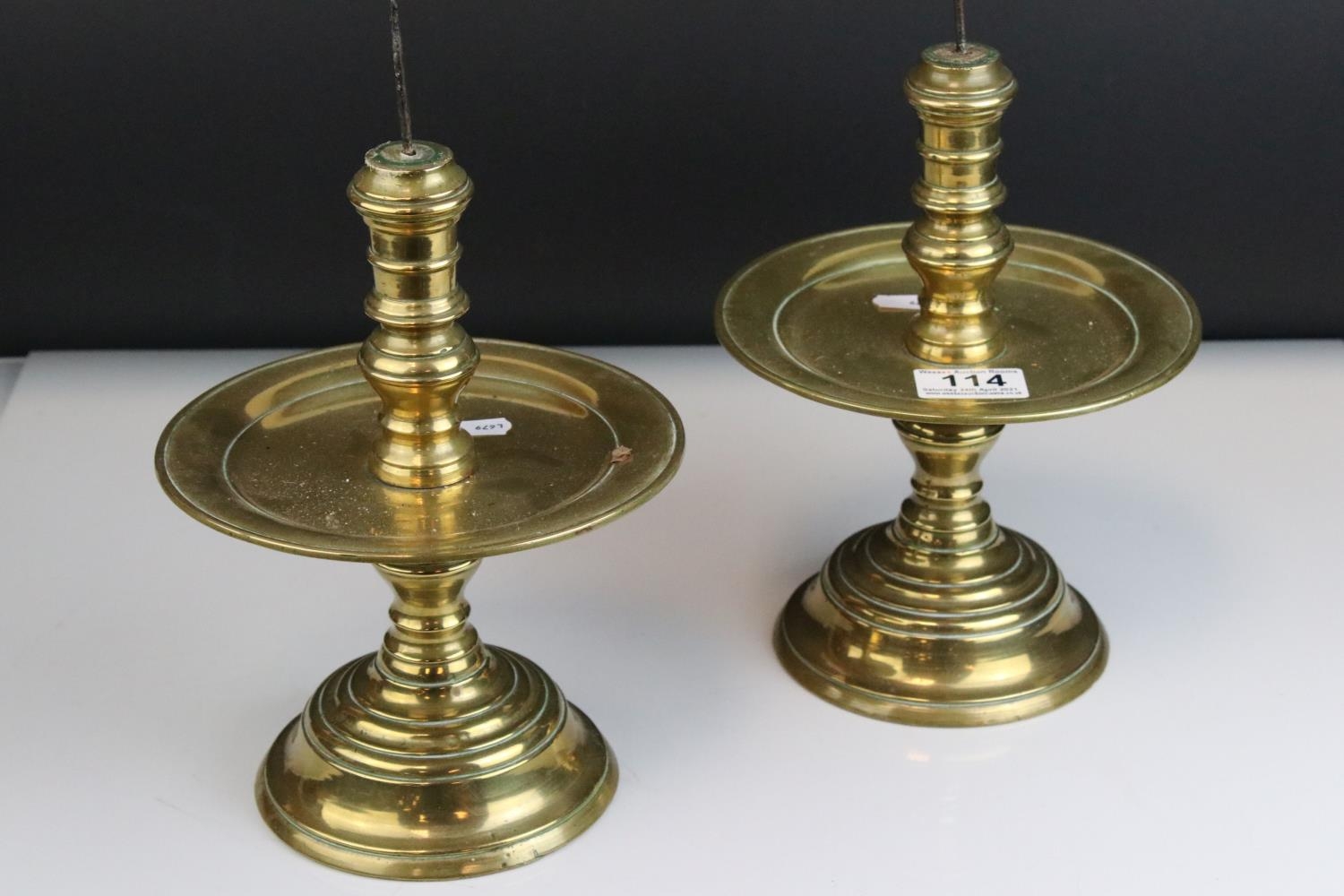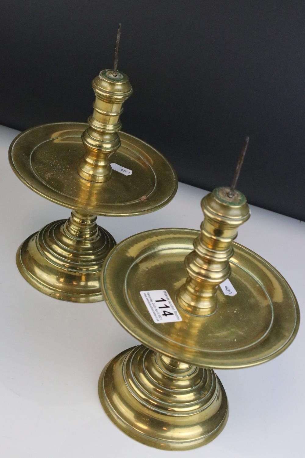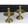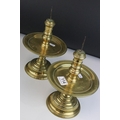 Pair of Brass Gothic / Ecclesiastical Candle Prickets with circular drip trays, 29cms high