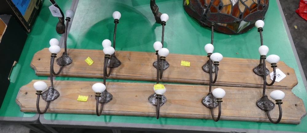 Two antique coat hooks with porcelain knobs, each length 80 cm