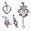 Silver Gemstone Pendant Collection incl. Amethyst, Topaz, Marcasite. Each pendant is stamped sterling silver. All stones are secure and intact, some minor surface wear to the round Amethyst stone in the foliate pendant. Weighs in total 23g.