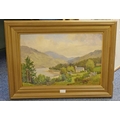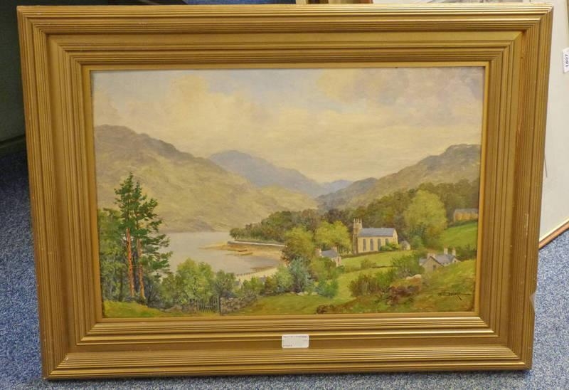 W. DICKIE, HIGHLAND LOCH SCENE WITH CHURCH, SIGNED, GILT FRAMED OIL PAINTING, 34.5 X 52CM