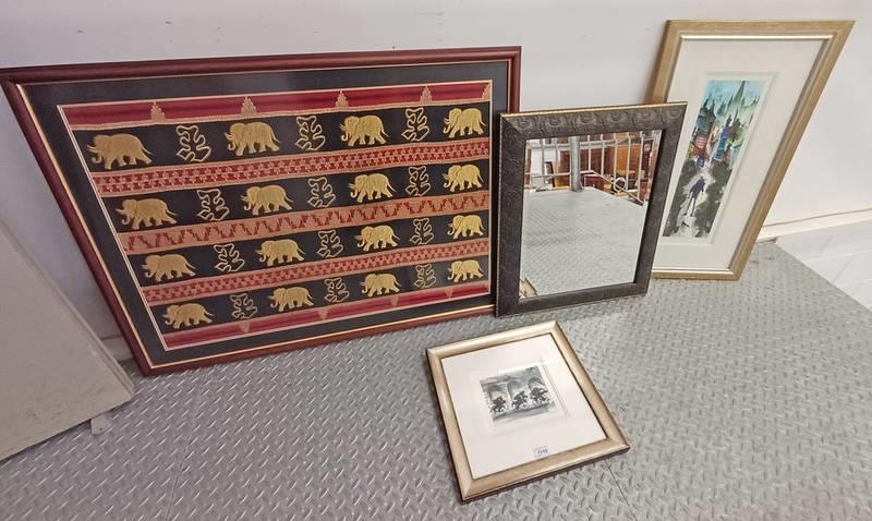 NEEDLEWORK DEPICTING ELEPHANTS, S.F. HOWELLS HANDBAG AND GLADRAGS, FRAMED PRINT, SIGNED IN PENCIL, ETC LARGEST : 71 CM X 97 CM