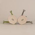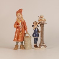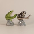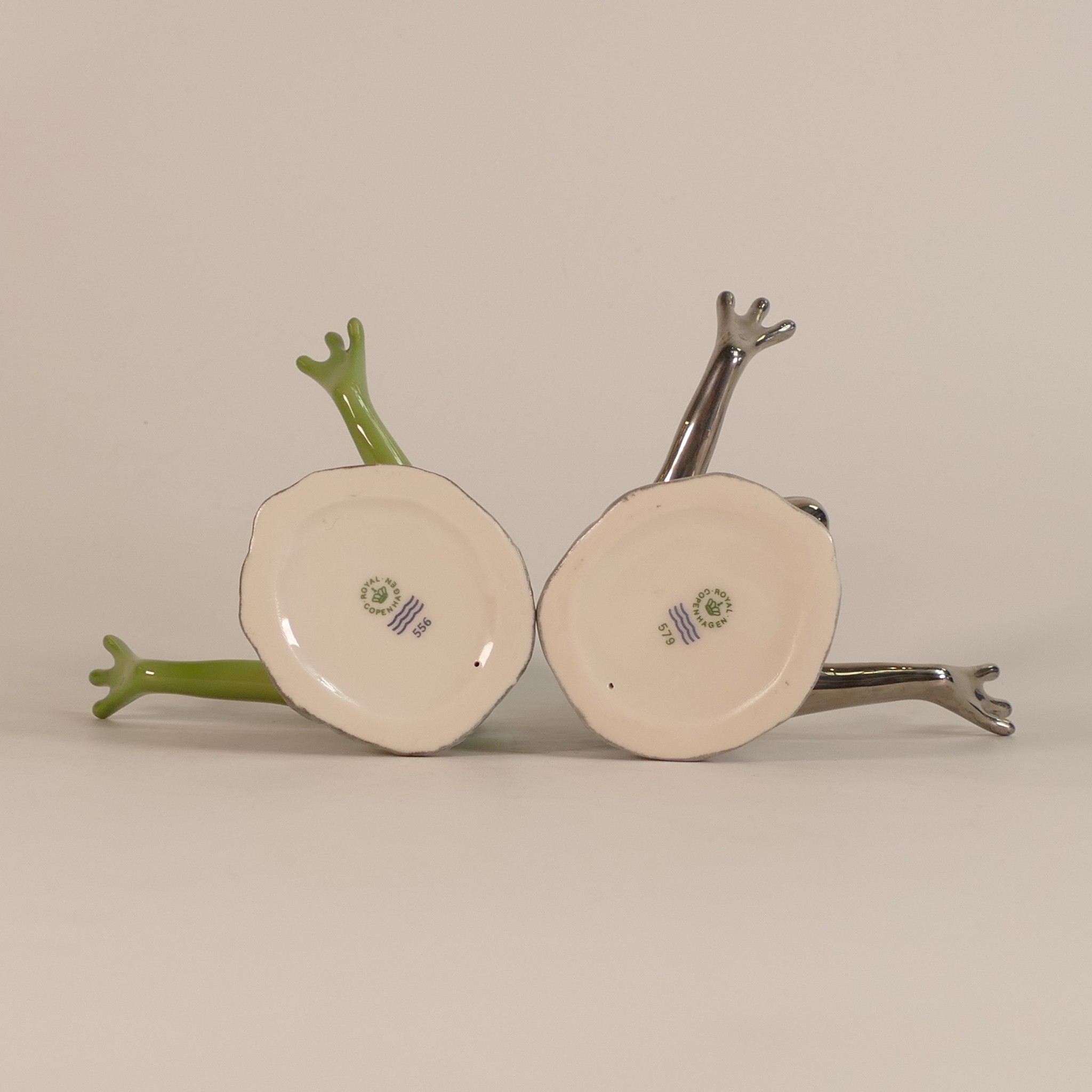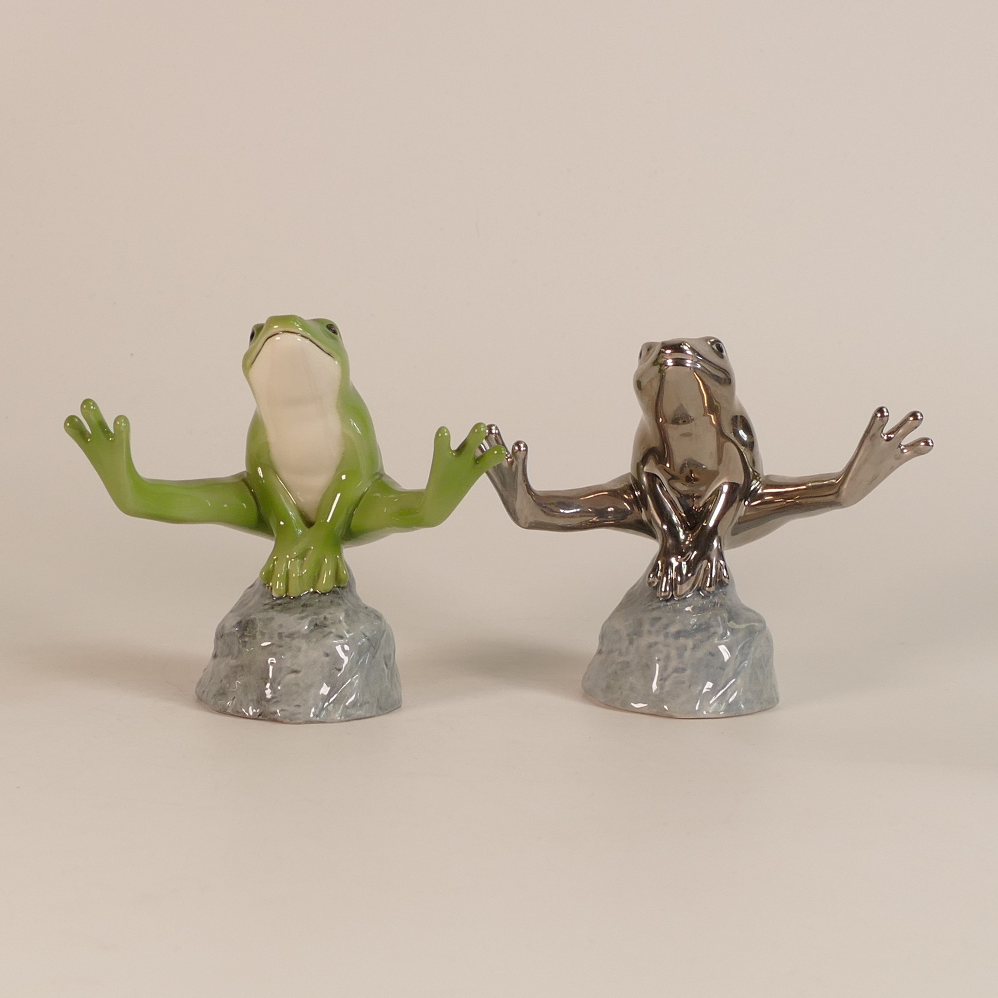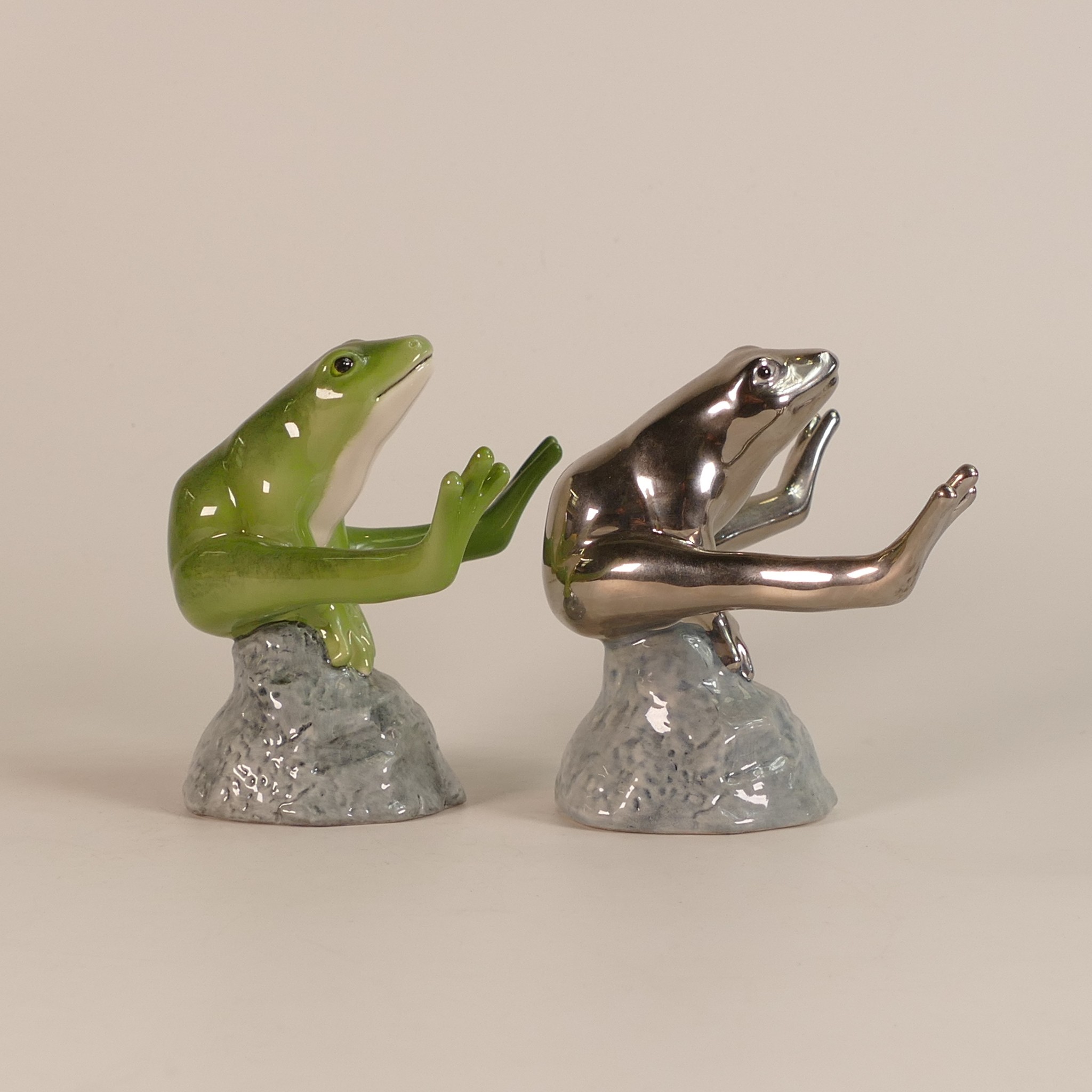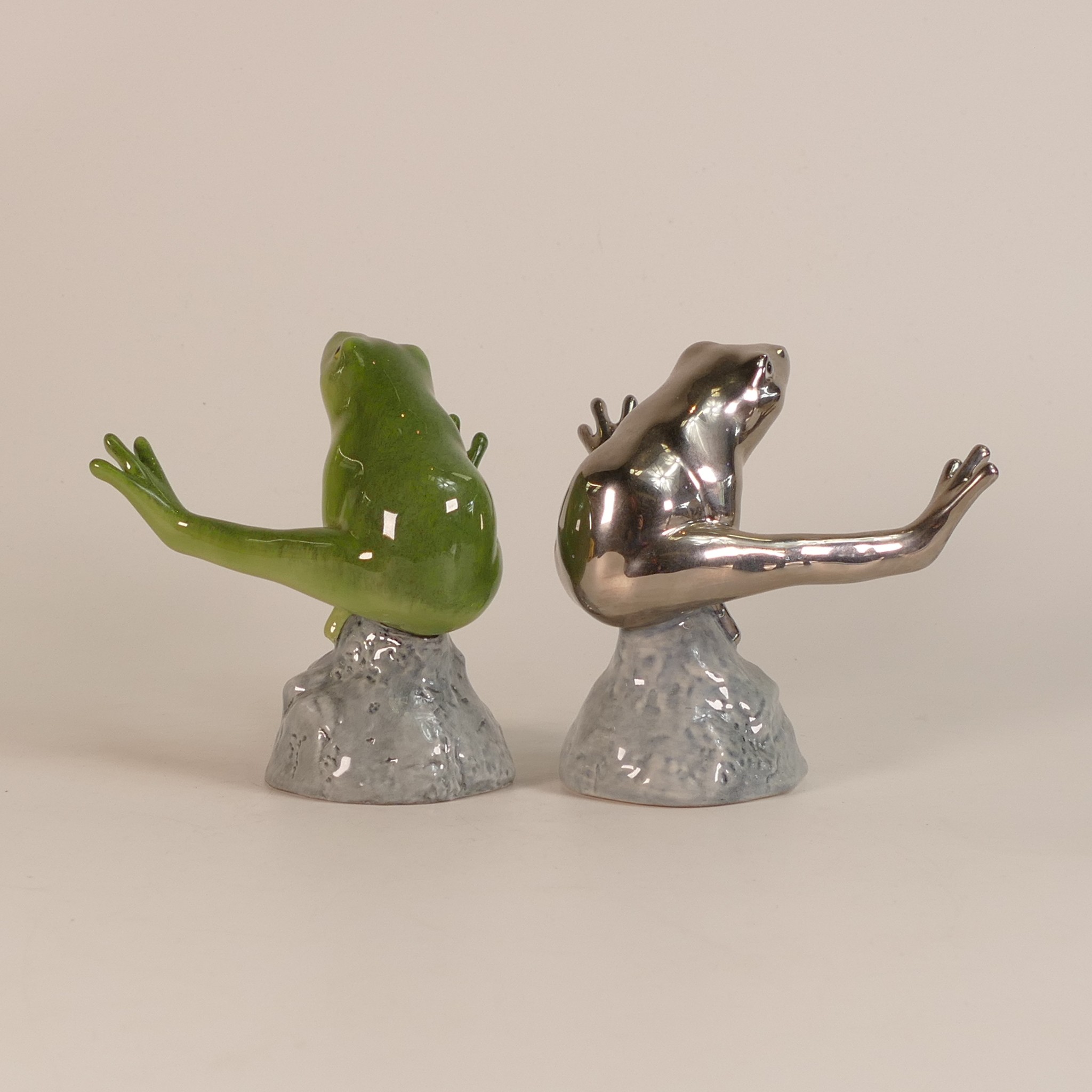 Royal Copenhagen porcelain models of frogs leapfrogging, in green/blue colourway and similar model in silver, h. 11.5cm. (2)
