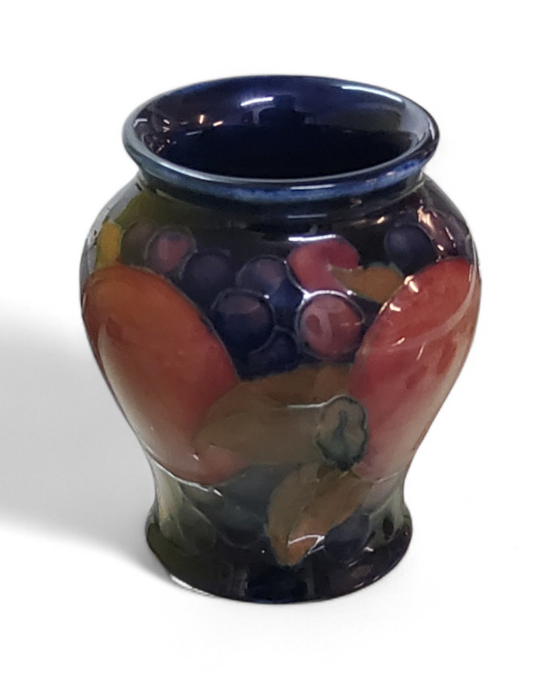 A Moorcroft Pomegranate pattern baluster vase, tube lined with fruit and berries, in tones of red, purple, blue and green, 8.5cm high, impressed mark