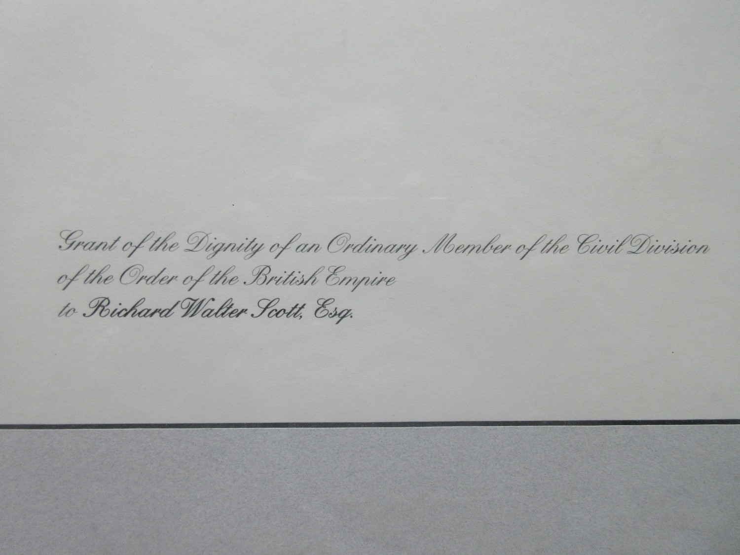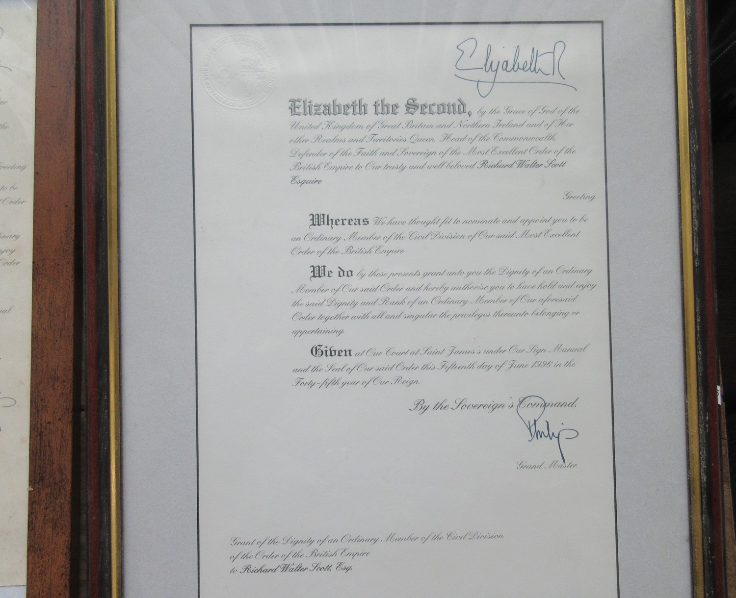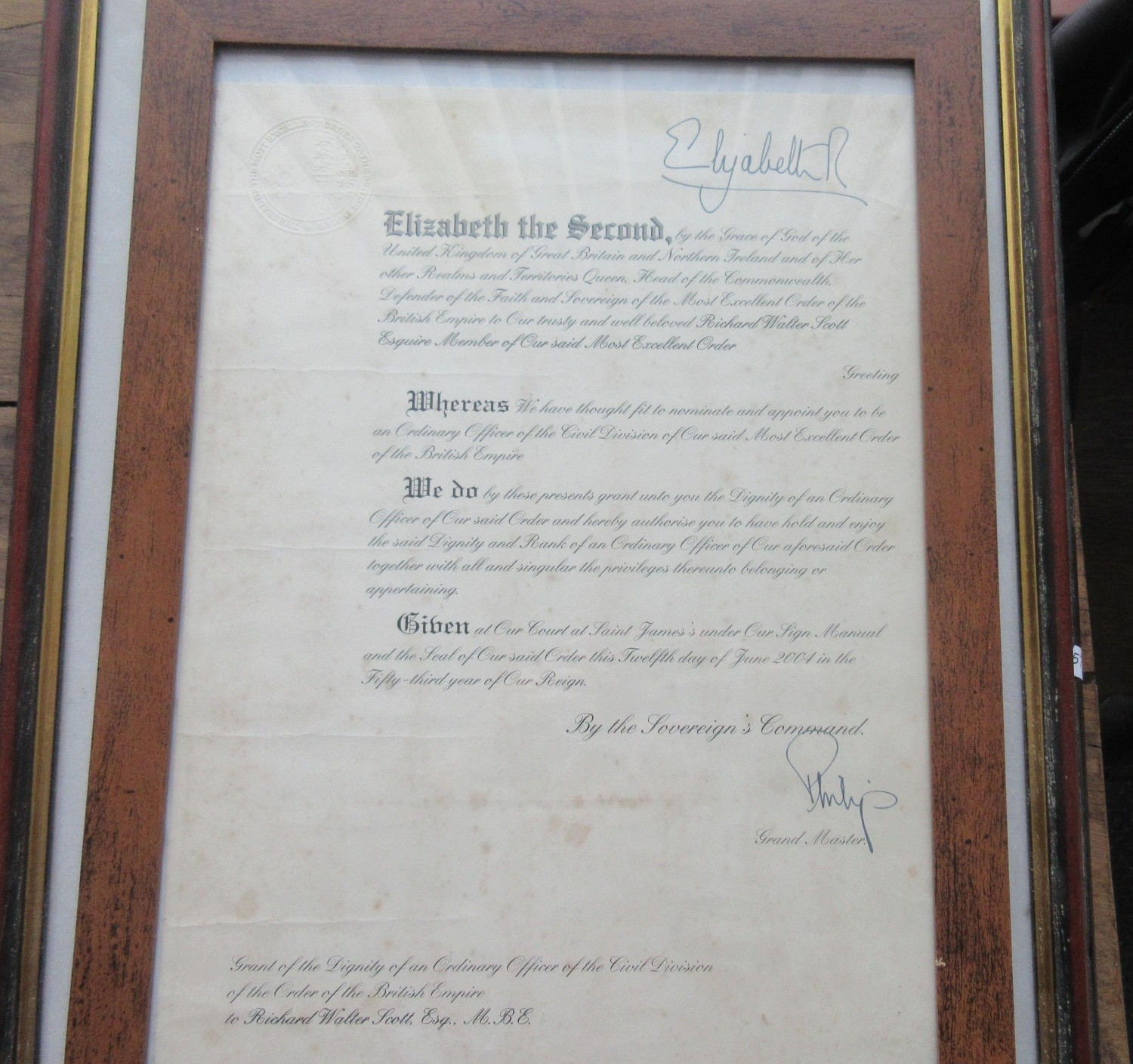 M.B.E. Awarded to Richard Walter Scott June 2004. In original presentation case with miniature, complete with framed citation. Richard was also awarded the O.B.E in 1996(medal still with family) framed citation, photographs of the ceremony with Queen Elizabeth II, videos and booklets about the ceremony.