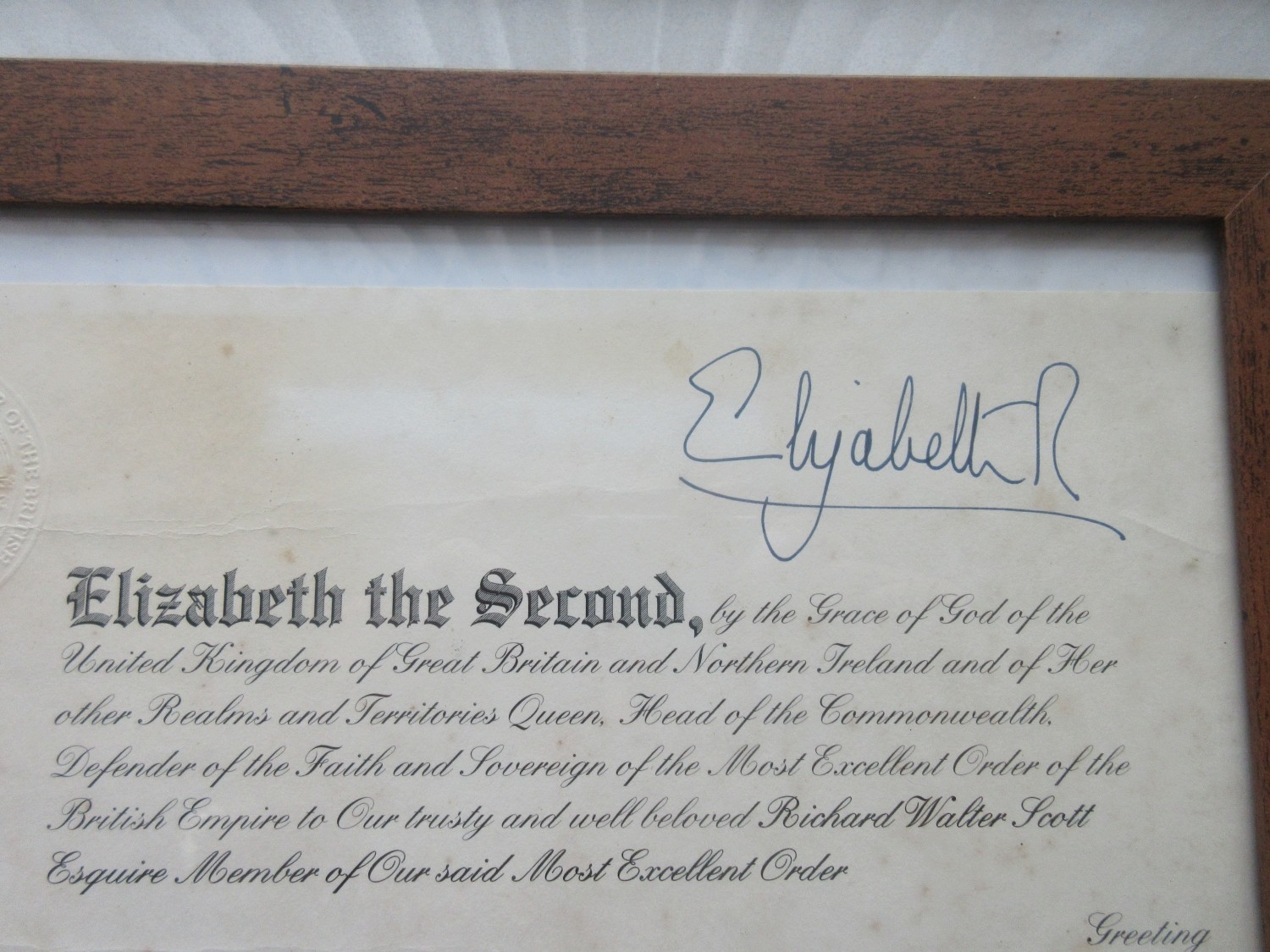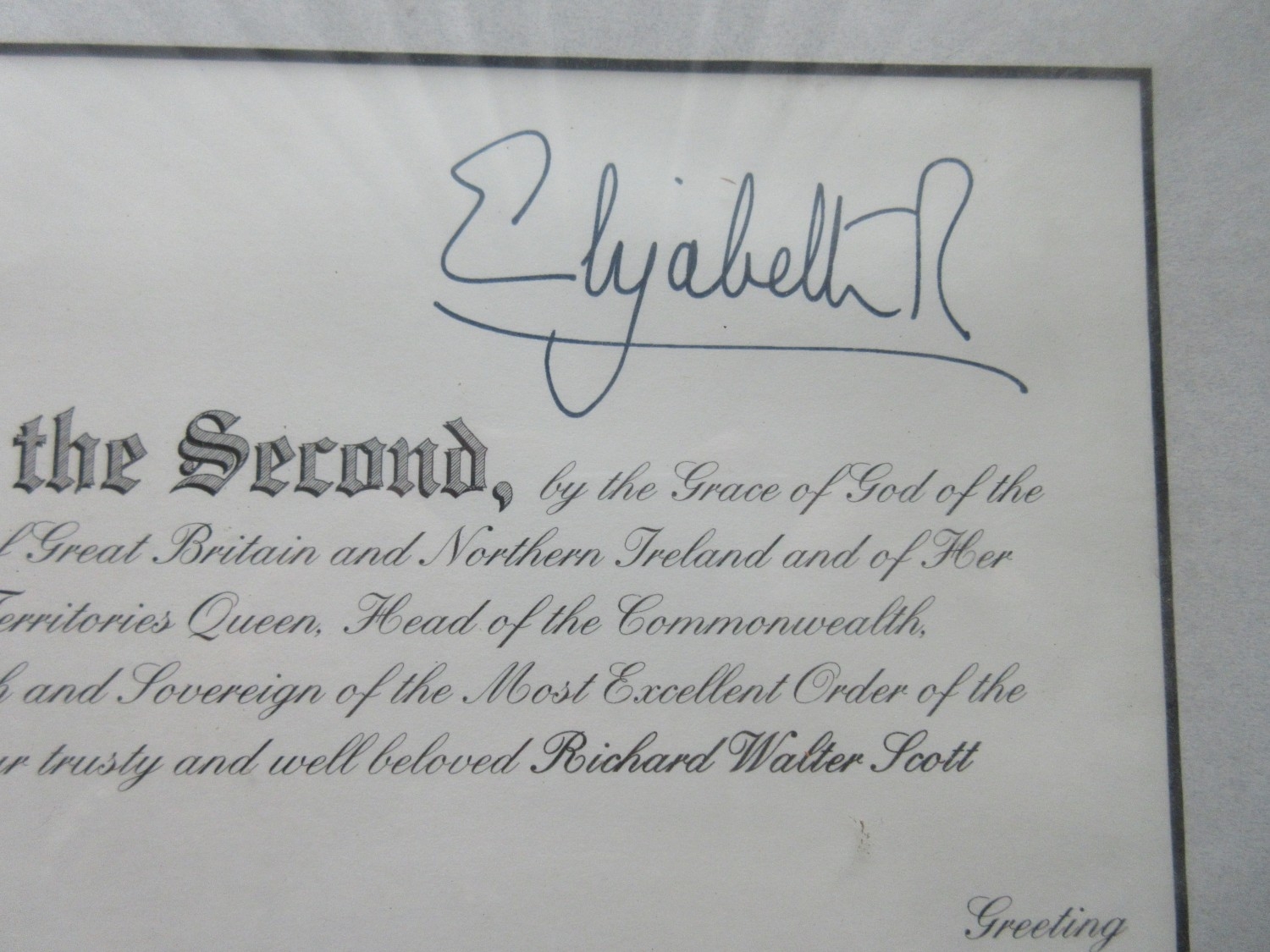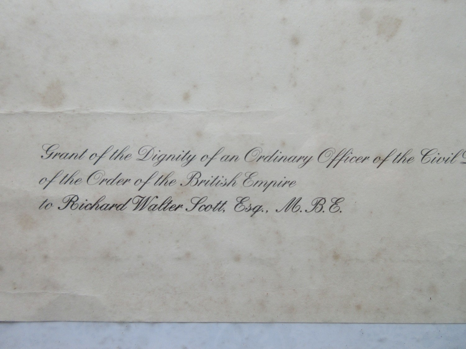 M.B.E. Awarded to Richard Walter Scott June 2004. In original presentation case with miniature, complete with framed citation. Richard was also awarded the O.B.E in 1996(medal still with family) framed citation, photographs of the ceremony with Queen Elizabeth II, videos and booklets about the ceremony.
