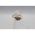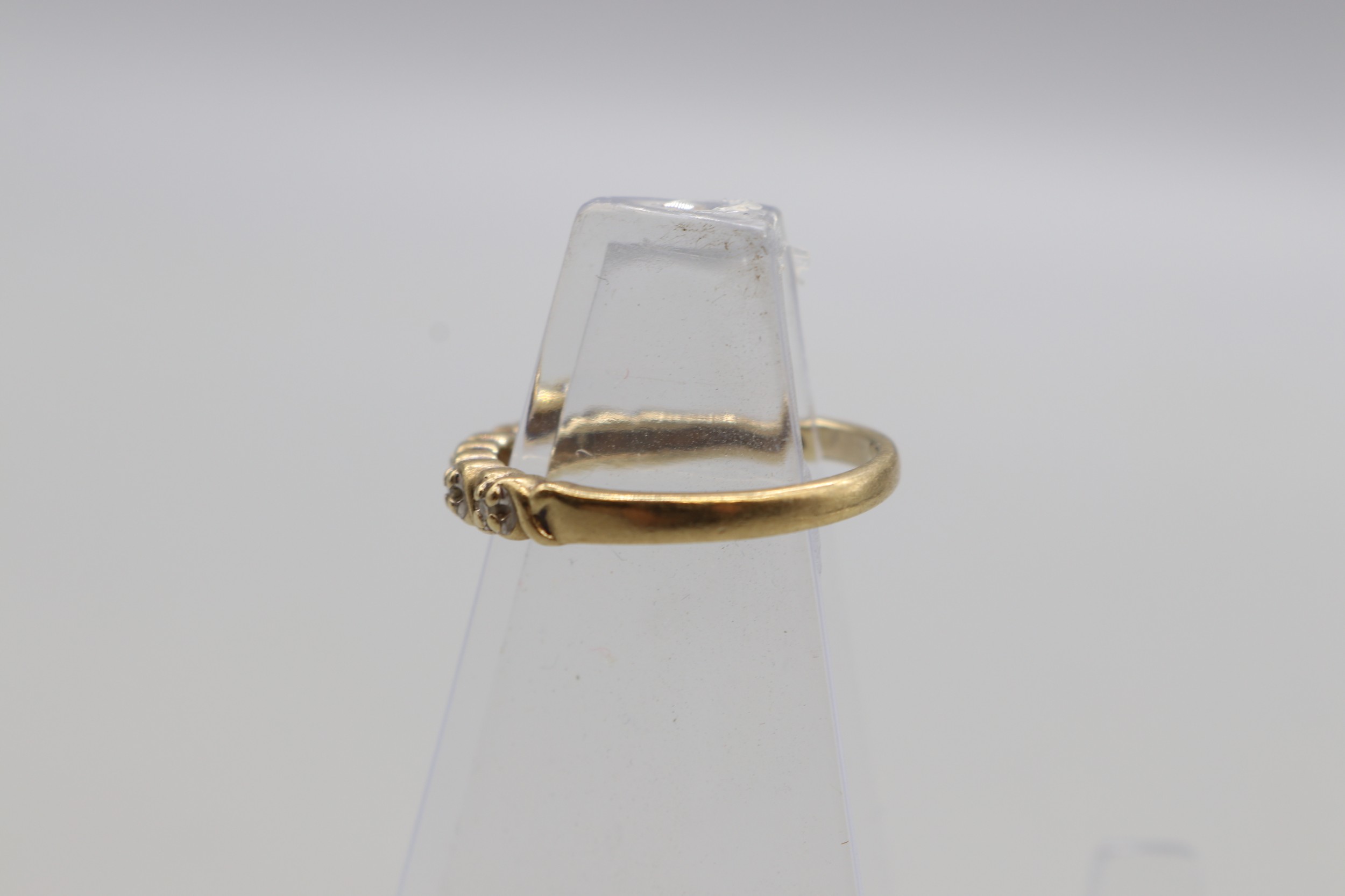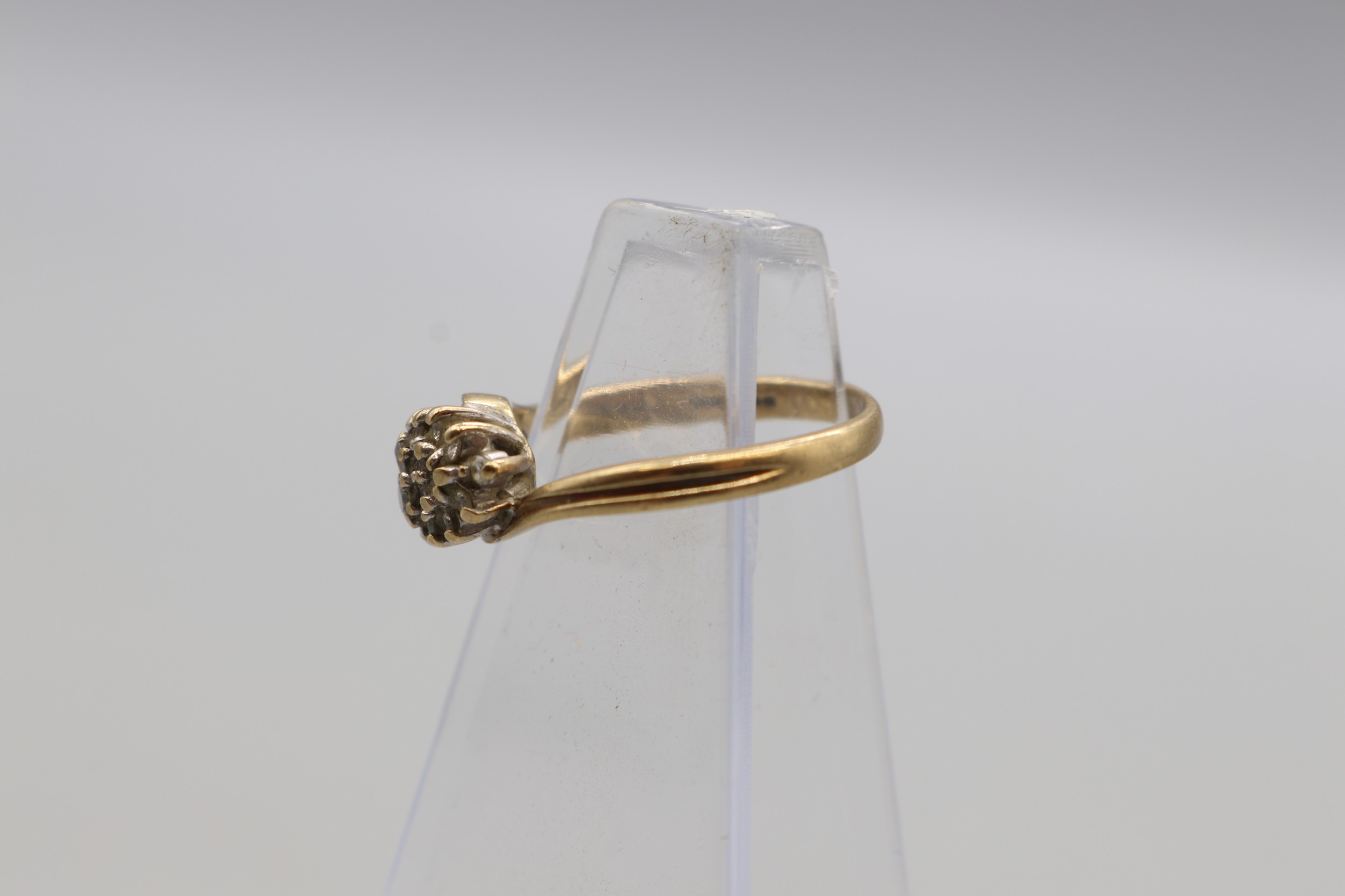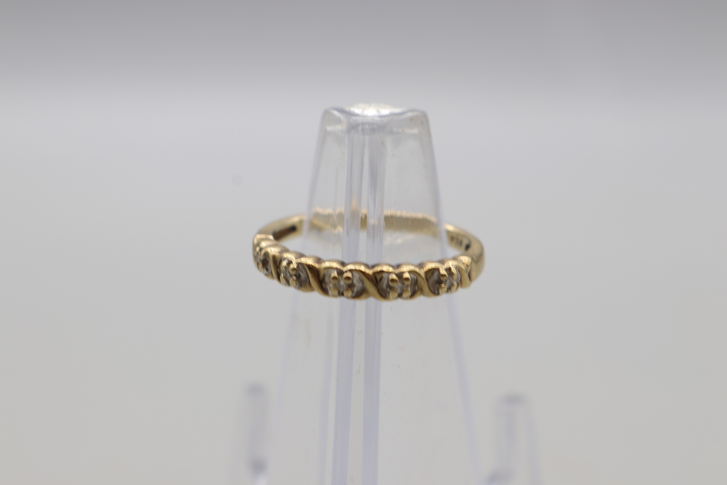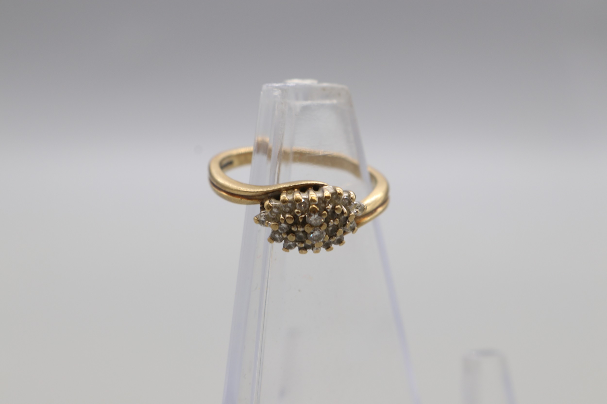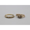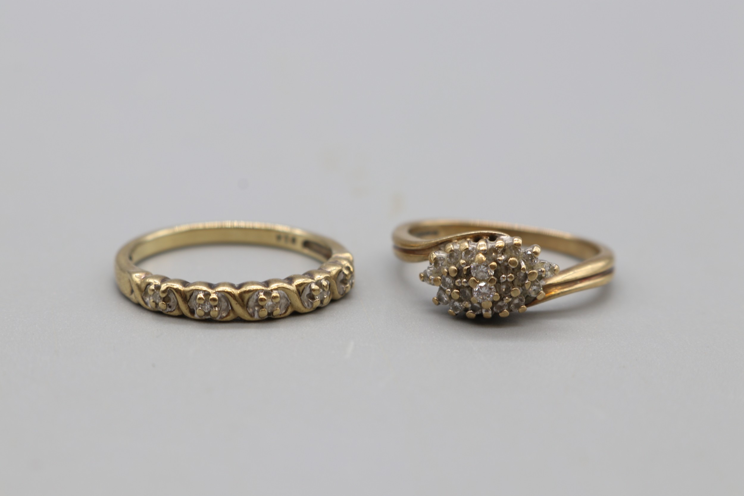 Two yellow gold diamond rings, comprising a hallmarked 9ct yellow gold diamond cluster ring with twist-style band, size K, weight 2.6g; and a yellow metal twist design half eternity ring, weight 1.74g, size N.5