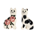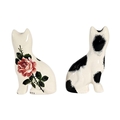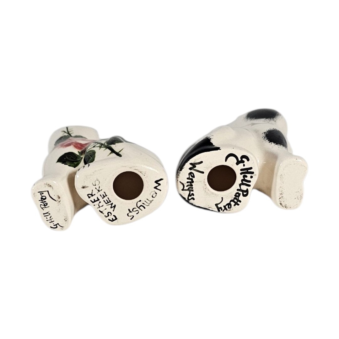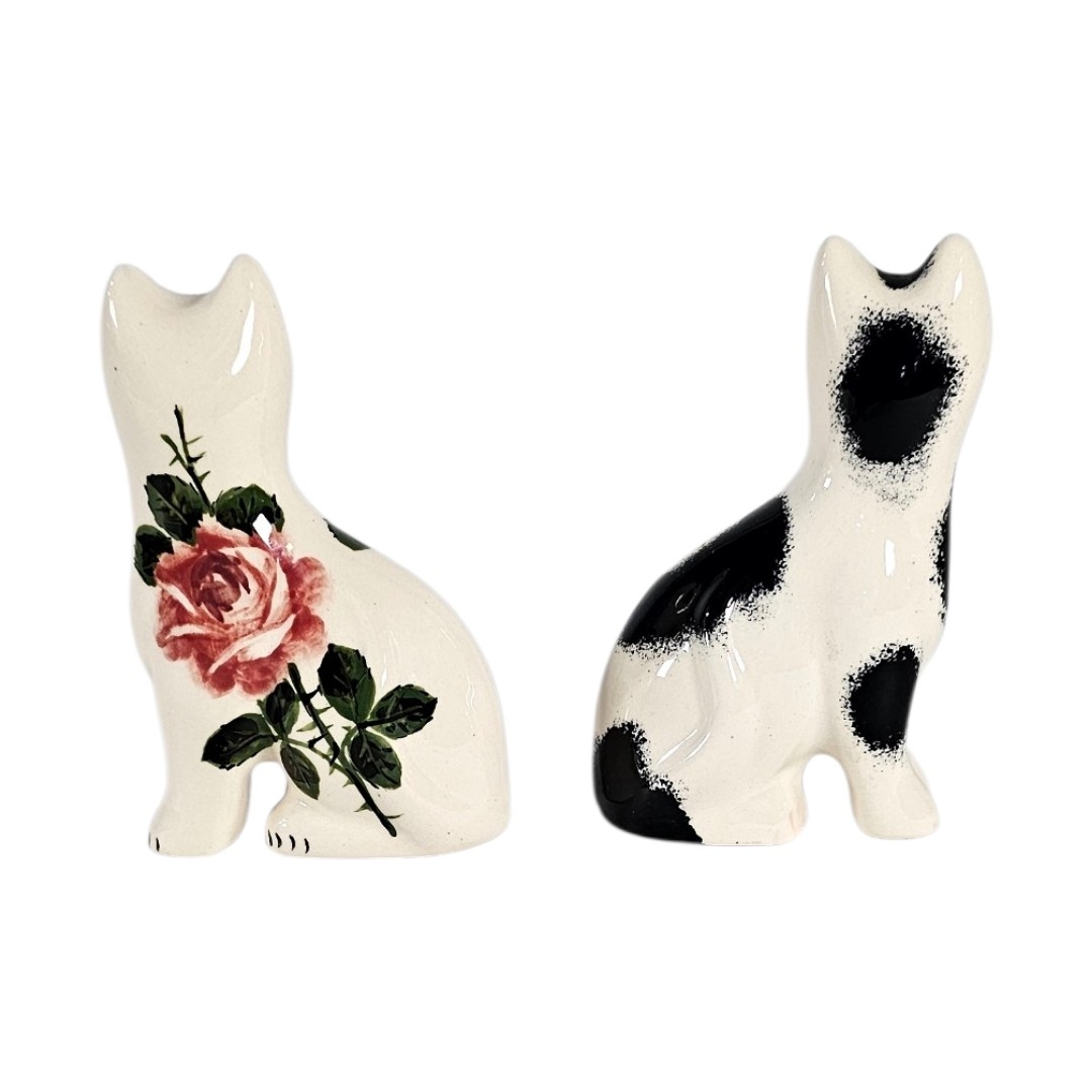 Modelled by G. Hill Pottery, Wemys, one signed Ester Weeks, one hand painted with cabbage roses, signed ‘Ester Weeks’, the other with sponged black markings, both featuring characteristic green eyes and a high gloss glaze.
