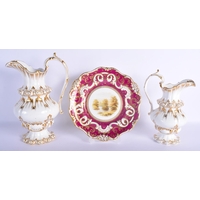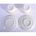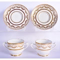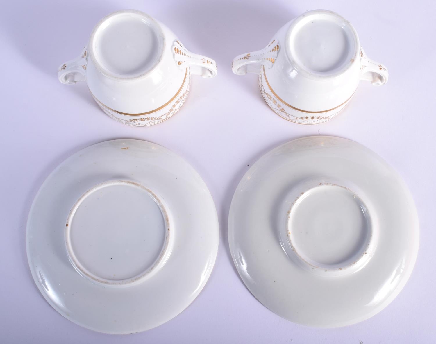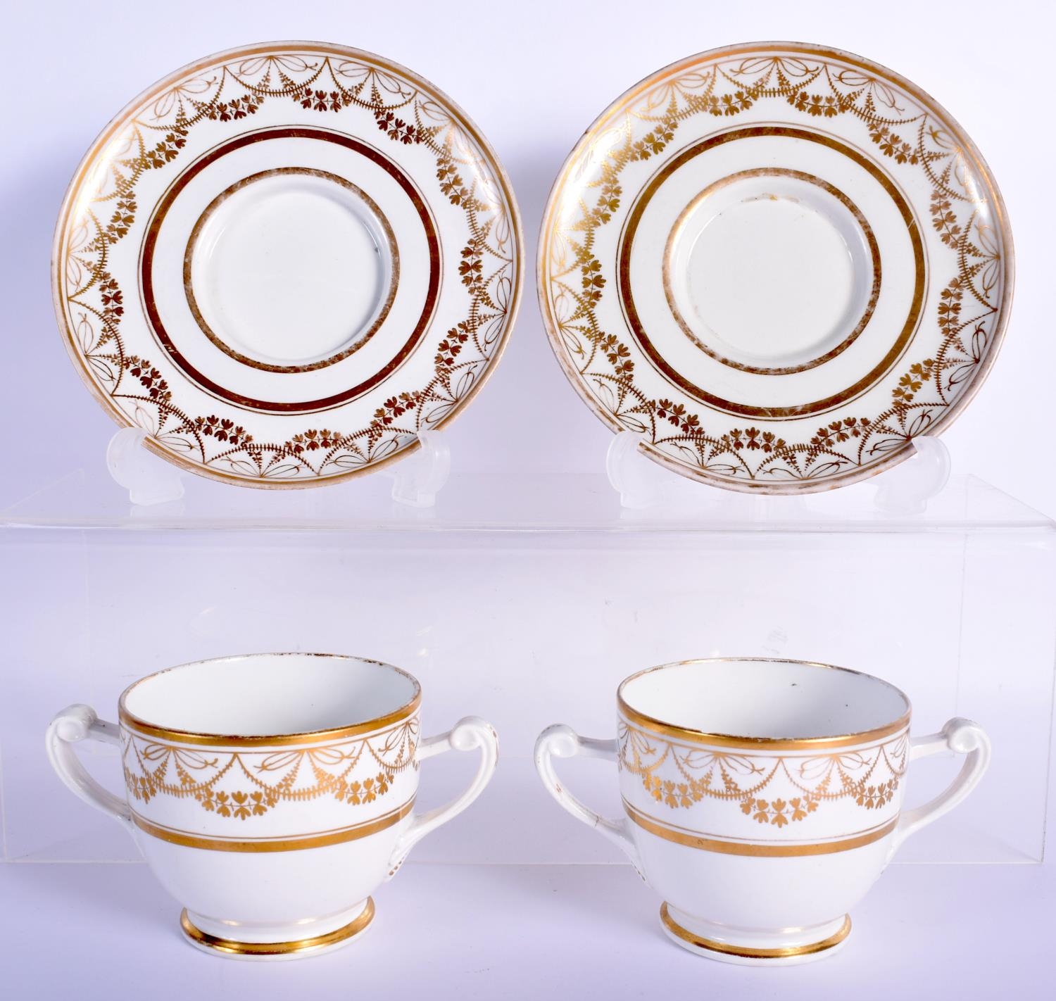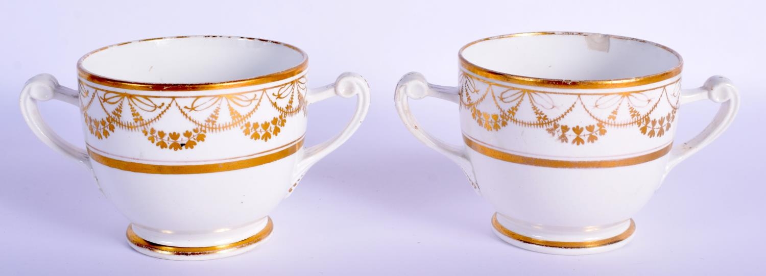 A PAIR OF EARLY 19TH CENTURY TWIN HANDLED GILDED CUPS AND SAUCERS Coalport or Derby, painted with neo classical swags. 13 cm wide. (4)