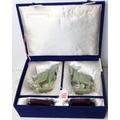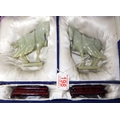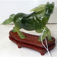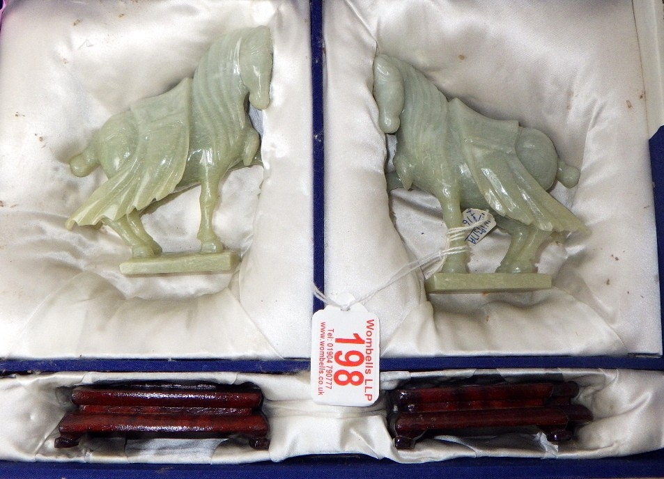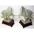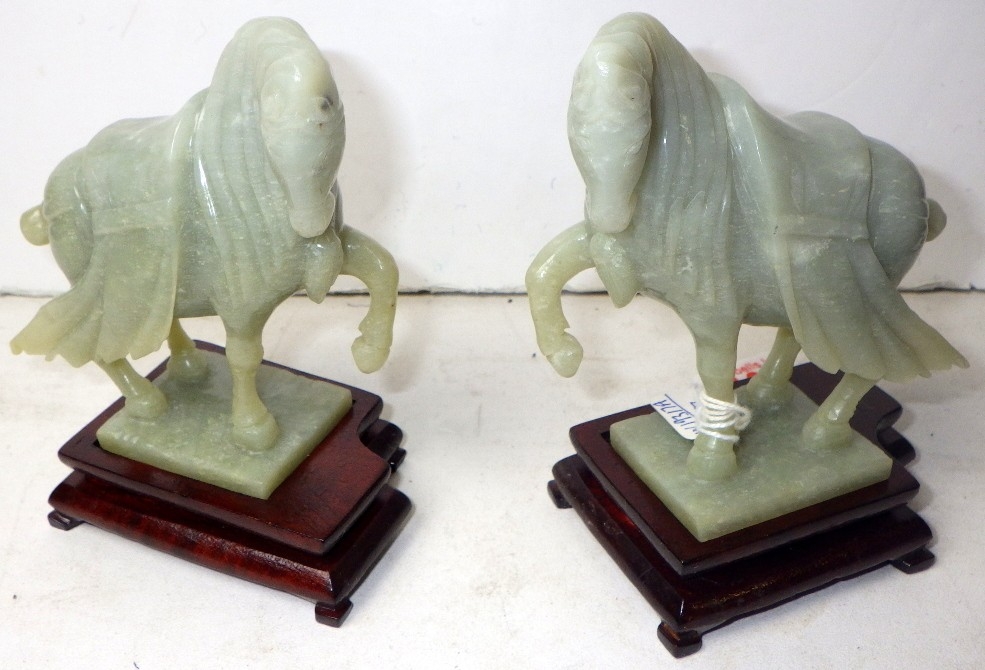 A pair of circa 1960s / 1970s Chinese jade carved warhorses on wooden stands