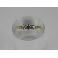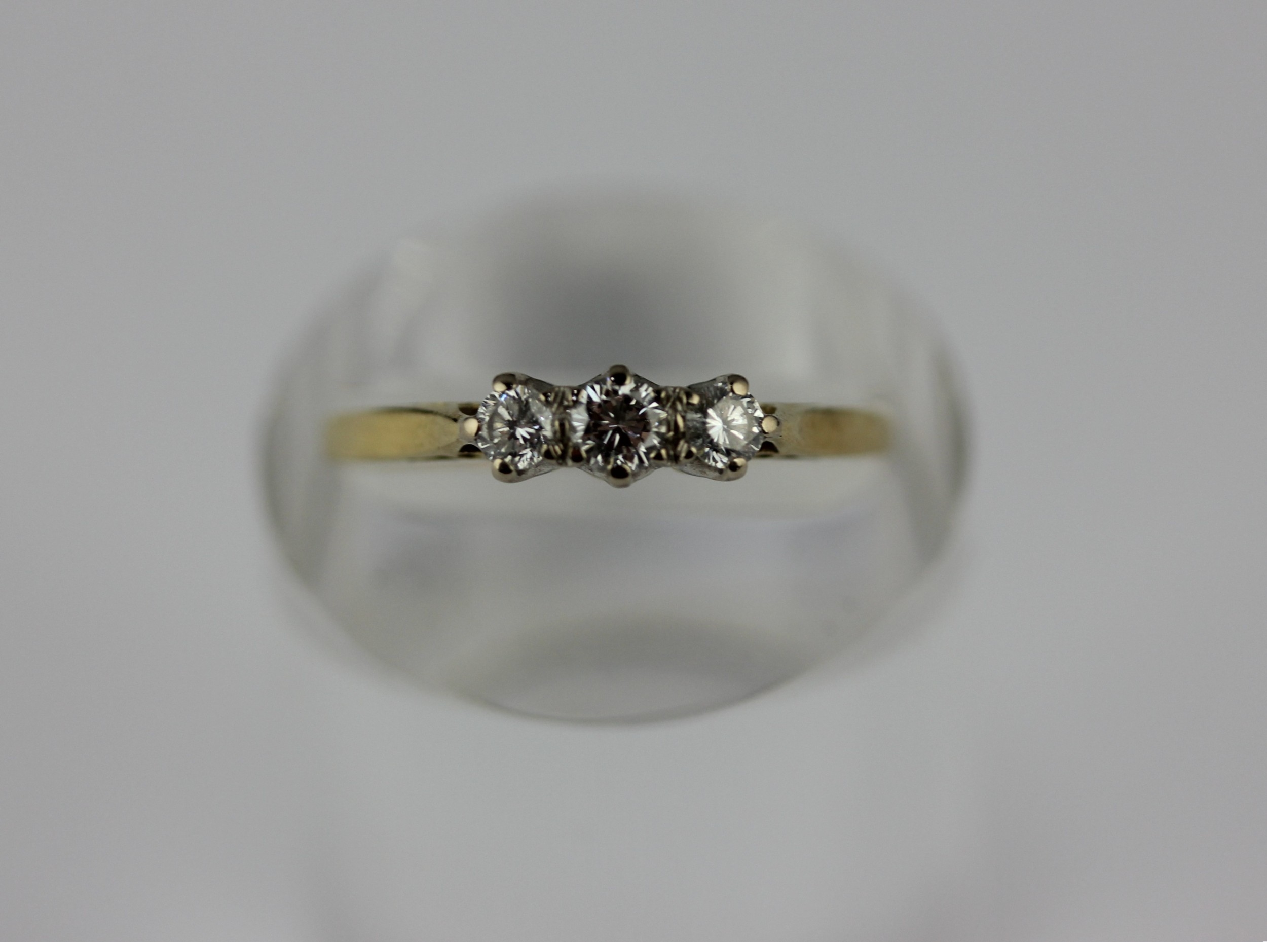 An 18ct gold and diamond three stone ring claw set with a row of circular cut diamonds, ring size P and gross weight 2g