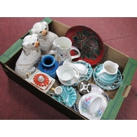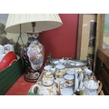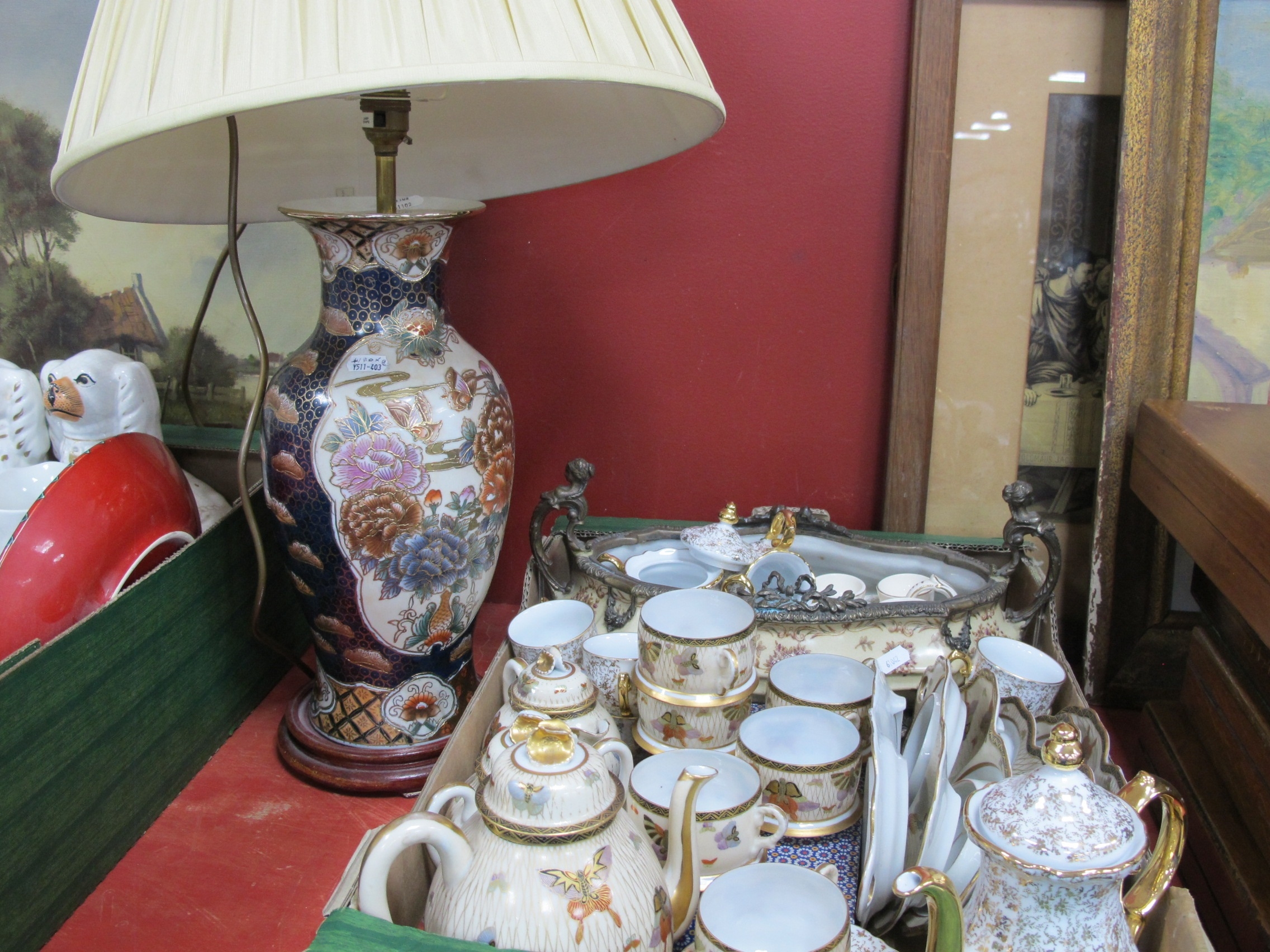 Oriental Items, to include vase converted into a table lamp, tea set comprising teapot, cups, saucers with attached side plate, a box of five Qin Dynasty style terracott model figures, other tea set and French style planter:- One Box