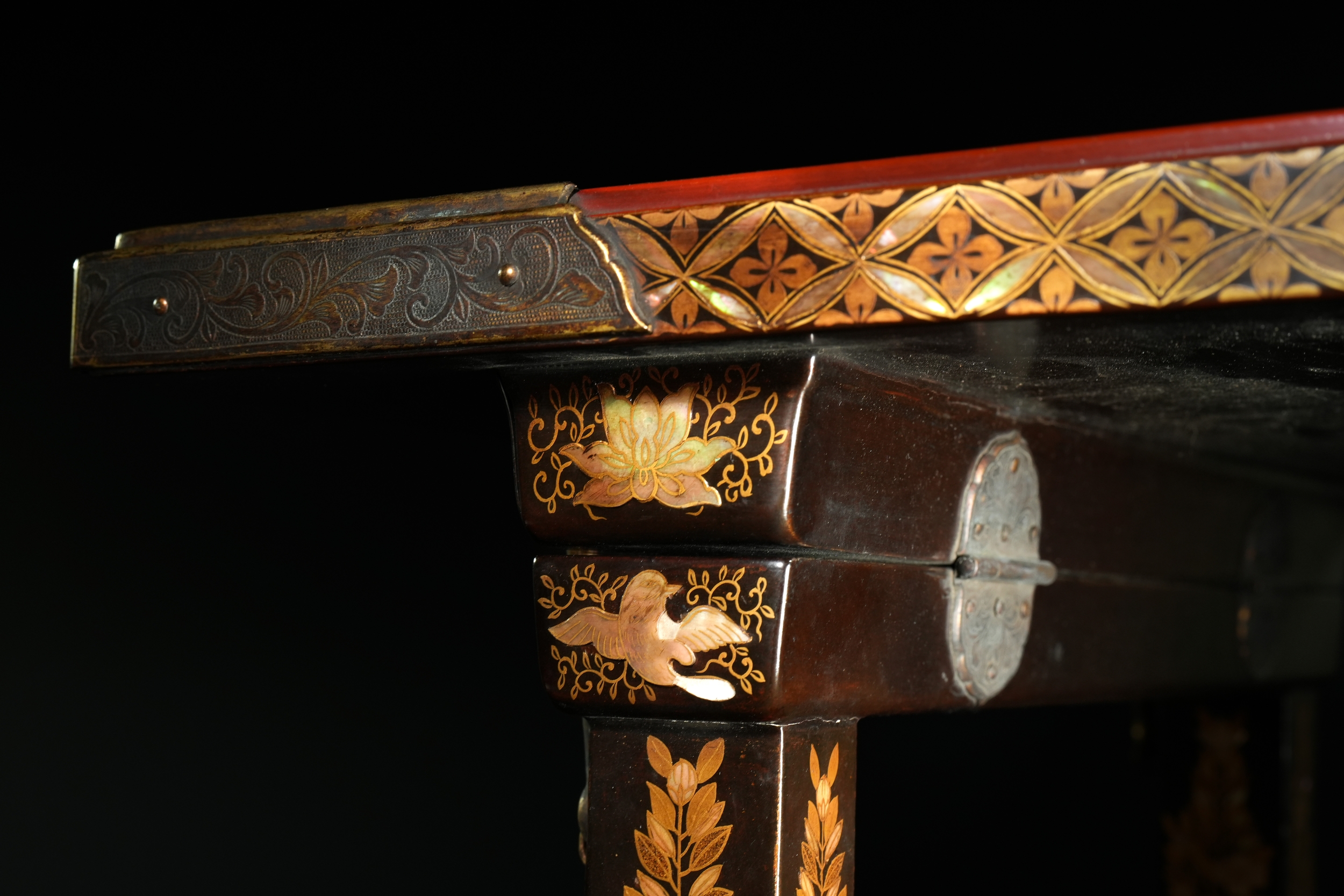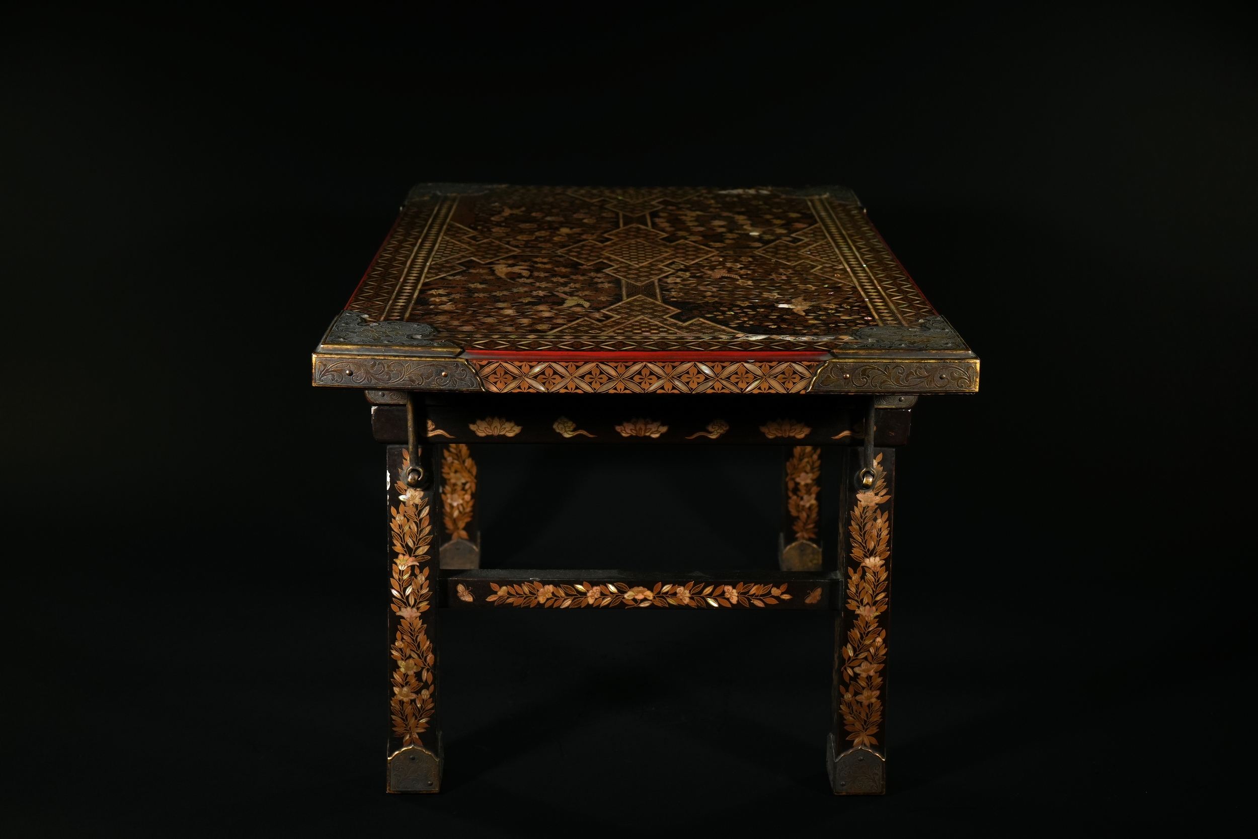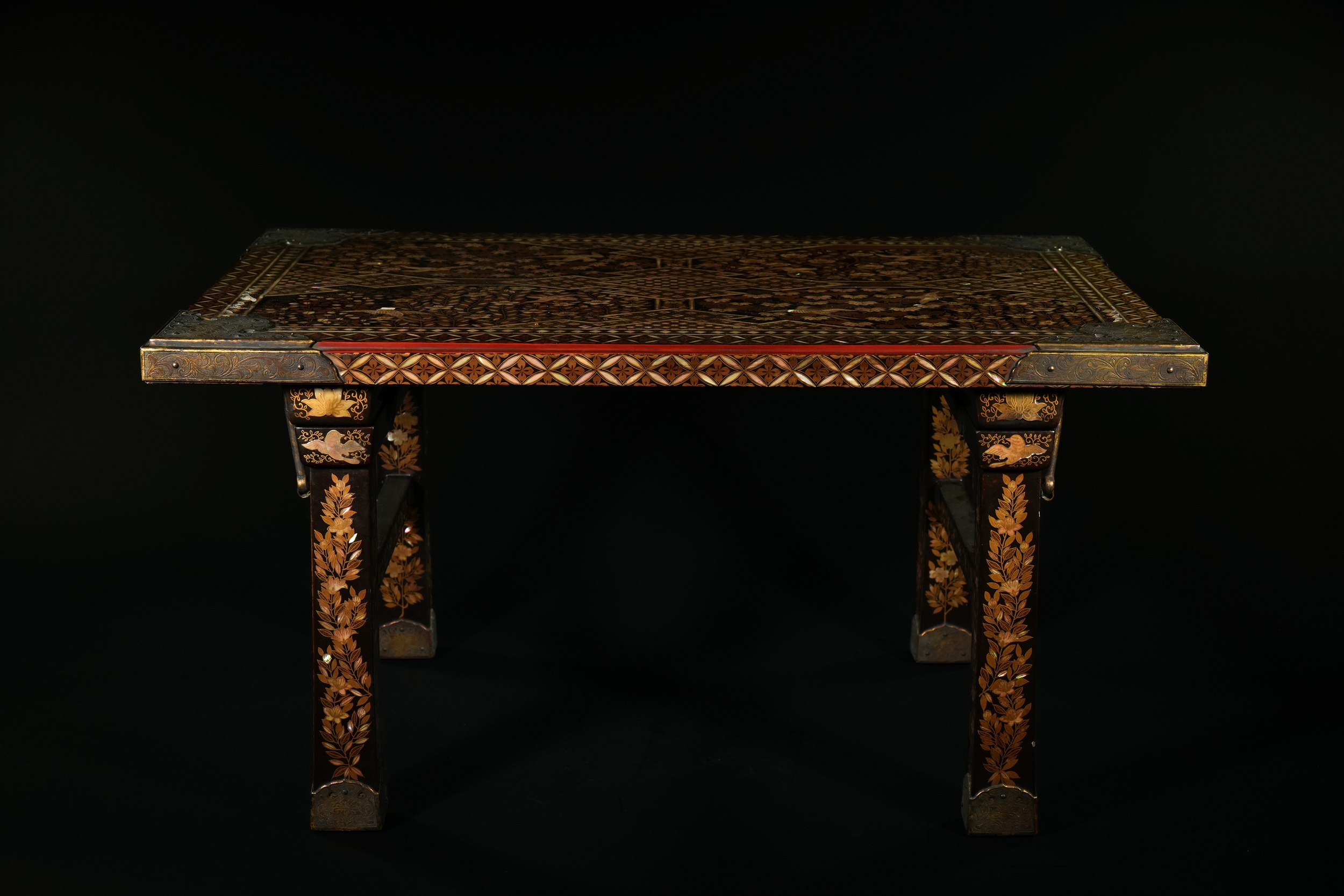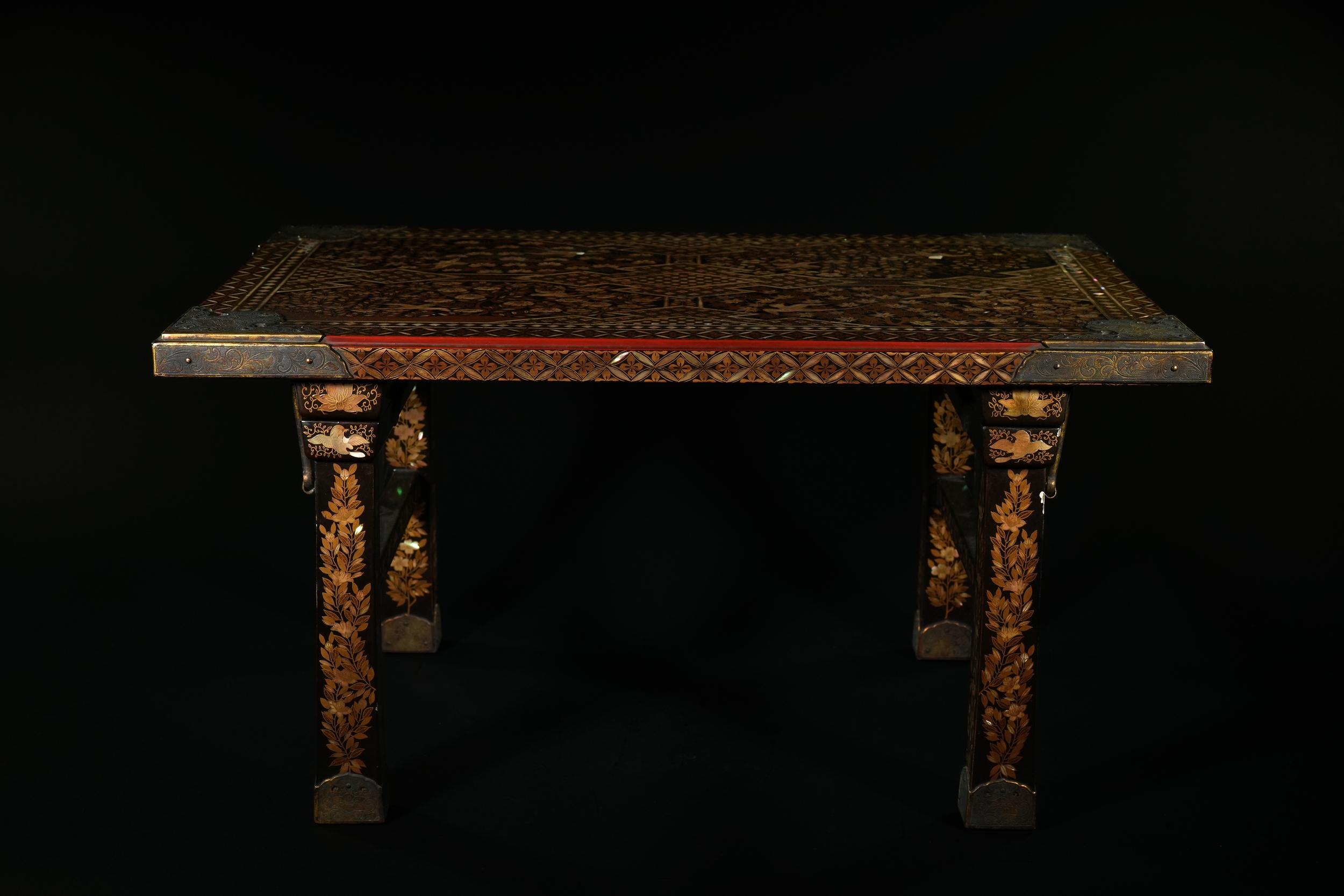 A richly decorated Japanese Namban table, crafted in dark lacquered wood and embellished throughout with intricate mother-of-pearl inlay. The rectangular top displays a dense arrangement of floral motifs, geometric lattice patterns, and stylised birds, all set within multiple borders of repeating diamond and petal forms. Each corner is reinforced with engraved metal mounts featuring scrolling designs and floral cartouches. The table stands on four tapered legs, each adorned with inlaid foliate bands and framed by further gilt and mother-of-pearl ornamentation.