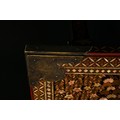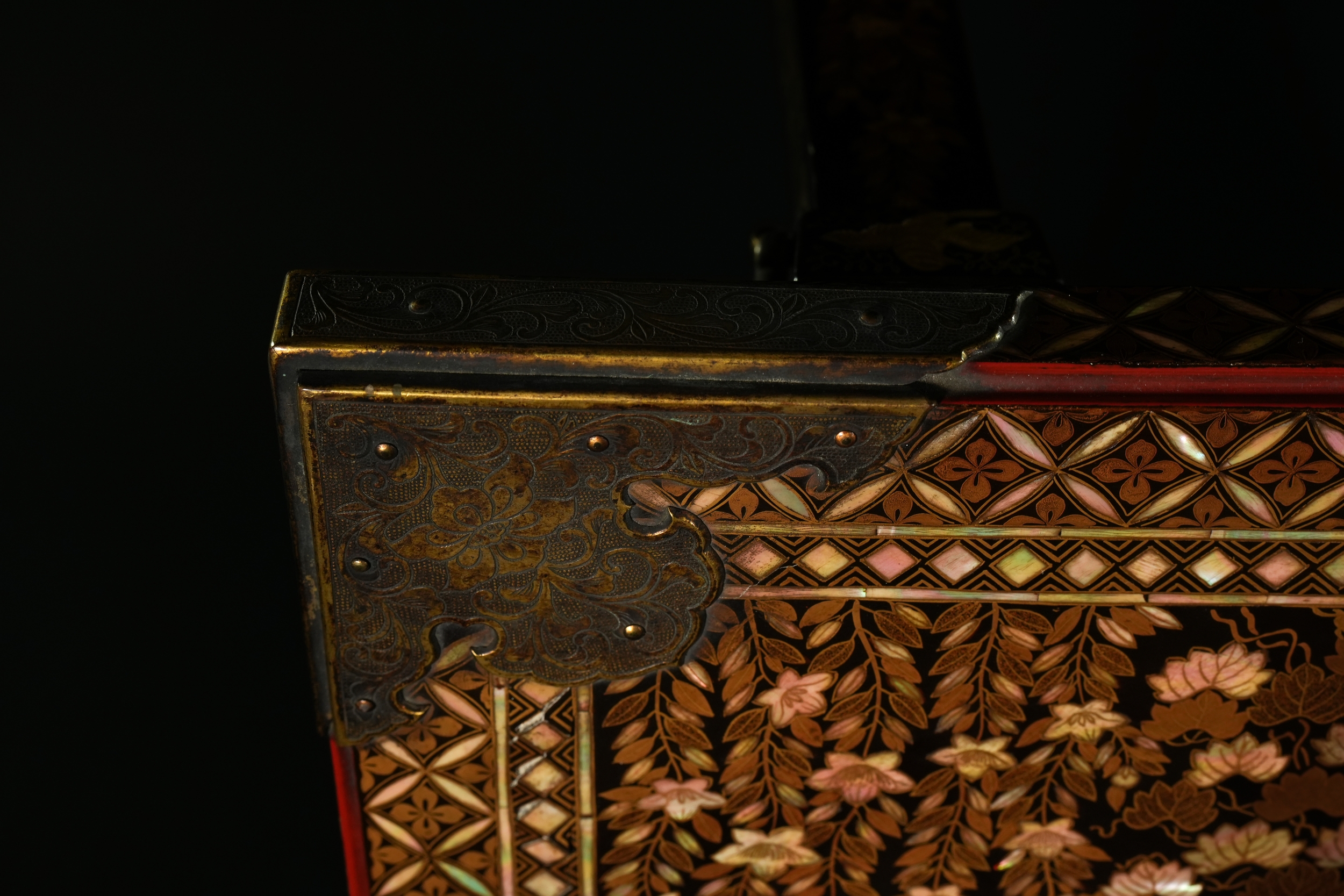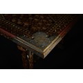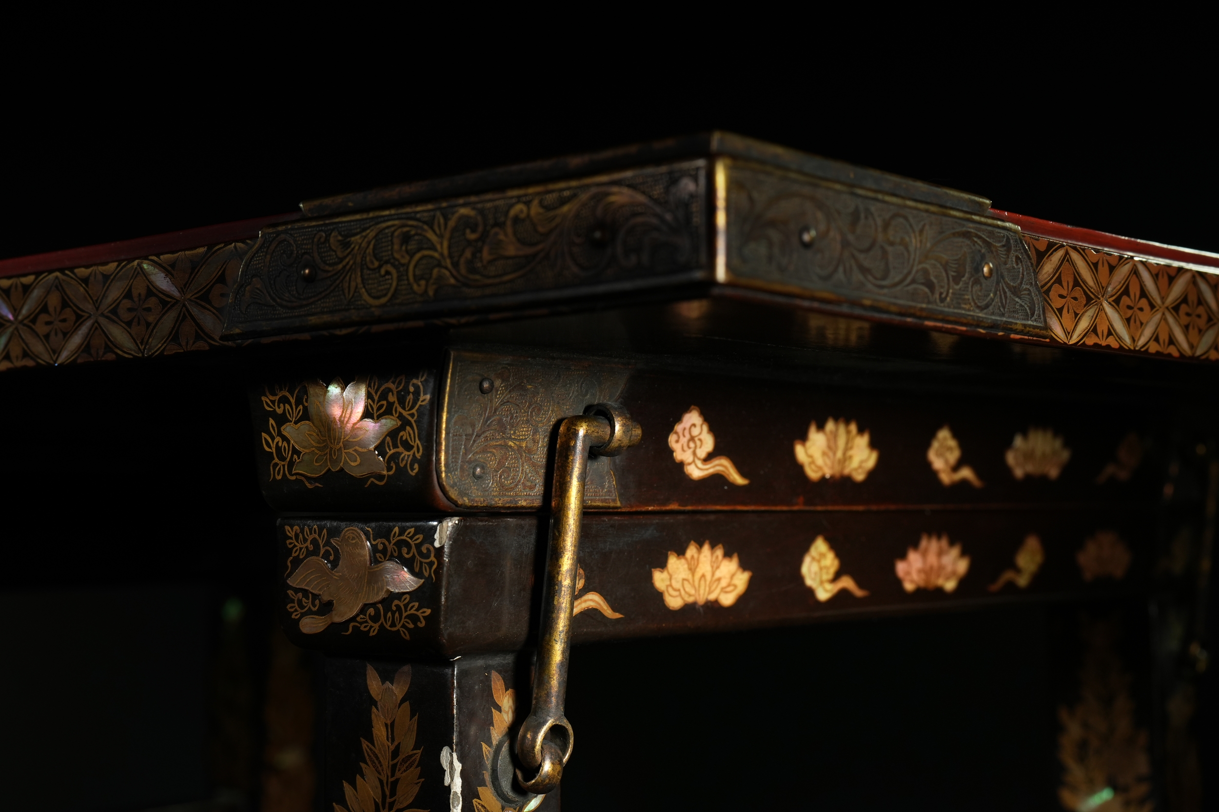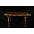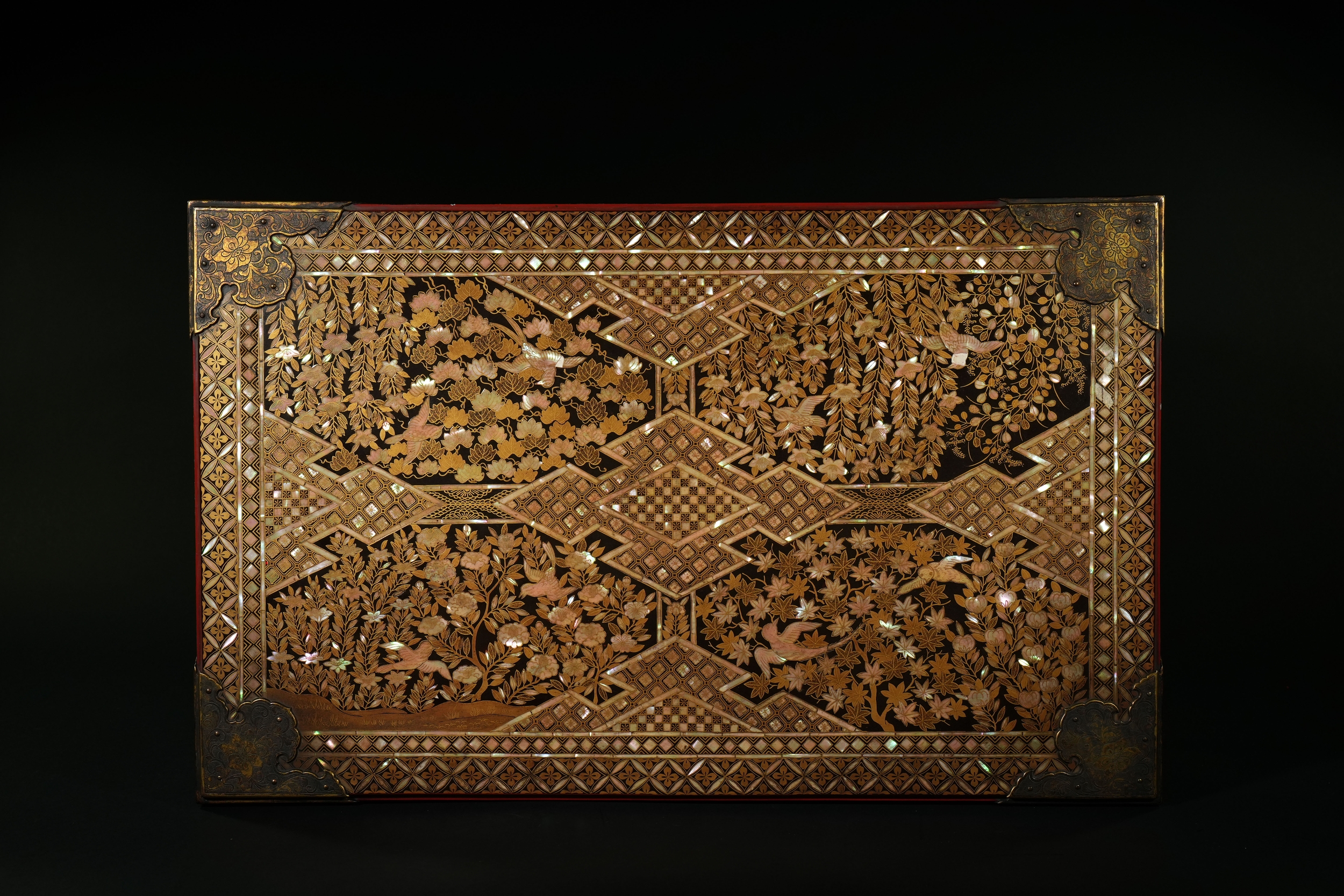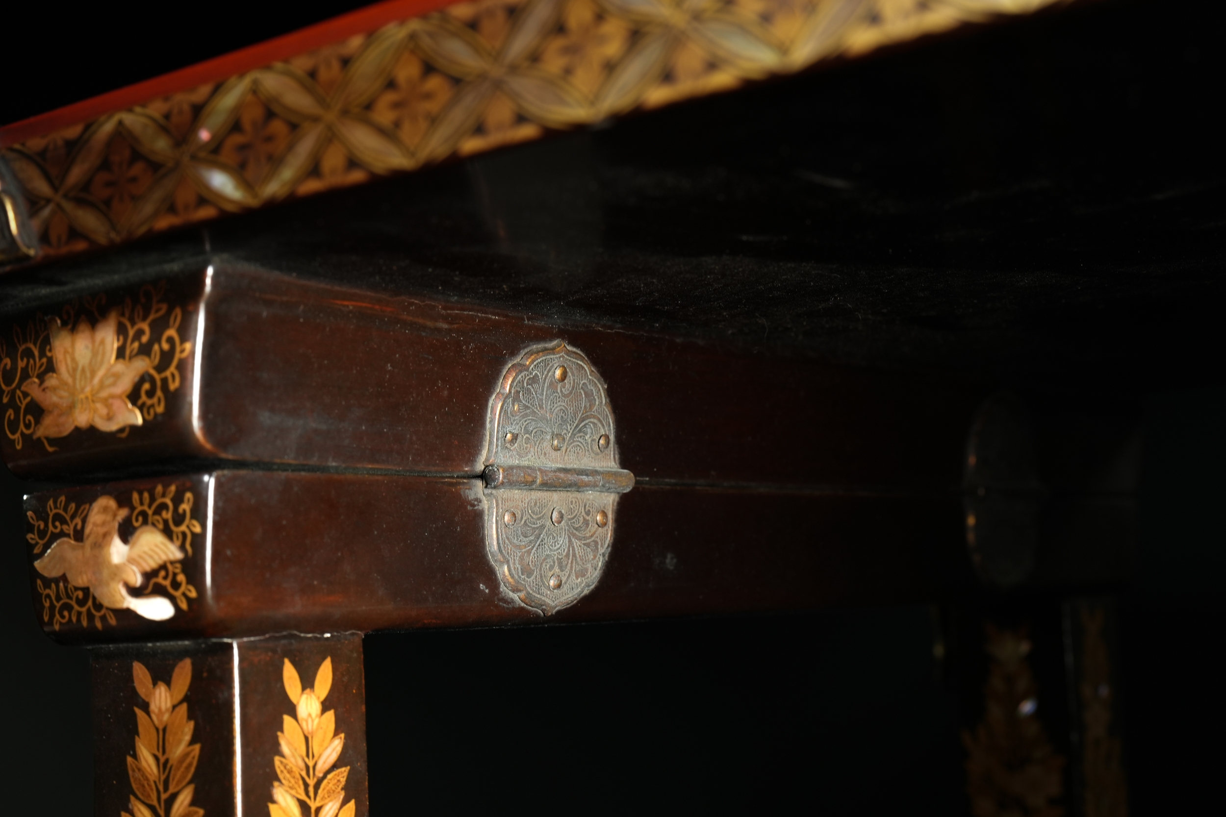 A richly decorated Japanese Namban table, crafted in dark lacquered wood and embellished throughout with intricate mother-of-pearl inlay. The rectangular top displays a dense arrangement of floral motifs, geometric lattice patterns, and stylised birds, all set within multiple borders of repeating diamond and petal forms. Each corner is reinforced with engraved metal mounts featuring scrolling designs and floral cartouches. The table stands on four tapered legs, each adorned with inlaid foliate bands and framed by further gilt and mother-of-pearl ornamentation.