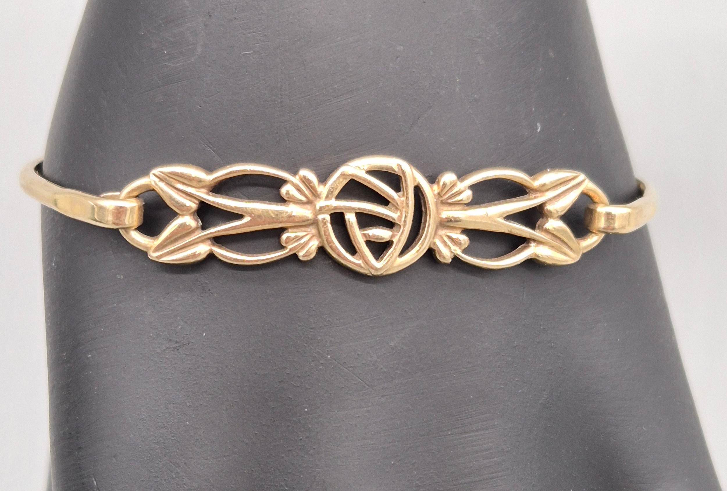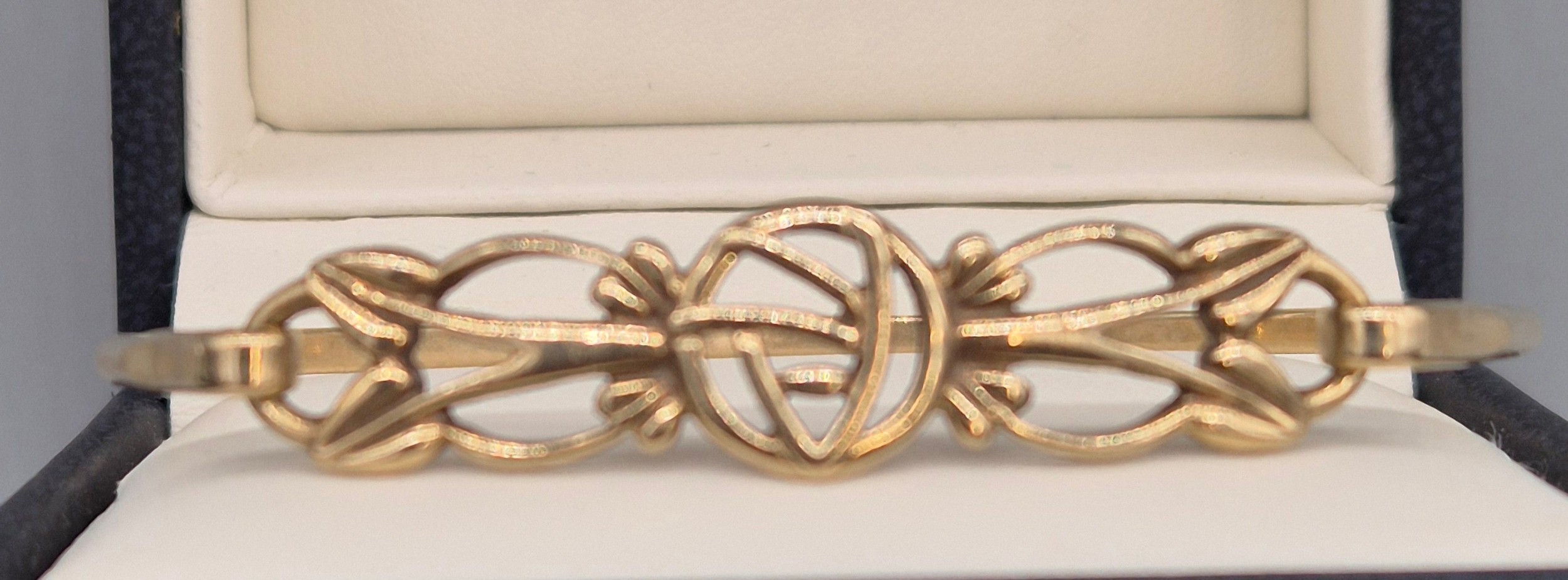 9ct yellow gold Rennie MacKintosh design bangle. 8.18grams.