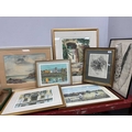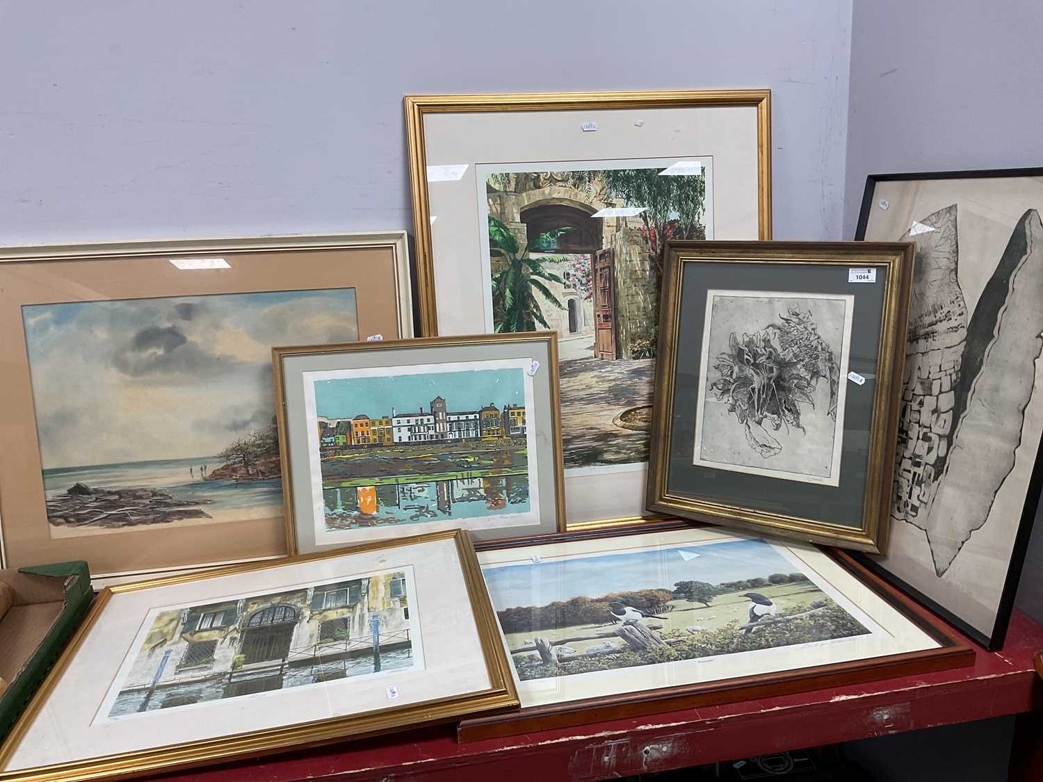 Pencil signed Prints - C. Turner 'The Terrace, Barnes' Image, 25 x 34cm. Michael Kitchen-Hurle, Michael McDonagh Wood and Vernoca Charlesworth together with Maggie Wall, Abstract Print signed and dated 74, framed, overall 61 x 47.5cm. M. J. Annis signed etching, watercolour of remote seascape with three distant anglers (7)
