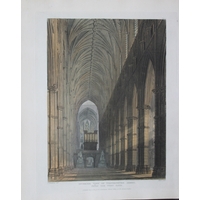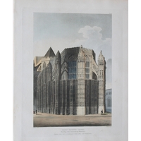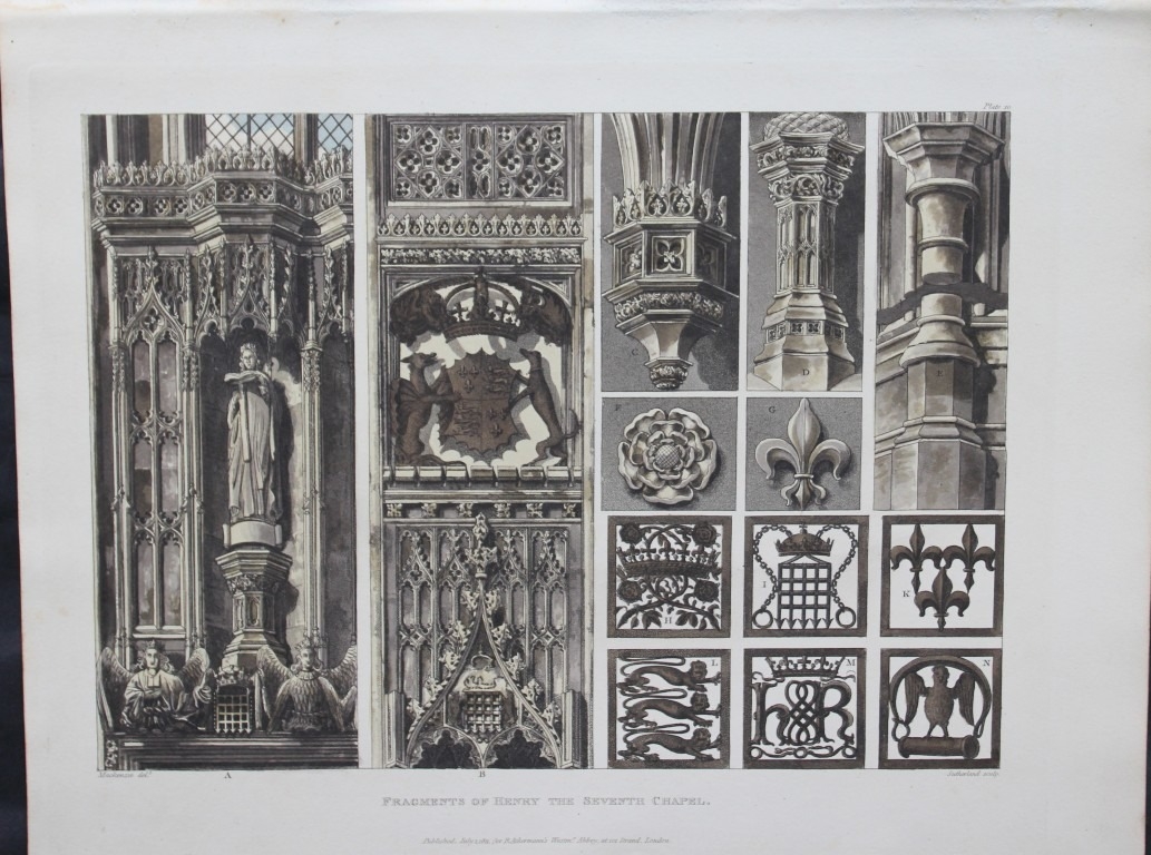 One of the quintessential English Regency colour-plate books. This work is a superbly illustrated study of one of the most interesting edifices in the British Empire. Its remote antiquity, its edificial beauty, the character and variety of its architecture, as well as the ornament it affords to the metropolis, give it a superior distinction. Ackermann employed a variety of artists to bring out in the plates the lustre of stained glass windows and the dim religious light of the chapels.