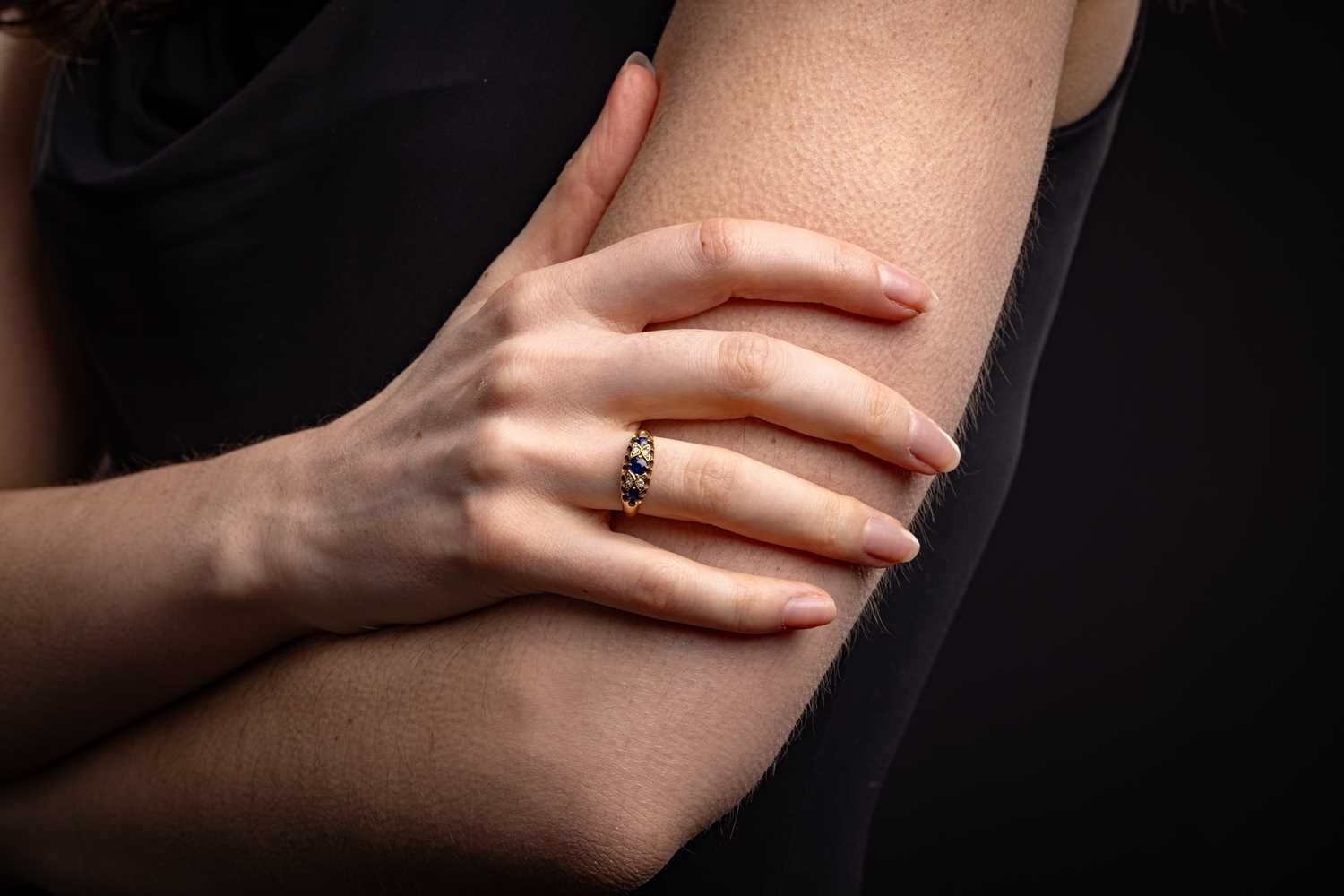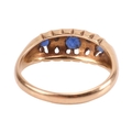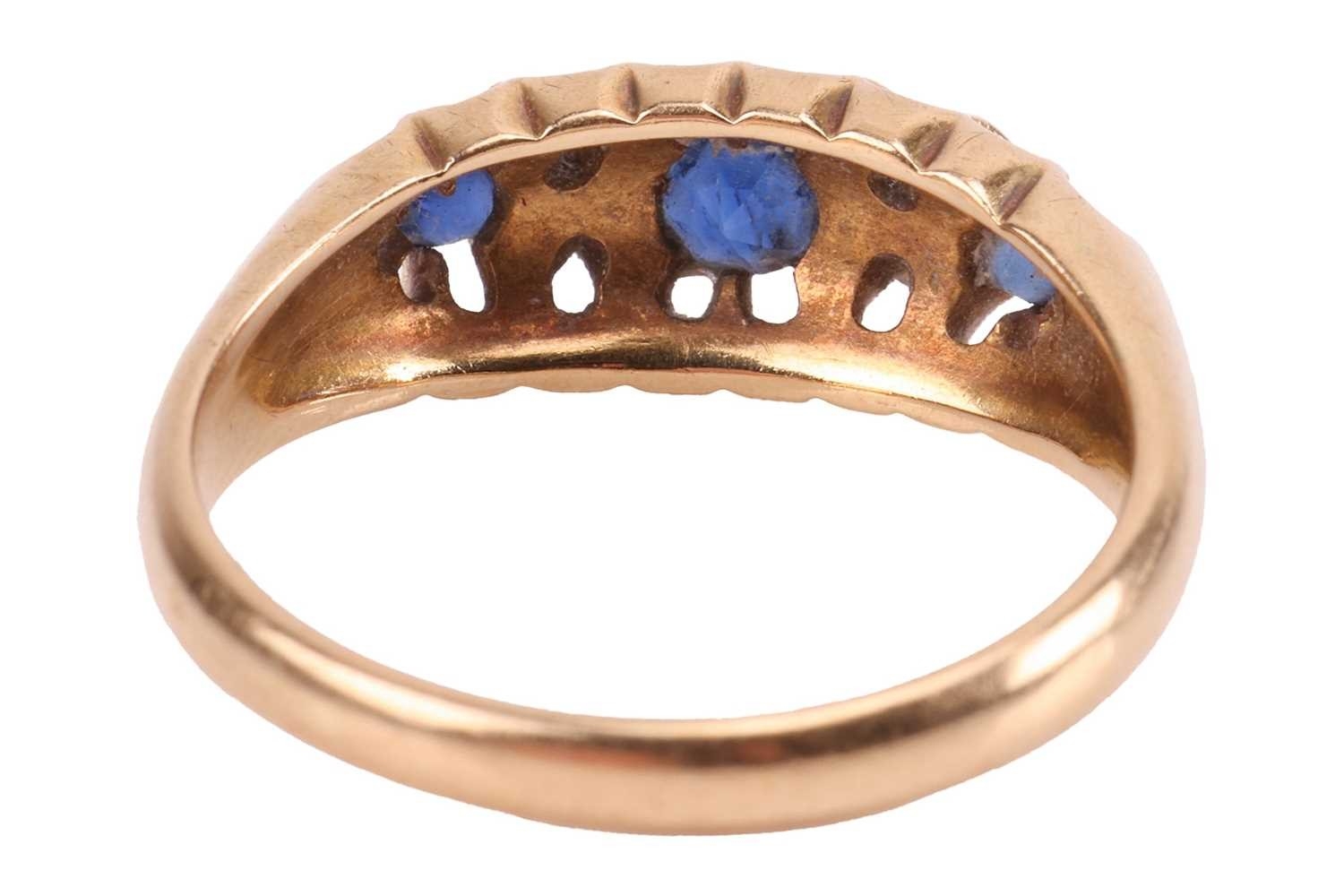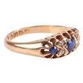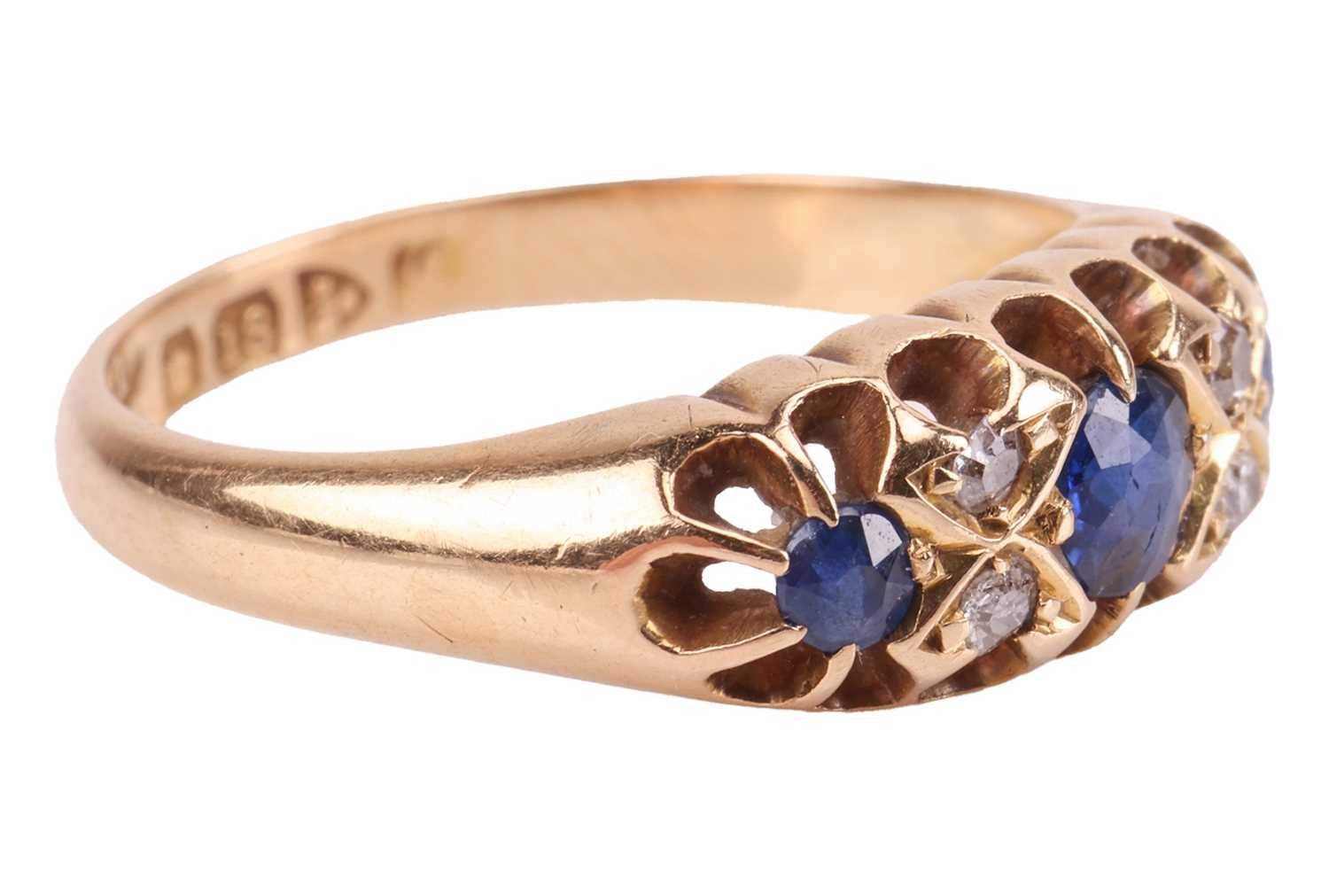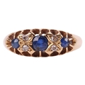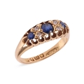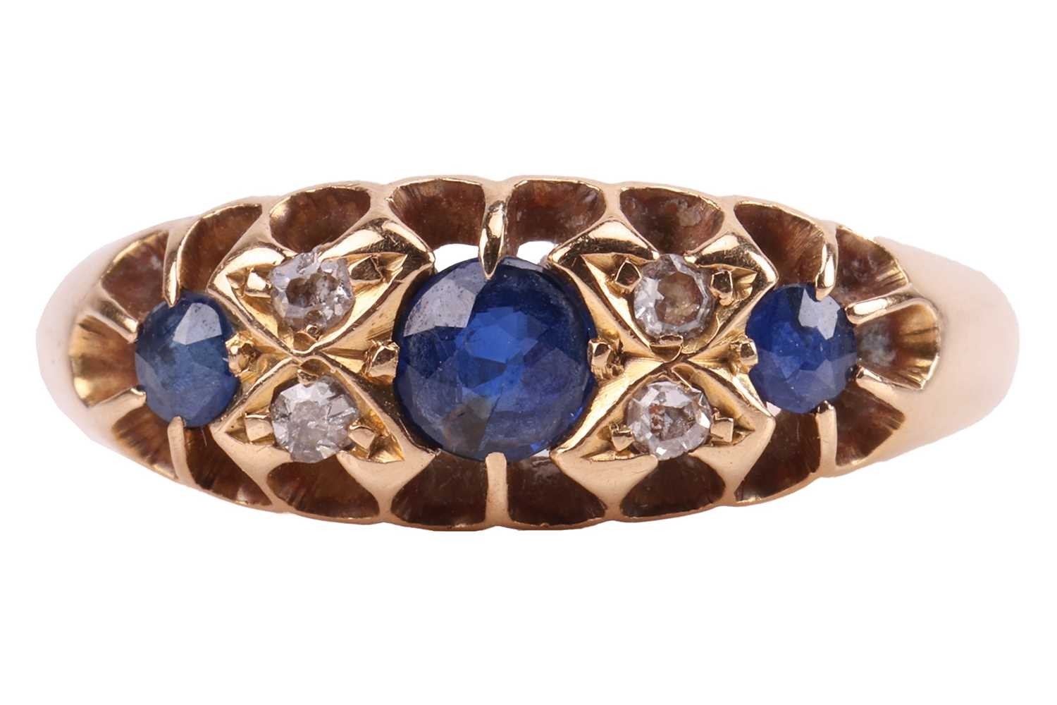 An early 20th-century sapphire and diamond-set half hoop ring, set with three sapphires, interspersed with four single-cut diamonds, to an 18ct yellow gold mount, hallmarked Chester, 1911 (?), marks partially rubbed, size L1/2; 3.7 grams.