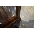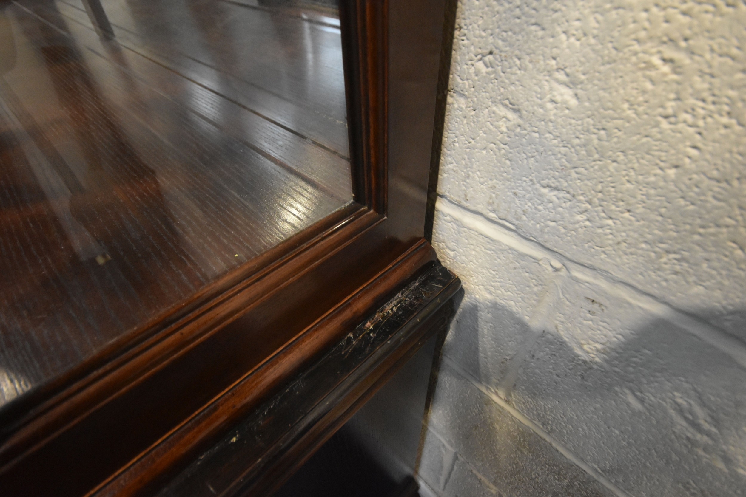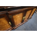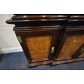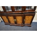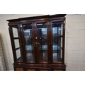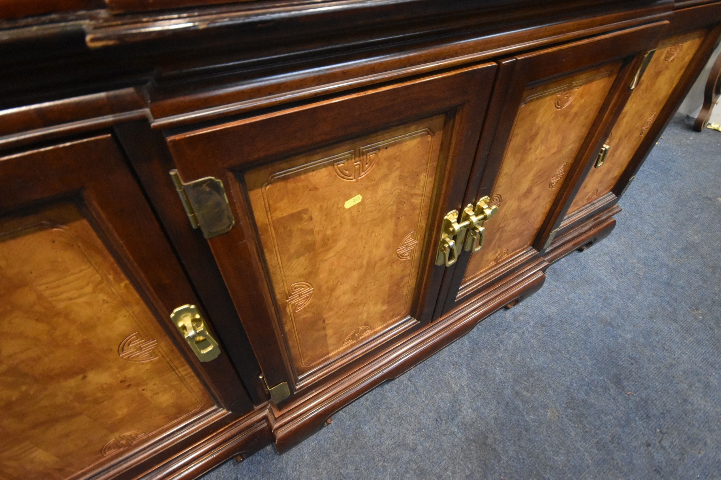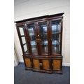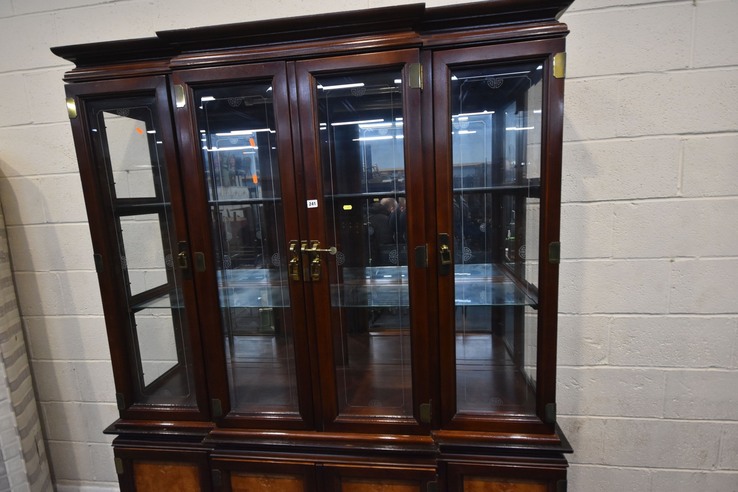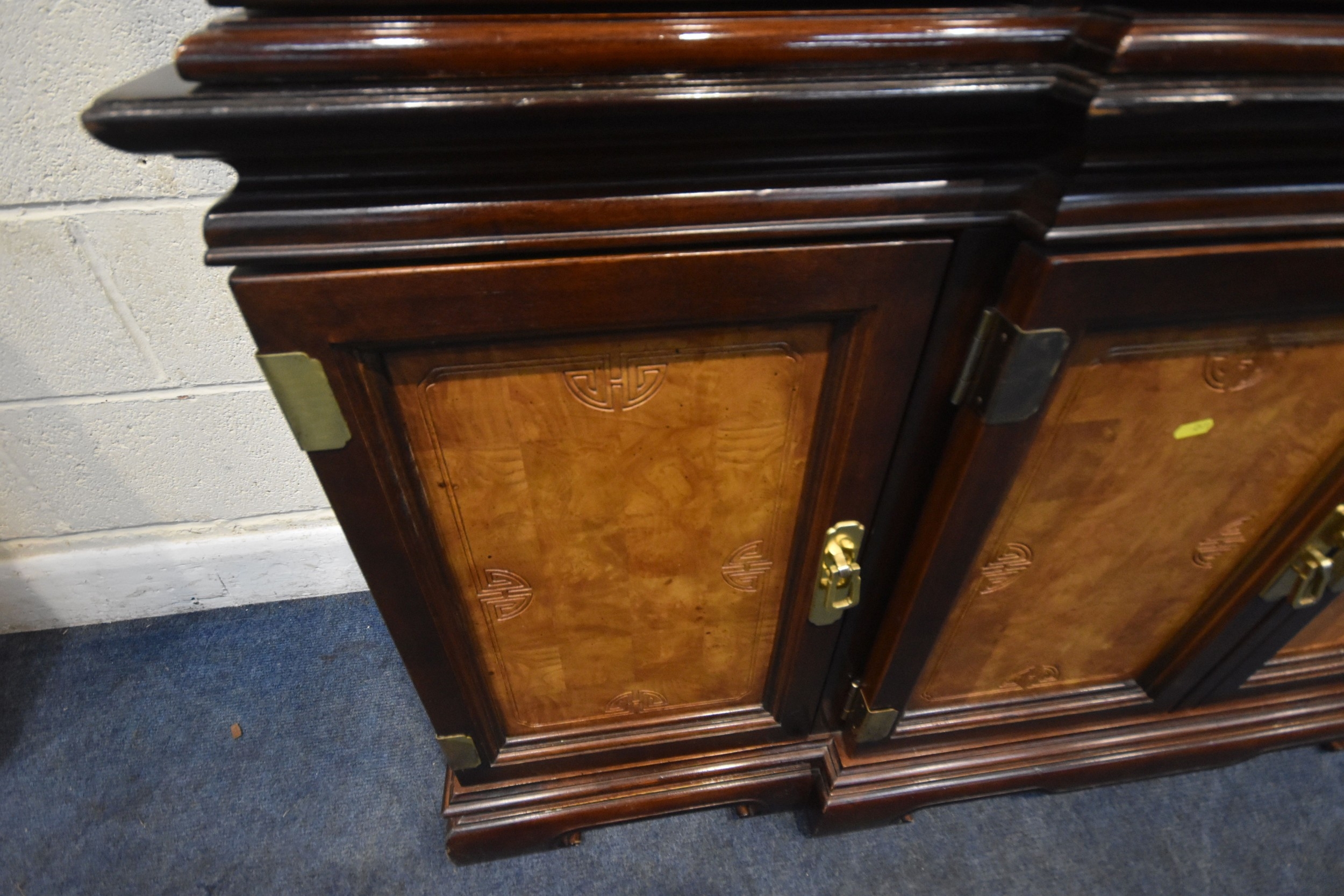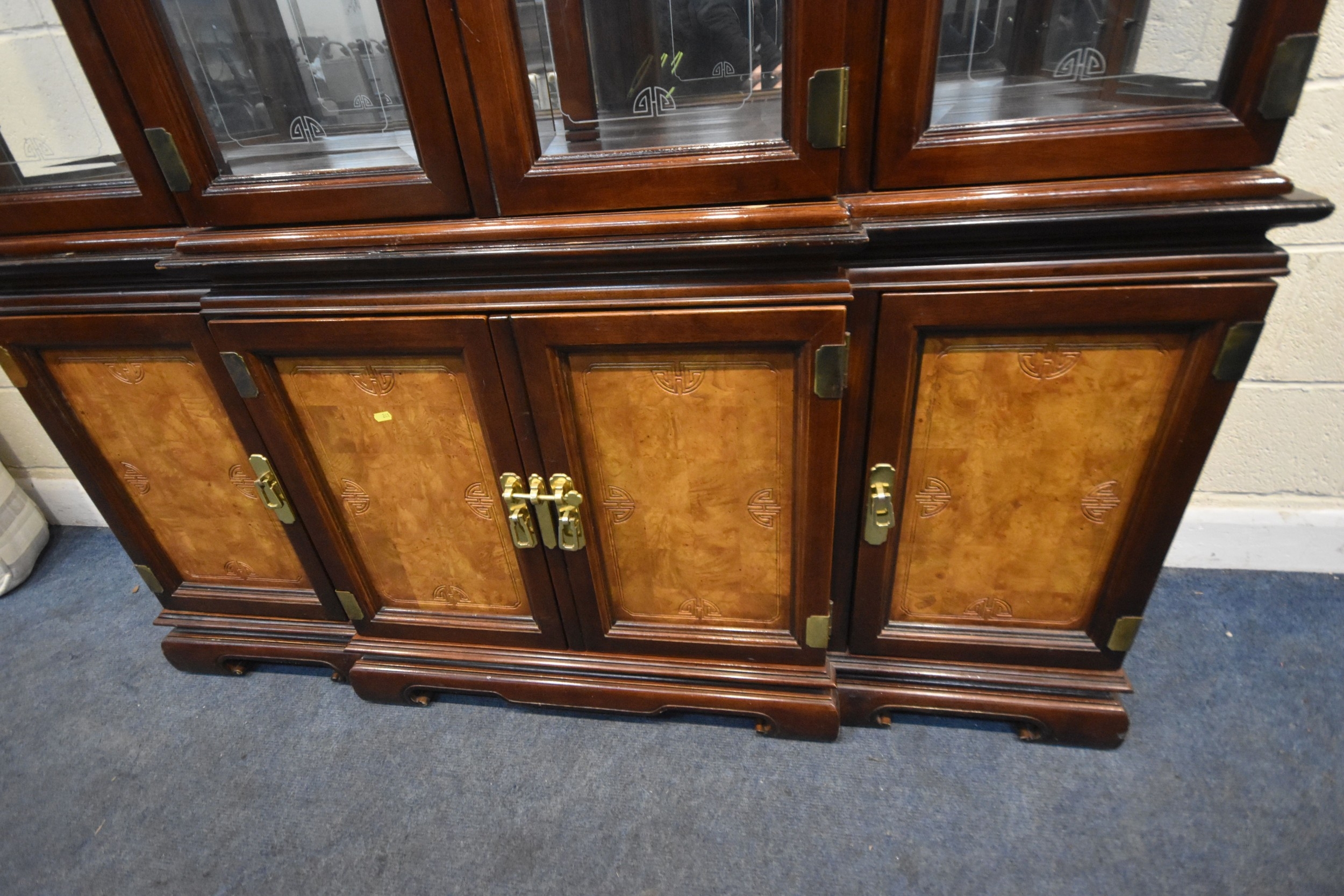 A MODERN HARDWOOD ORIENTAL STYLE BREAKFRONT DISPLAY CABINET, the four bevelled glass doors enclosing two glass shelves and a mirrored back, atop a base with four cupboard doors, width 162cm x depth 45cm x height 209cm x height of base 80cm, condition report: marks, scuffs, scratches where the top sits on the base, other wear and usage (2 sections)