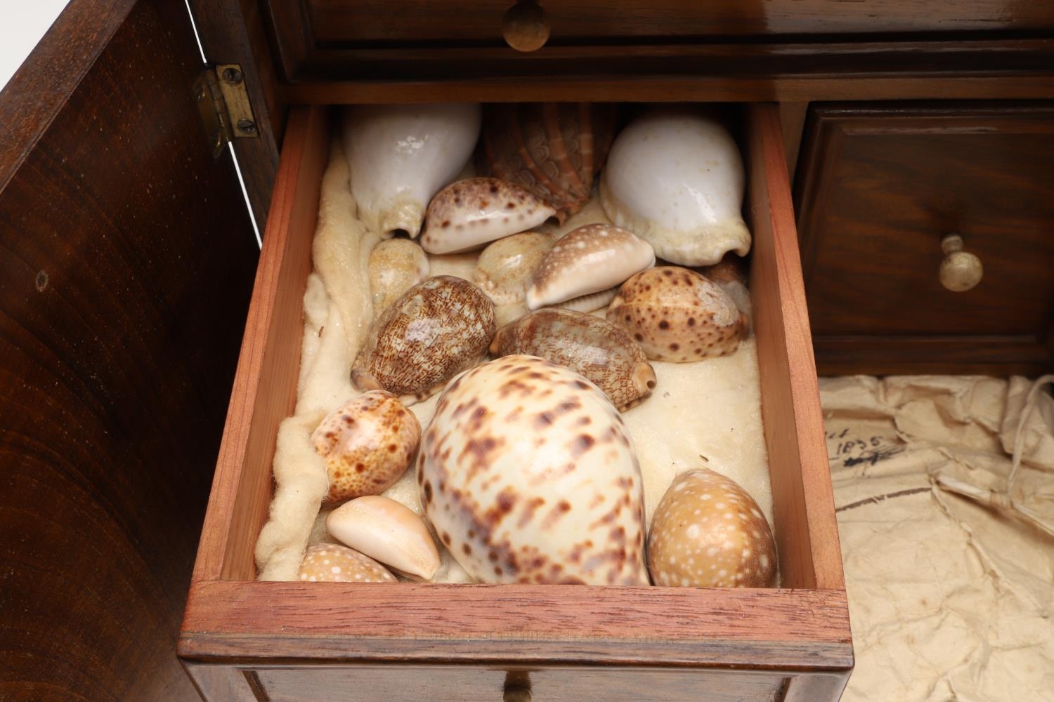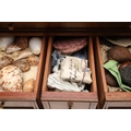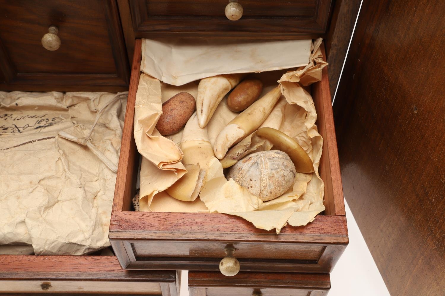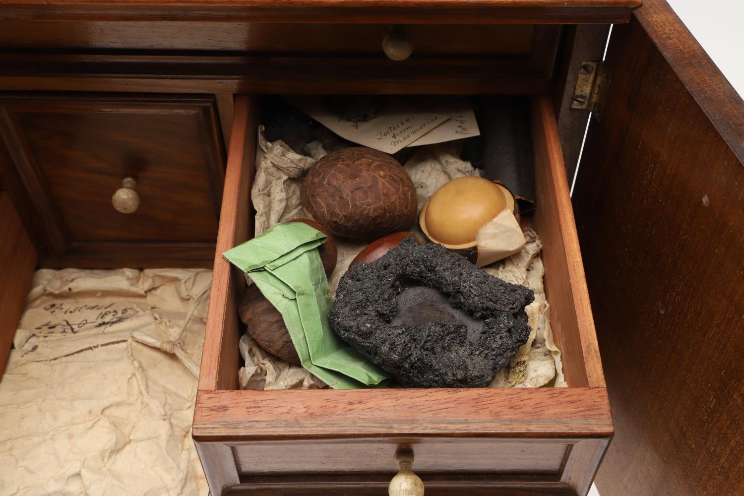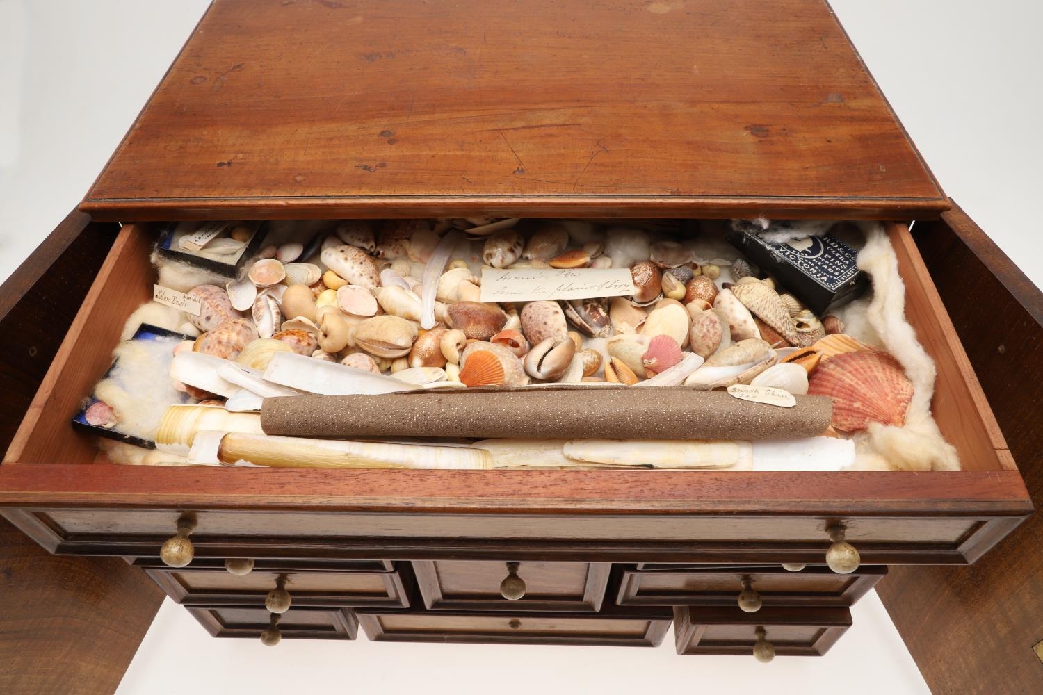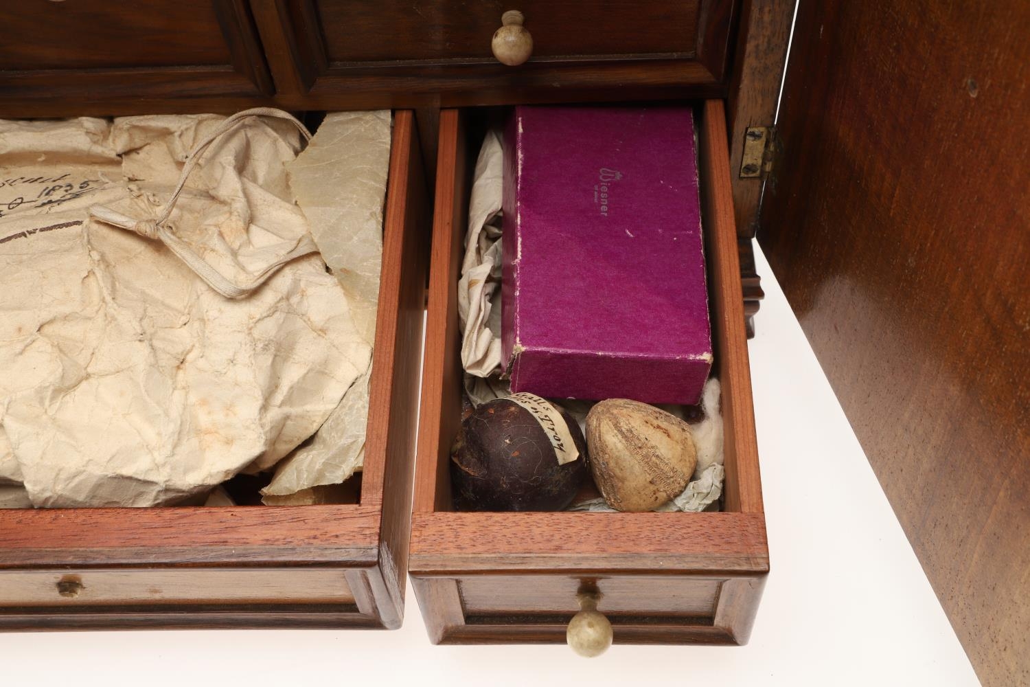 A 19TH CENTURY WALNUT TABLE TOP COLLECTOR'S CABINET. the doors with brass sliding locks enclosing nine drawers with turned bone handles, containing a variety of specimens and other objects, including tree seeds, vegetable ivory palm, lava, coral, shells, animal parts, alligator's egg, an iridescent beetle, fossils, wax seals in turned wood containers, pieces of Civil War (?) soldier's hardtack (with arrow impression), some items in hand-written paper scraps/envelopes, height 29cm, width 43cm, depth 27cm.