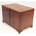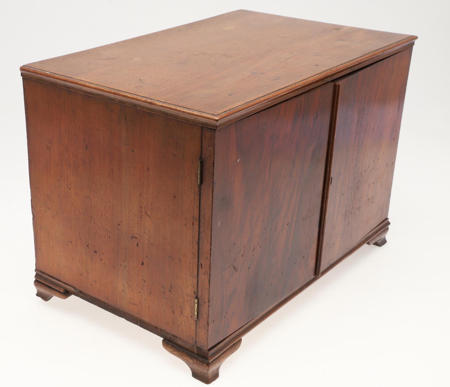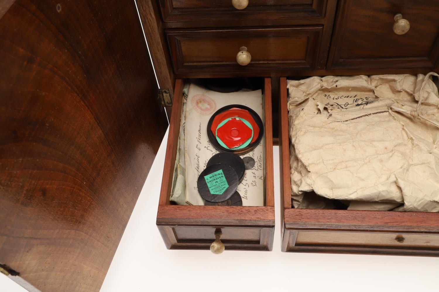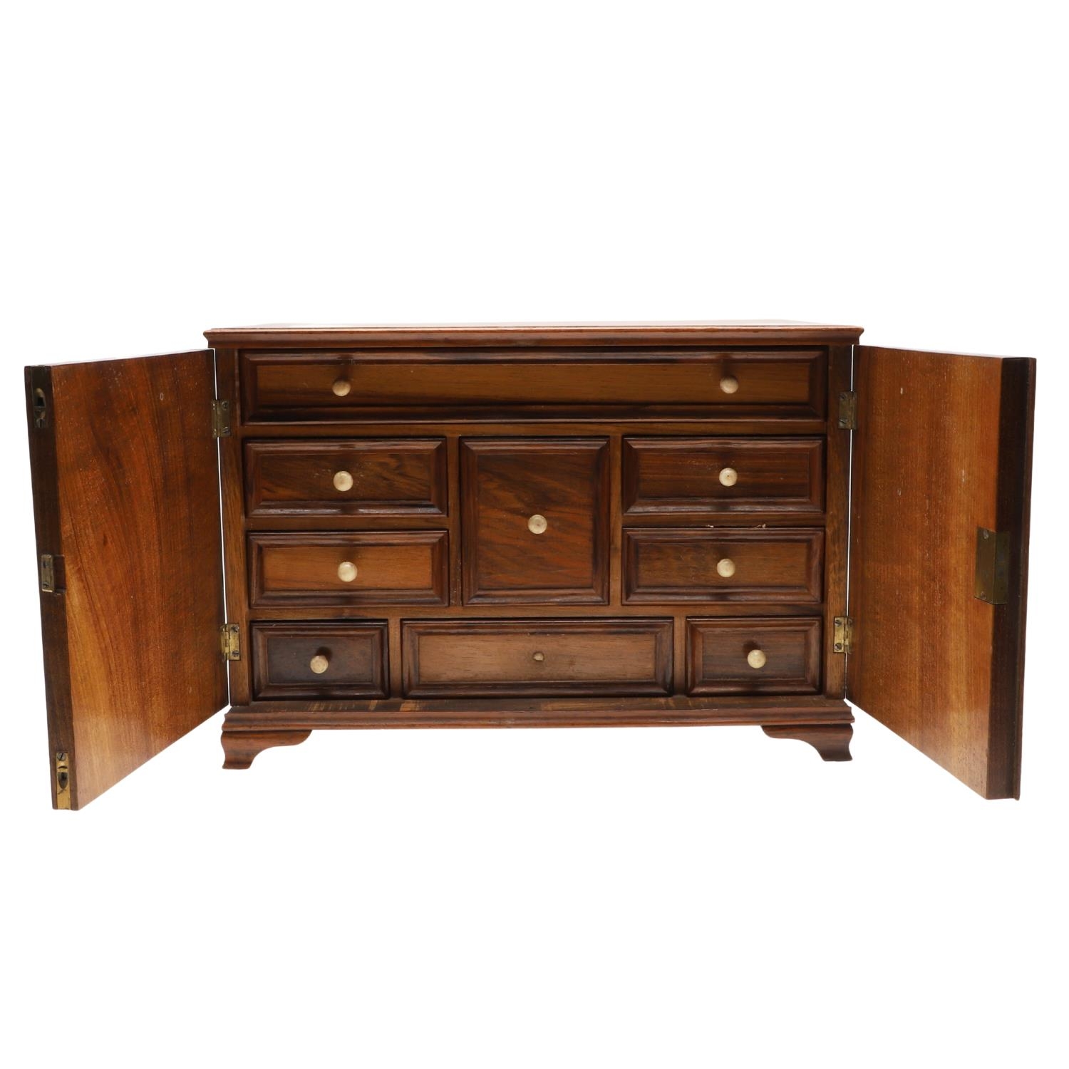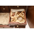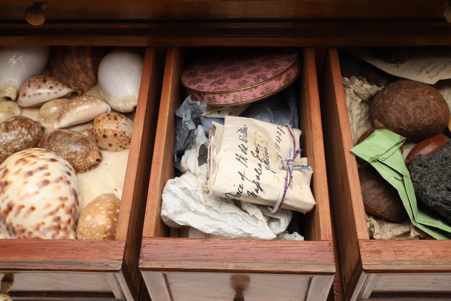 A 19TH CENTURY WALNUT TABLE TOP COLLECTOR'S CABINET. the doors with brass sliding locks enclosing nine drawers with turned bone handles, containing a variety of specimens and other objects, including tree seeds, vegetable ivory palm, lava, coral, shells, animal parts, alligator's egg, an iridescent beetle, fossils, wax seals in turned wood containers, pieces of Civil War (?) soldier's hardtack (with arrow impression), some items in hand-written paper scraps/envelopes, height 29cm, width 43cm, depth 27cm.
